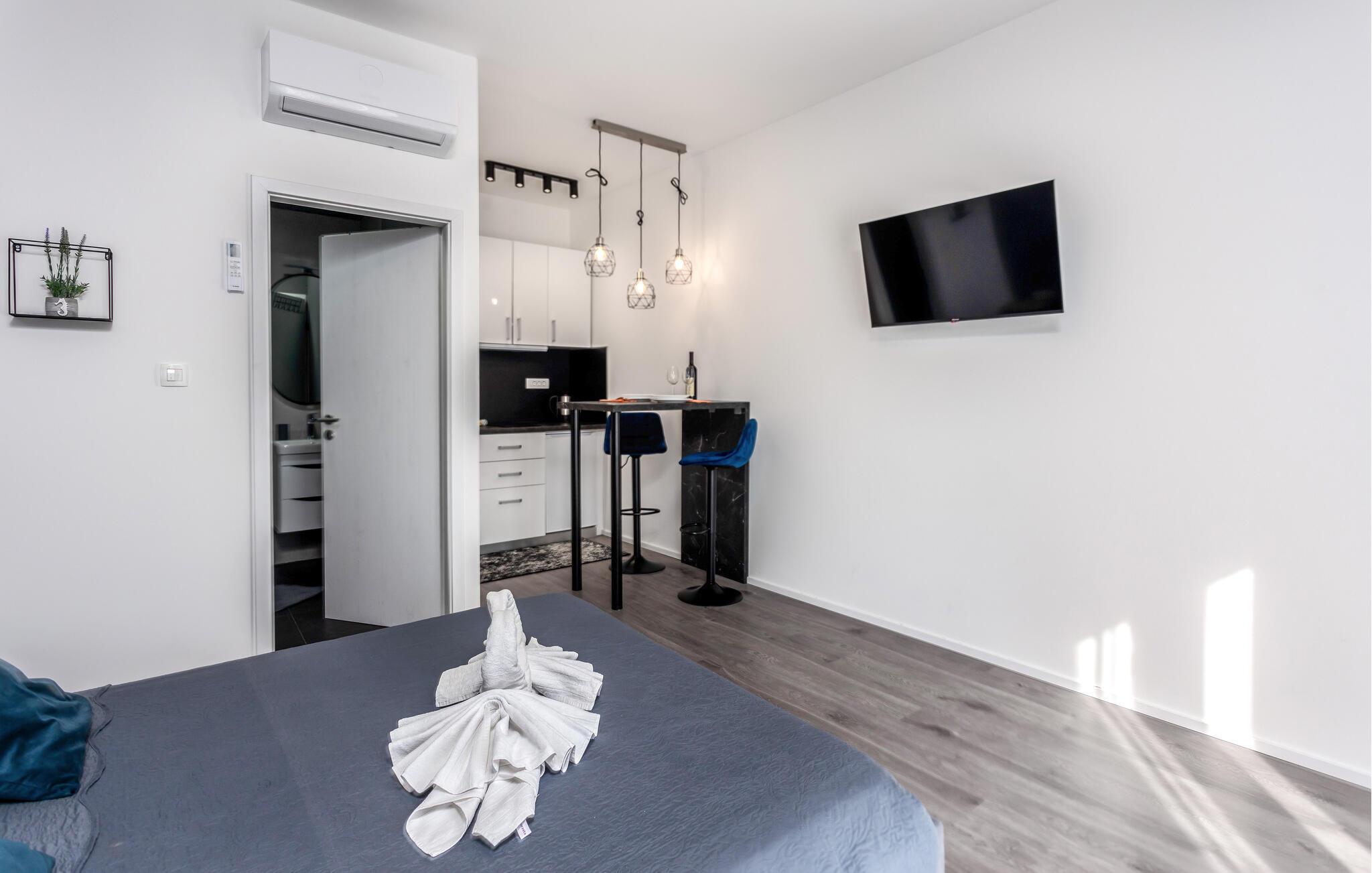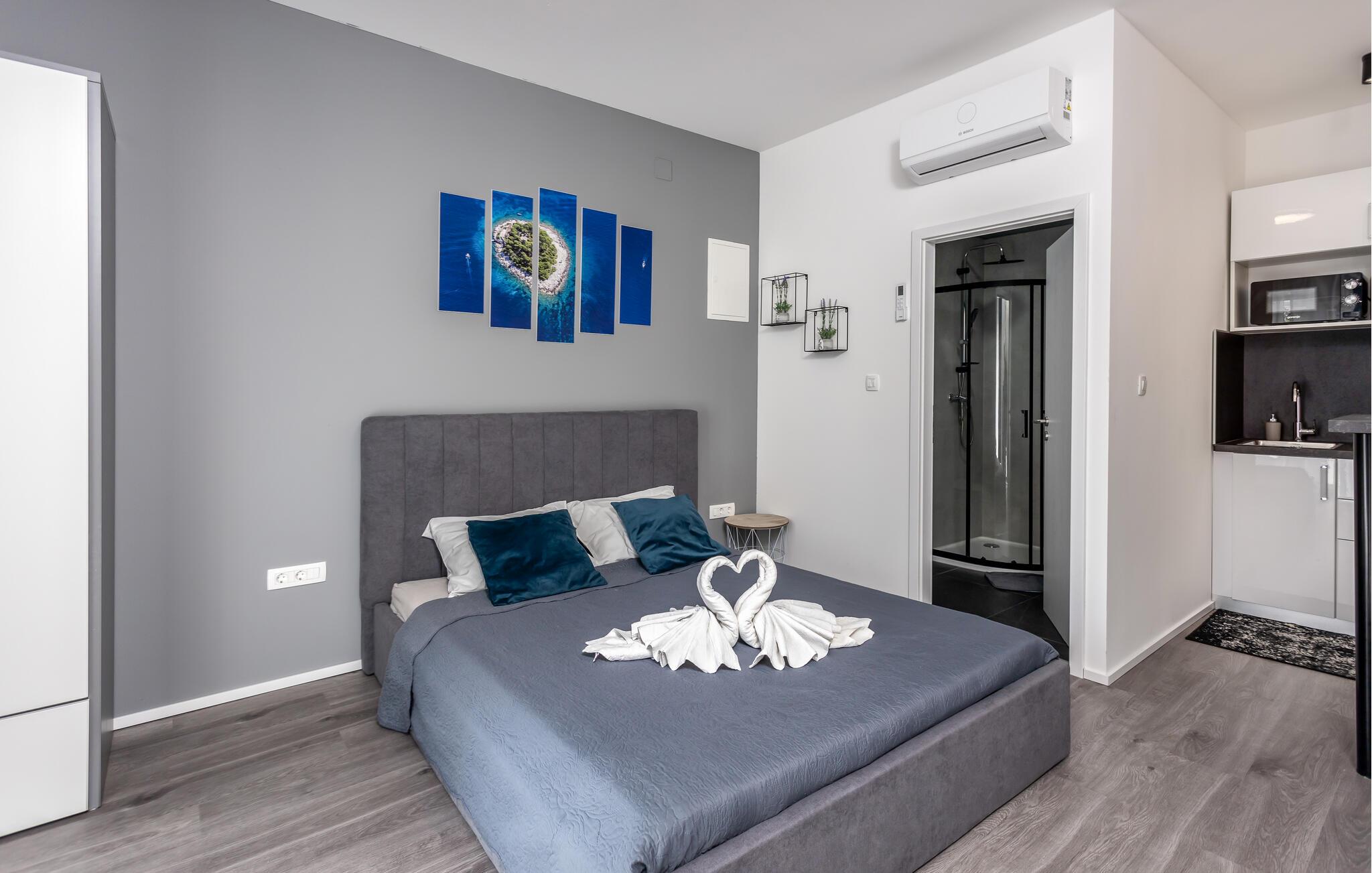 Tag en pause fra hverdagens hektik og rejs til Kroatiens vestkyst, hvor I som par får en vidunderlig base i denne charmerende lejlighed. Den er ganske lille, men med sin gode, kompakte indretning og moderne faciliteter får I alt, I behøver for at kunne slappe af efter dagens udflugter og tage jer god tid til hinanden. Begynd dagen med et godt måltid mad i tekøkkenet, inden I går ned i den fælles pool for dagens første dyp og bagefter ligger jer til tørre i en havestol i solen.