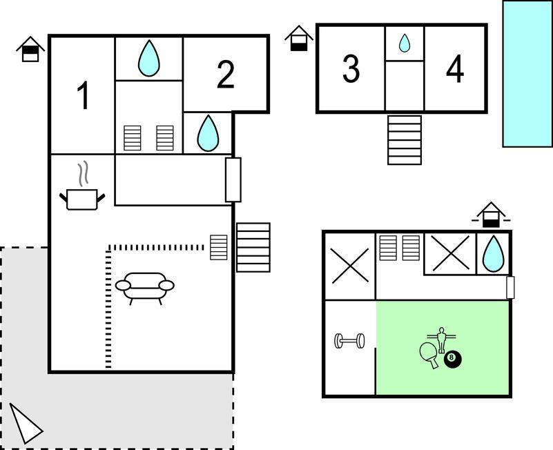 Dette feriehus i den rolige by Dramlja er velegnet til en gruppe af venner eller flere familier der gerne vil holde ferie sammen. Det er enkelt indrettet og med adgang til terrassen fra den store stue. Der er to soveværelser i stueplan mens der er yderligere to soveværelser på en mellemetage. Desuden er der fire sovepladser på hemsen, som I kommer op til ad en stejl vindeltrappe fra stuen. Her er laveste loftshøjde ca. 120 cm da her er skrå vægge.
