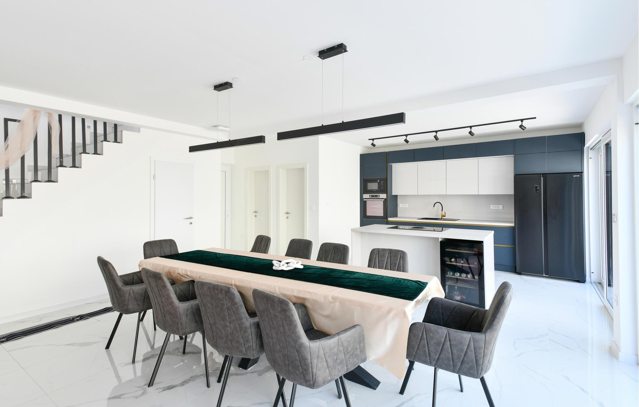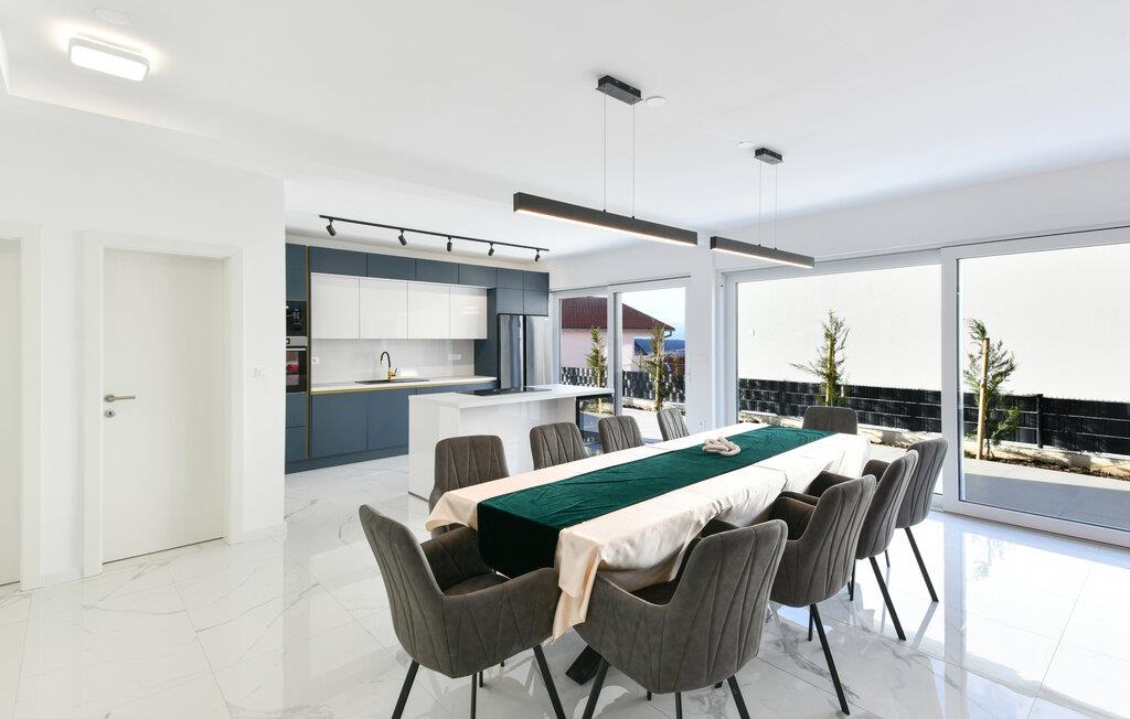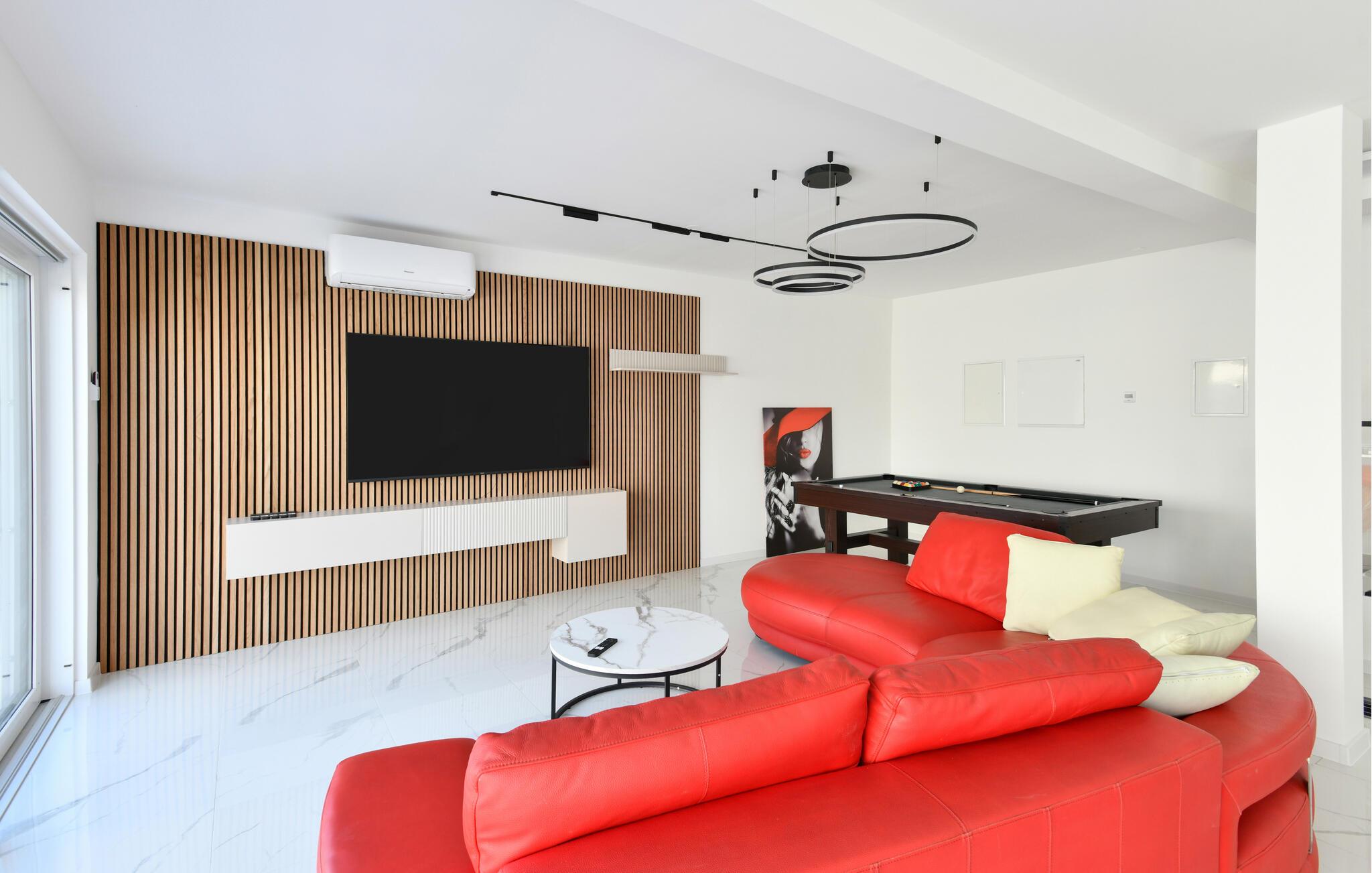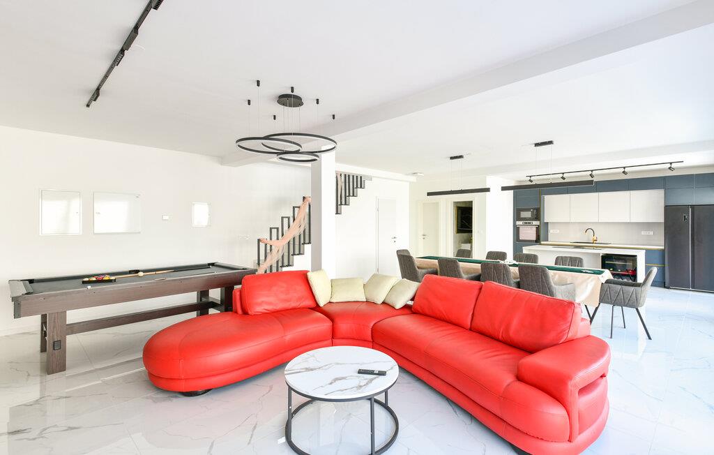 Denne moderne og rummelige villa har et minimalistisk design af høj kvalitet og tilbyder rigelig plads til en større familie eller en gruppe venner, der kan nyde de mange faciliteter. Tilbered kulinariske lækkerier, find sammen til stilfulde måltider, og om aftenen kan I slå jer ned i den elegante sofa til en fængslende film, spille et spil billard eller slappe af i den indendørs pool.