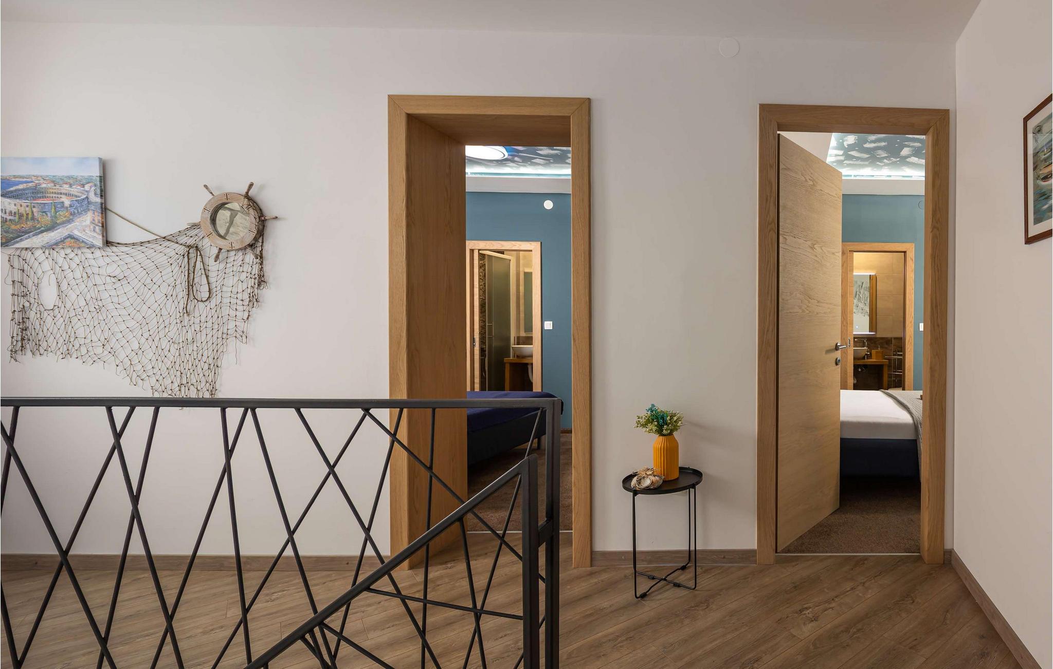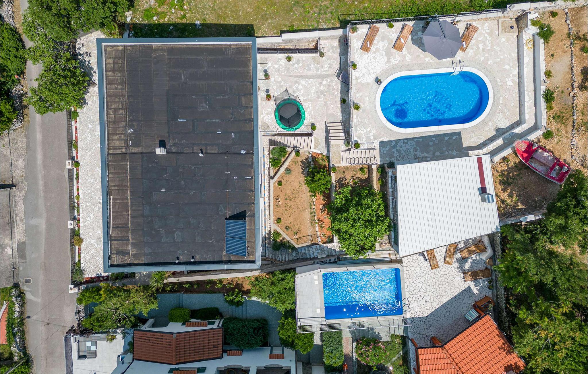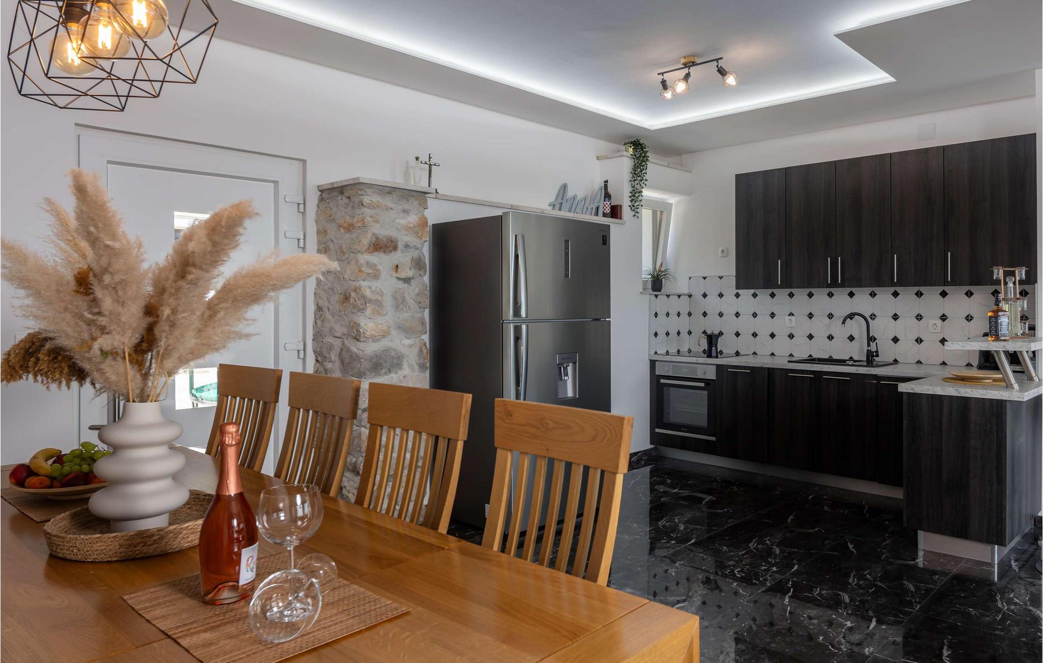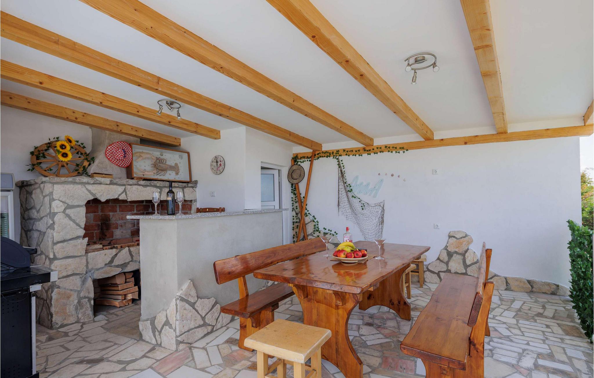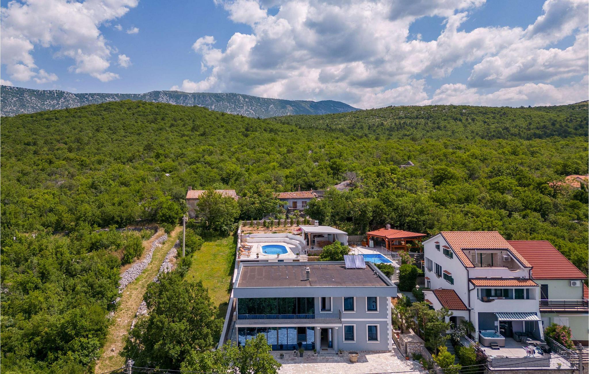 Beliggende i Jordanovo, kun 9 km fra Crikvenica, er Villa Ancora kendt som et sted for gæstfrie værter og smuk uberørt natur. Her finder du en fyrreskov og en kyst med romantiske bugter og strande, hvor du kan udforske havets dybder og nyde med familie og venner. Denne villa, bygget i 2022, er en kombination af moderne og rustik konstruktion og tilbyder sine gæster 350 m2 boligareal. Det er fuldt airconditioneret og kan rumme maksimalt 10, optimalt 8 personer. Du vil bo komfortabelt i 5 soveværelser (200x165), hvoraf tre er på øverste etage, og til børnene er der en tremmeseng, der også er tilgængelig! Villaen har også 6 badeværelser med bruser og 2 ekstra toiletter. På øverste etage er der også en stue med en tre-personers, to lænestole, to taburetter, to sofaborde og et fjernsyn. Ved siden af stuen er der en spisestue med spisebord og et køkken udstyret med alt hvad du behøver for at tilberede måltider til familie eller venner. I stueetagen er de to andre værelser, wellness med sauna, spabad og fitnessudstyr, som især vil glæde fans af aktiv ferie. Der er selvfølgelig også et rum til leg og hygge, hvor børn og voksne kan prøve kræfter med dart, billard eller bordfodbold. Uden for villaen, i gården ved siden af poolen, er der også en trampolin. Ved siden af villaen er resten af faciliteterne, såsom en 32m2 swimmingpool med en dybde på 1,5 meter, 6 liggestole til solbadning og afslapning og en udendørs kul-, træ- eller gasgrill. Der er også to overdækkede udendørs spiseborde, perfekt til aftensammenkomster over et glas vin. På terrassen kan du nyde udsigten over havet og omgivelserne og forkæle dig med charmen ved Villa Ancora. Gården er indhegnet og byder på 4 private parkeringspladser, mens der er yderligere to udenfor. Du vil nyde udsigten over smukke strande, duften af ren luft, fyrretræer og middelhavsplanter. Du vil lære om skikke ved adskillige begivenheder, forkæle dine smagsløg med at smage lokale specialiteter fra berømte lokale restauratører og nyde historierne om de fiskere, der vender tilbage fra havet hver morgen med fulde net. Velkommen til Villa Ancora! Kæledyr er tilladt på denne ejendom efter ejerens skøn eller mod et gebyr.