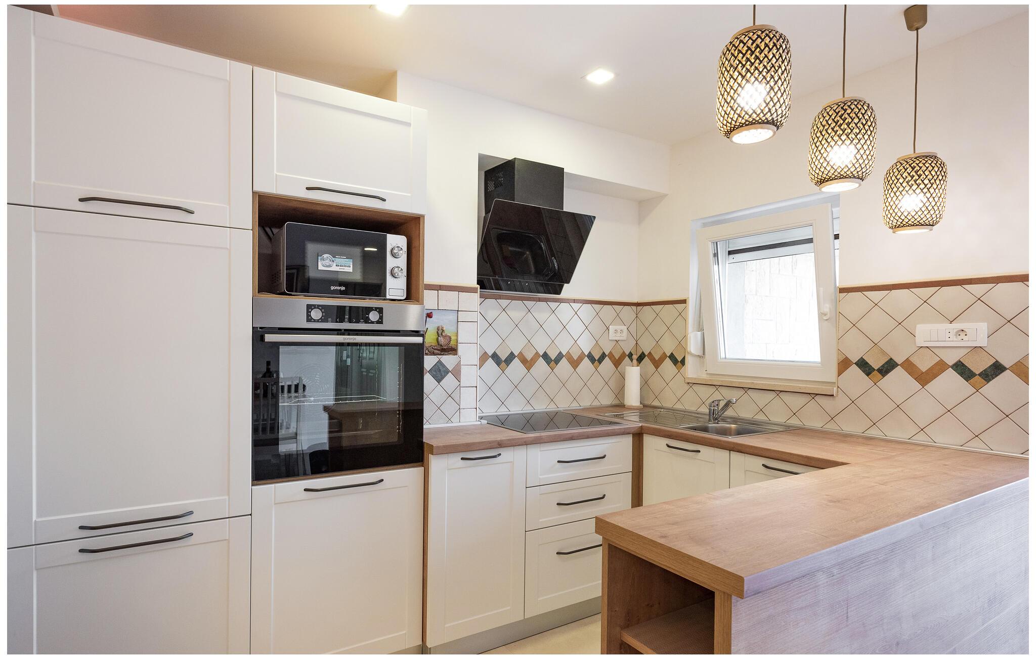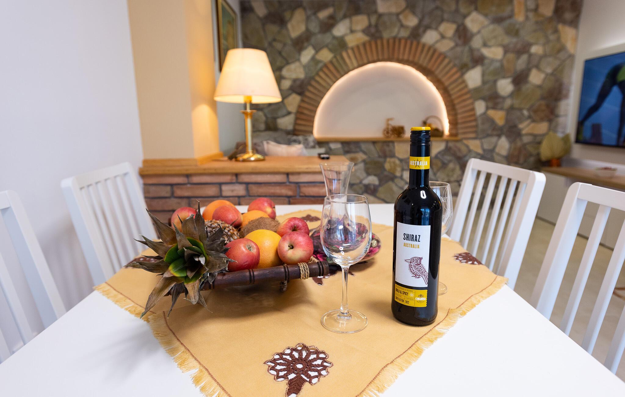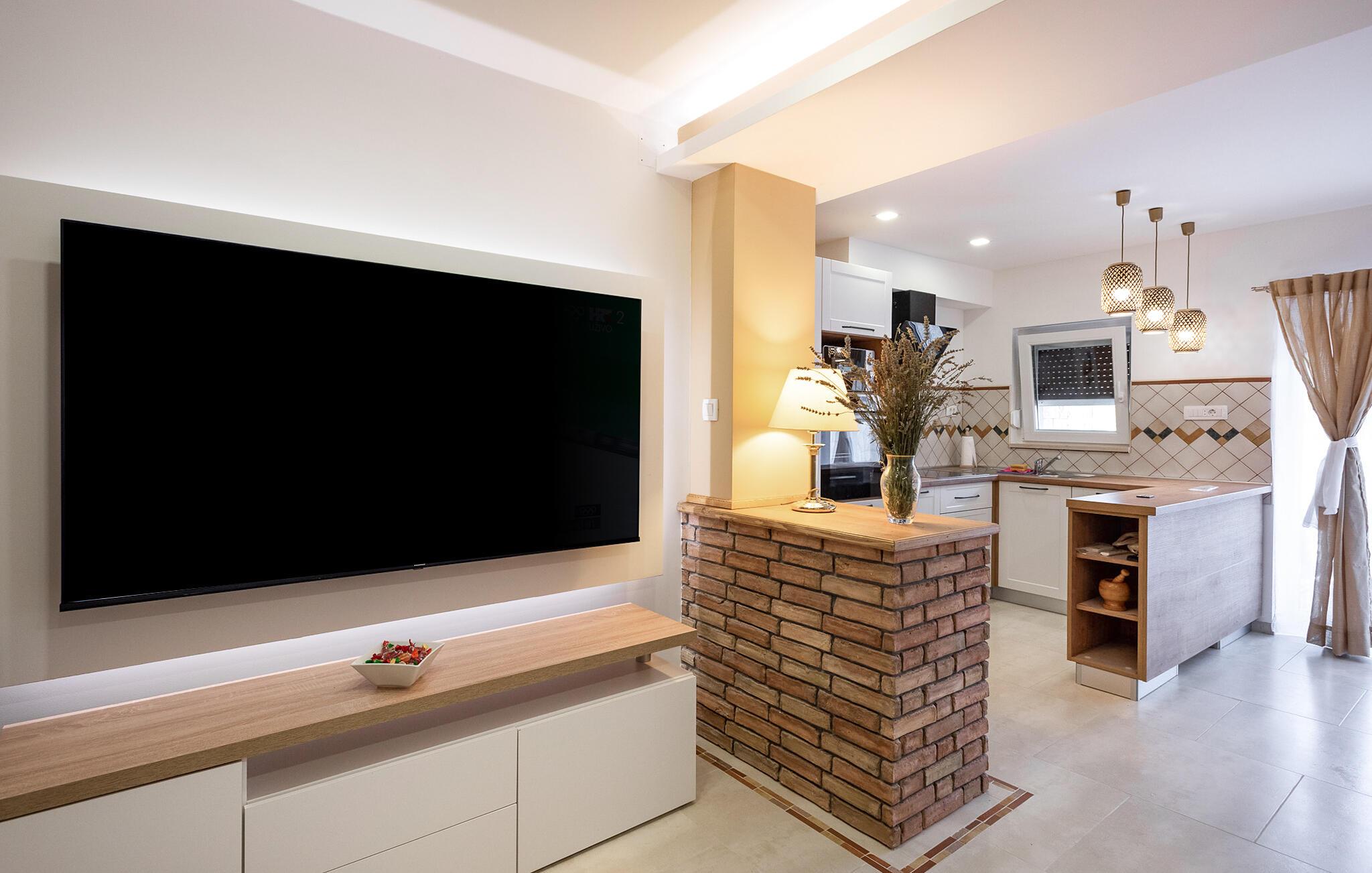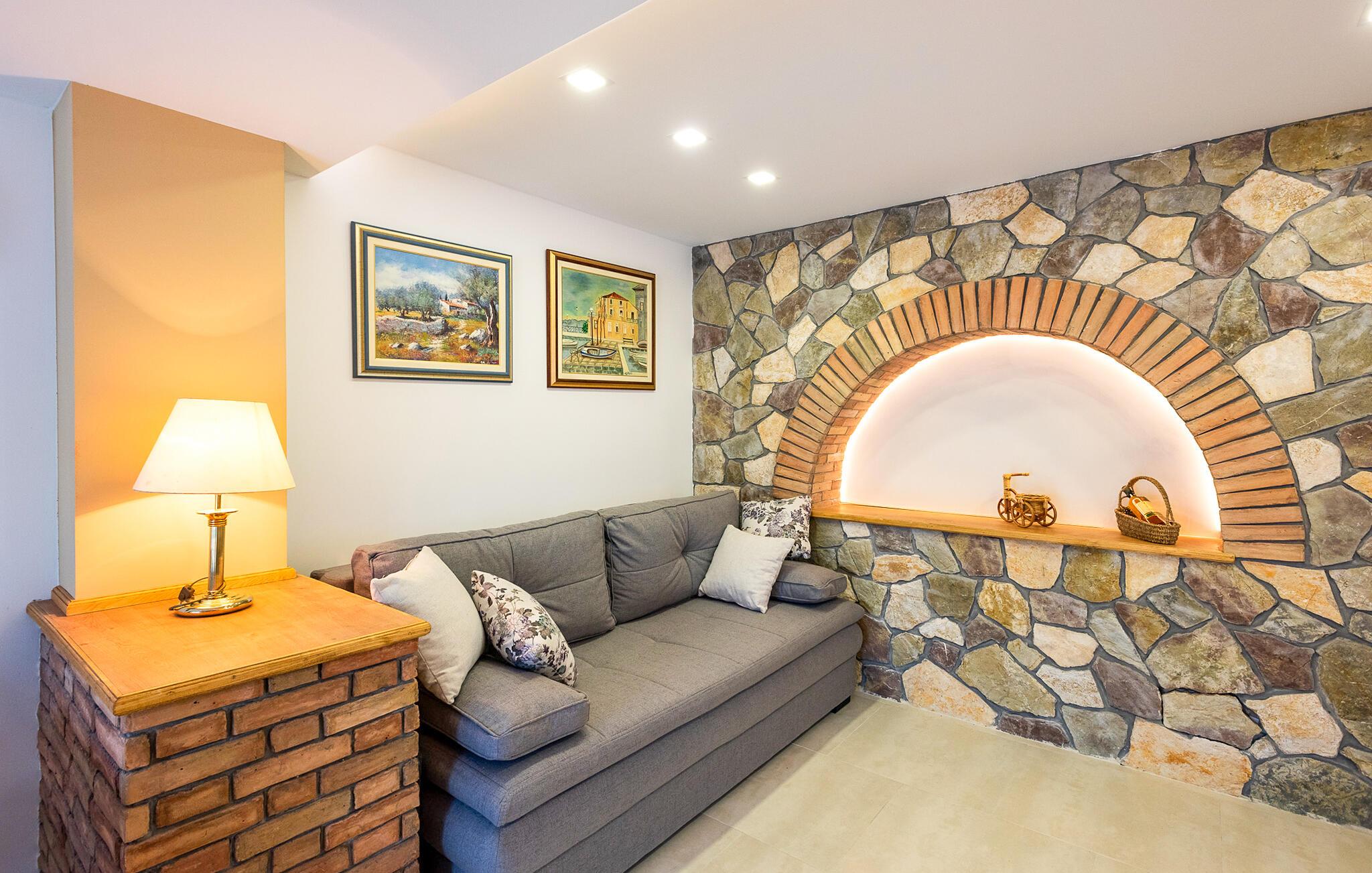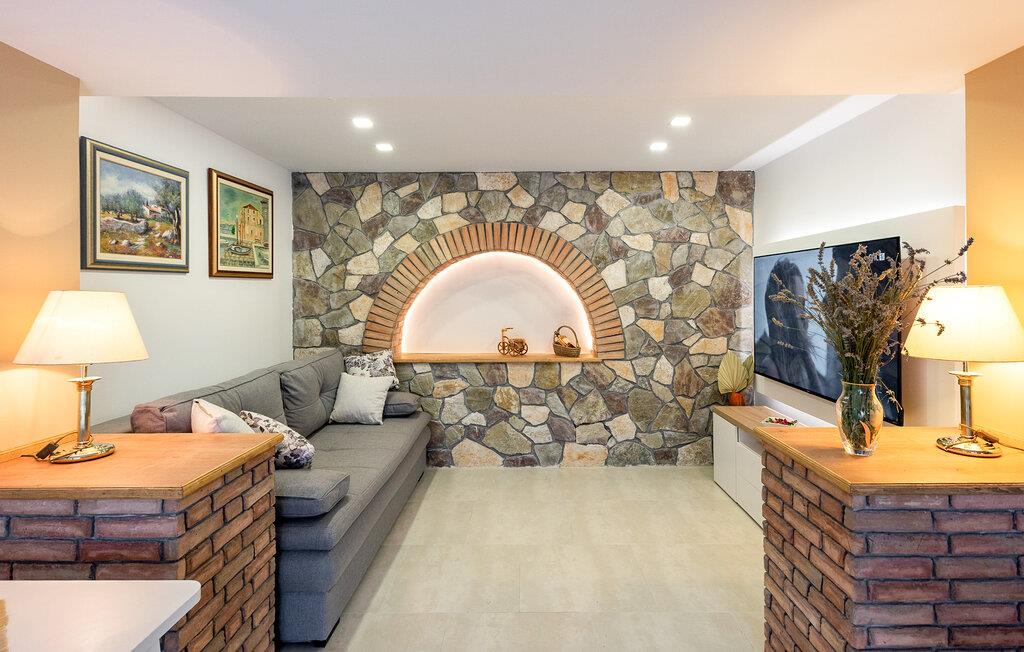 Bliv budt velkommen af ??den varme, harmoniske indretning. Slap af i den hyggelige stue med sofa og stort tv, perfekt til rolige aftener. Den dekorative stenvæg giver rummet en unik atmosfære. Tag plads ved spisebordet og nyd måltider sammen i stilfulde omgivelser. Benyt det moderne køkken med apparater af høj kvalitet og rigelig bordplads til at tilberede regionale specialiteter.