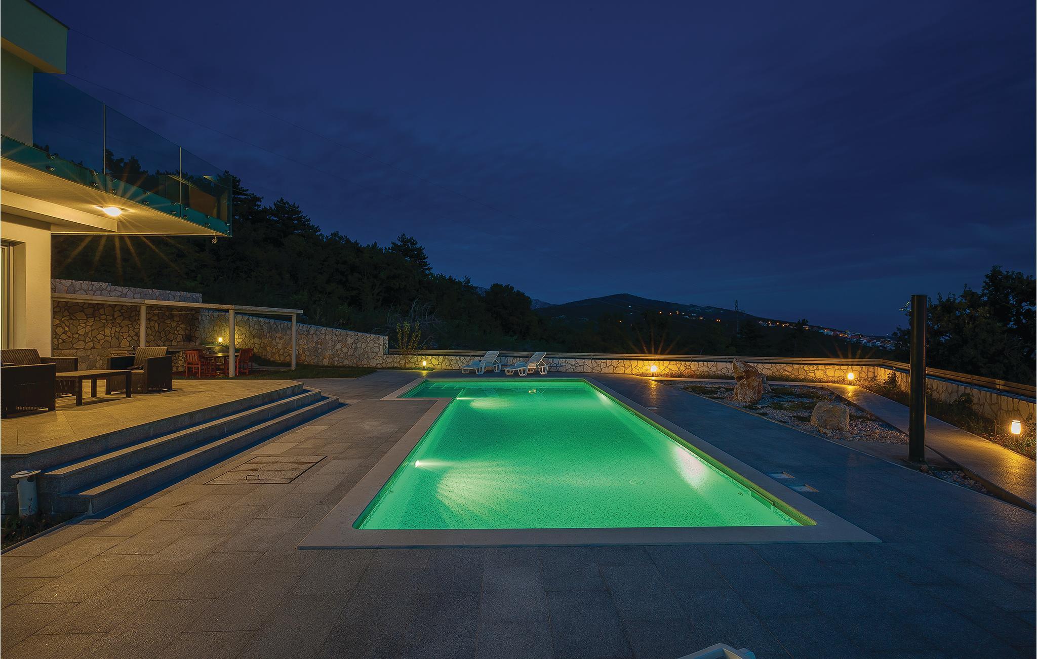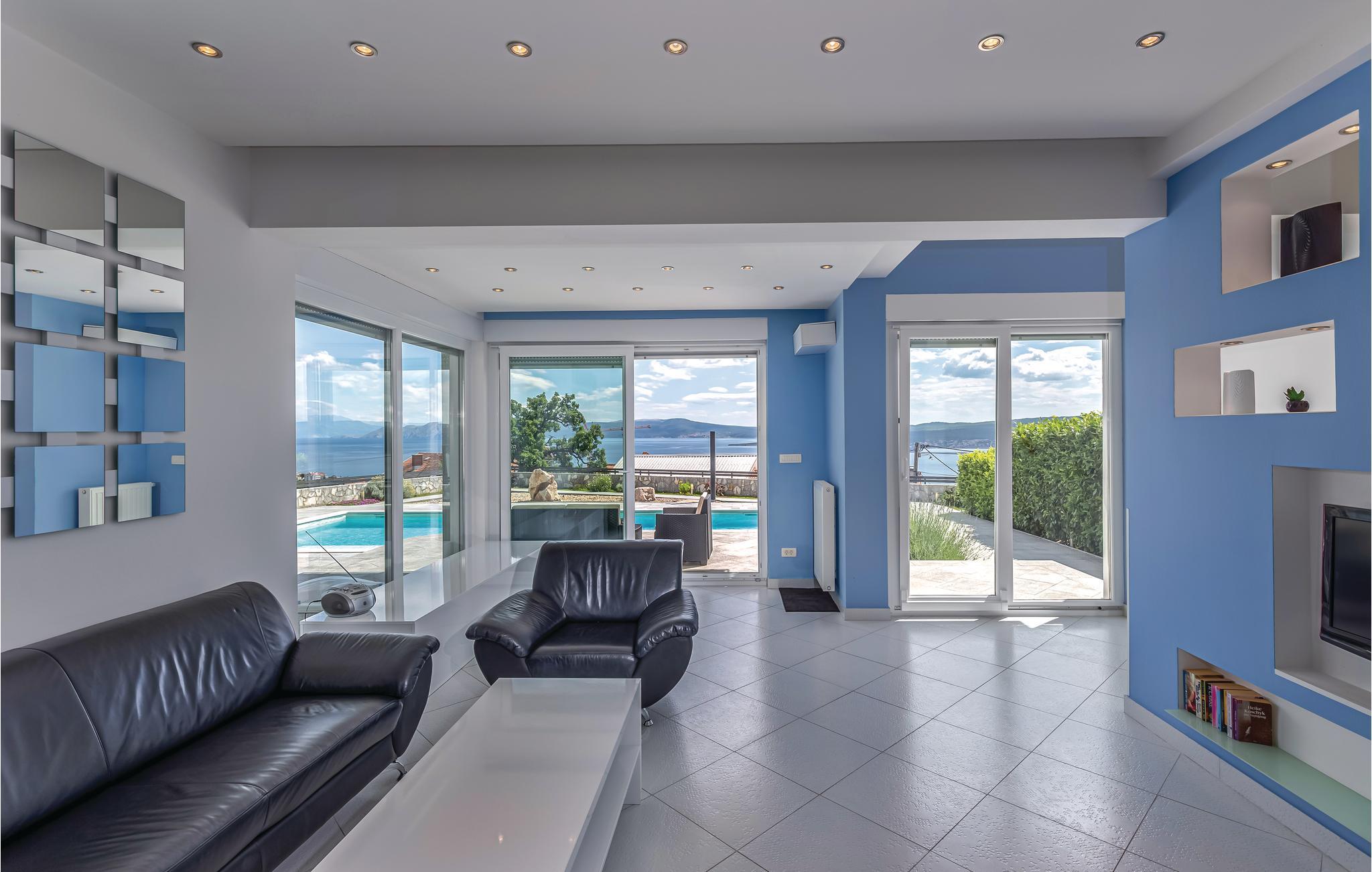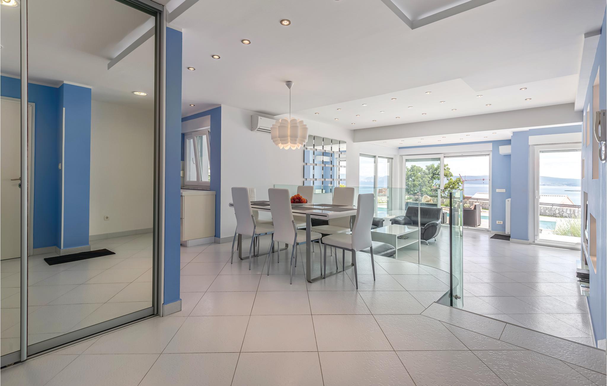 Denne eksklusive villa ligger i et roligt område i den populære by Crikvenica, der har været turistmål i over 120 år. Huset giver jer alle muligheder for en uforglemmelig ferie, langt væk fra byens stress og jag. Den indhegnede grund garanterer jer ro, privatsfære og masser af plads til at lade op igen. Huset er meget rummeligt, og indretningen afspejler en vellykket symbiose af elegance og modernitet. I husets stueplan har I opholdsstuen med køkken og spisestue. På første sal ligger soveværelserne og et gennemgangsværelse til terrassen. Motionsrummet i kælderen giver jer mulighed for forskellige sportsaktiviteter. Fra opholdsstuen kan I komme direkte ud på den velholdte grund. Her lokker poolen med en forfriskende dukkert på de varme sommerdage, og I vil med garanti også elske dette sted på grund af den herlige panoramaudsigt ud over landskabet. Alle detaljerne ved denne villa opfylder med andre ord alle høje krav til en uforglemmelig ferie! Byen Crikvenica er rig på vidunderlige strande og sports- og kulturtilbud til både store og små. Særlig i sommermånederne kan I komme til mange traditionelle arrangementer. Et af de interessanteste er helt sikkert den traditionsrige fiskeuge, hvor I kan smage mange traditionelle specialiteter. Festlighederne foregår faktisk langs hele kysten med en række forbundne turiststeder, fx Selce, Crikvenica, Dramalj og Jadranovo. Lufthavnen i nærheden på øen Krk, havnen i Rijeka, der også er tæt på, og de gode vejforbindelser til Mellemeuropa var vigtige forudsætninger for den tidlige udvikling af turismen, der har en mere end hundredårig historie på området, hvor nutidens Crikvenica-riviera ligger.