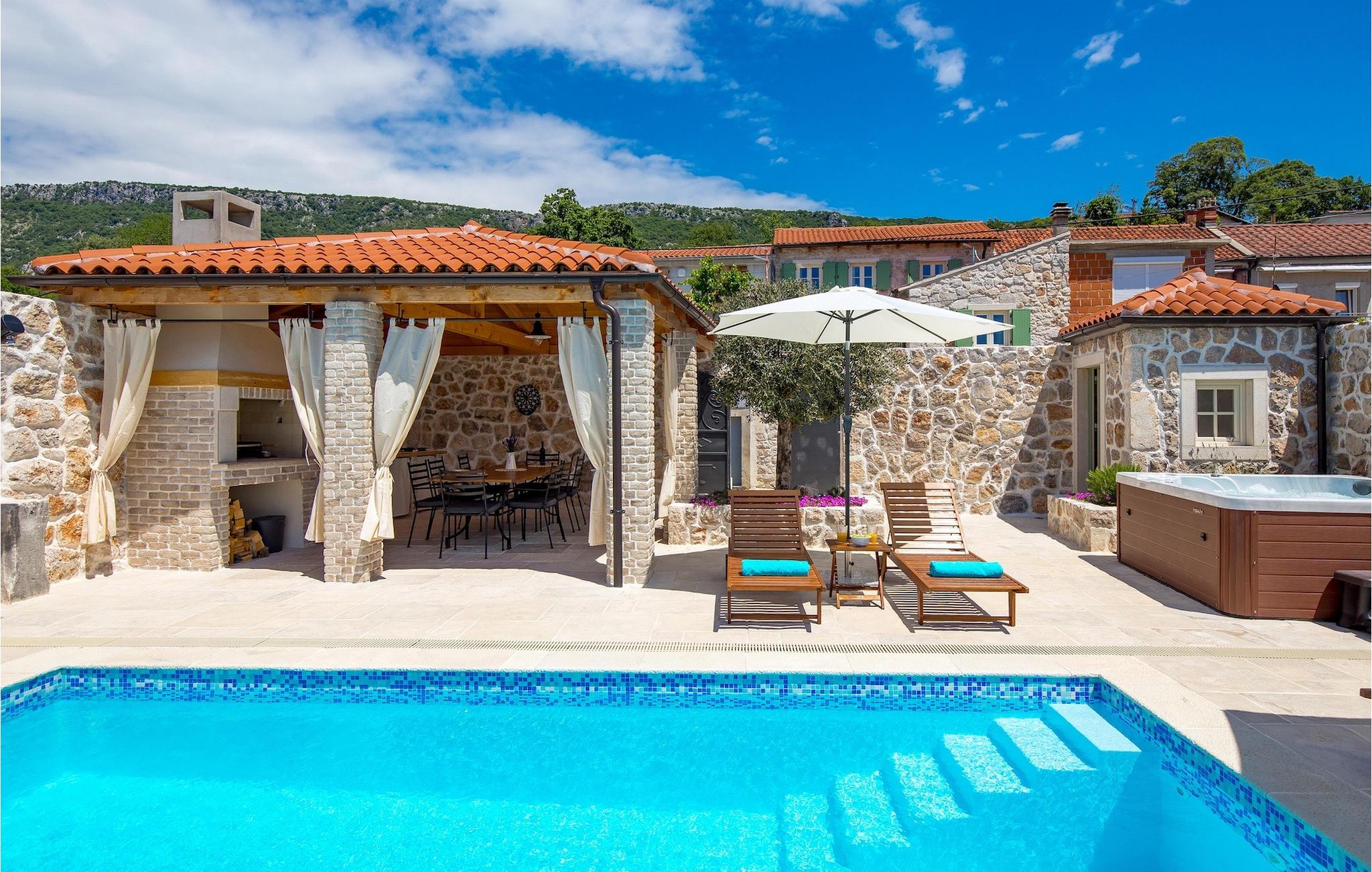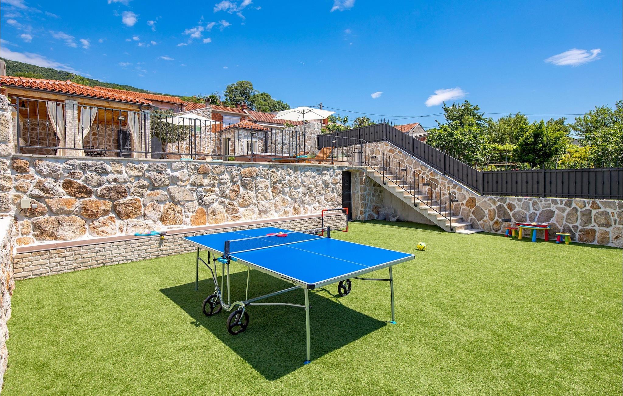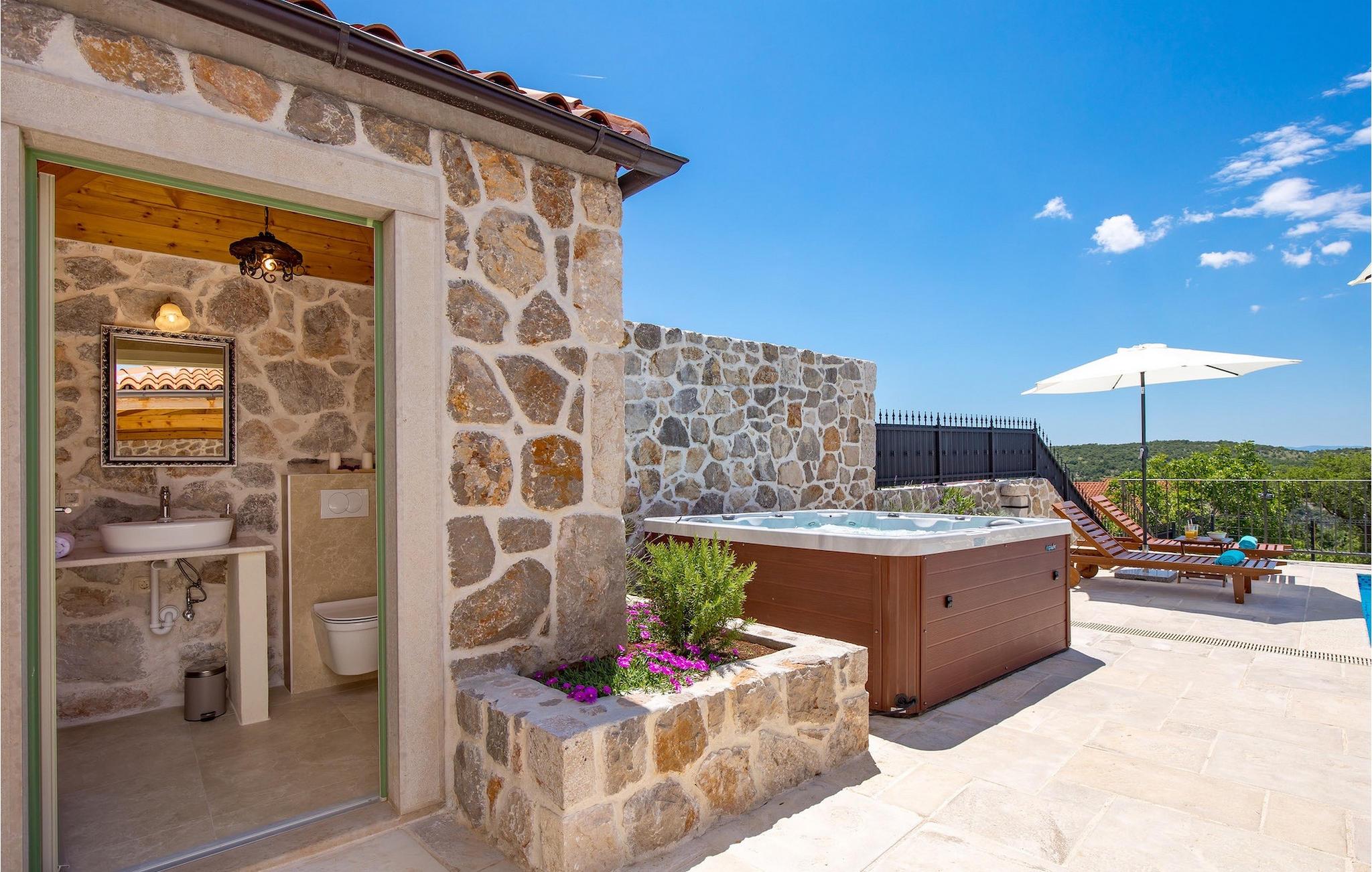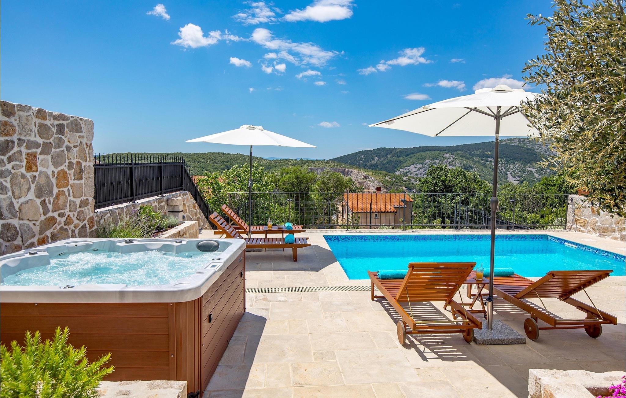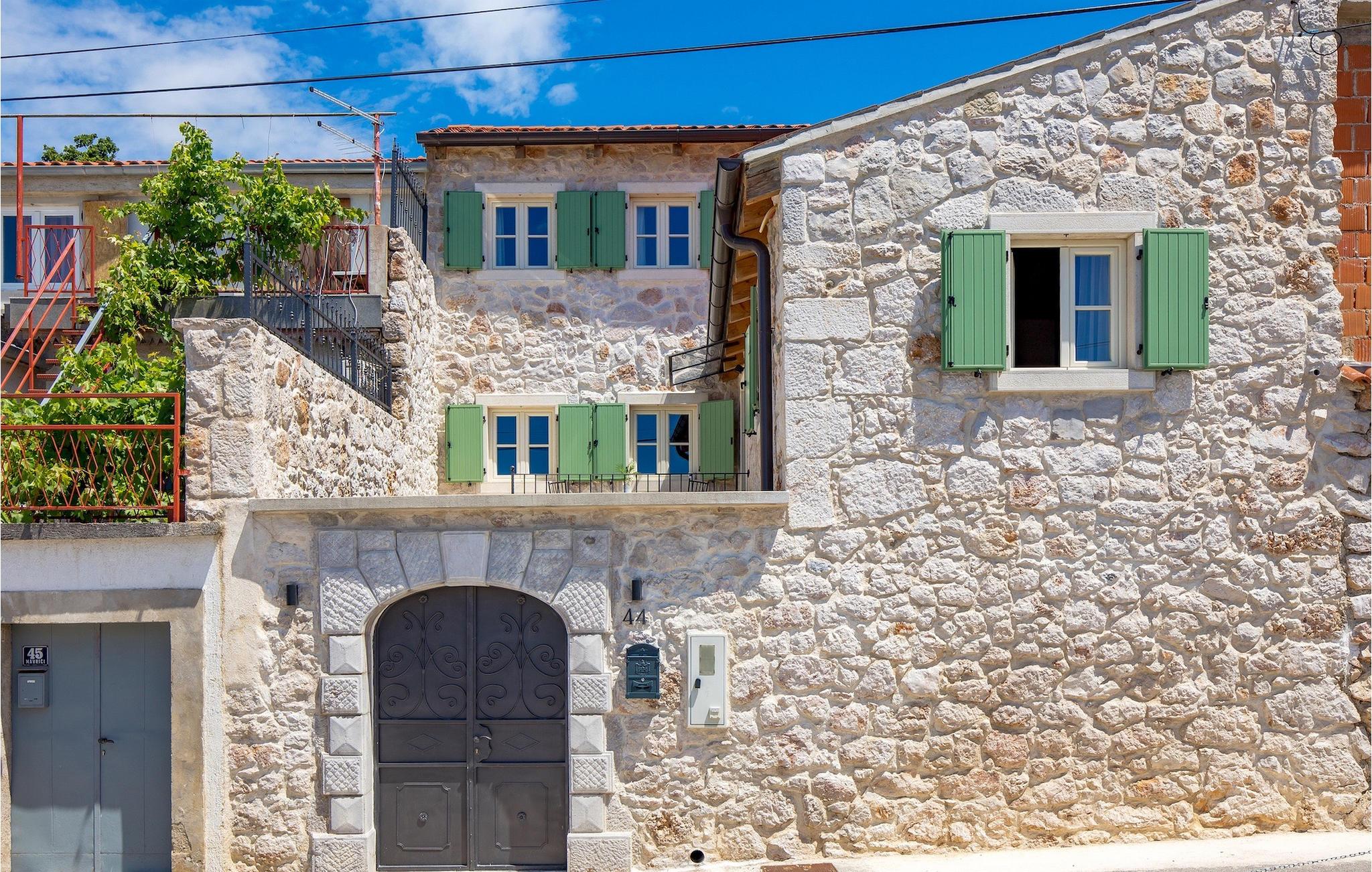 Villa Mavric, en smuk stenvilla vil give dig en drømmeferie. Det emmer af tradition og minder om de middelalderborge, der er typiske for Vinodol-området. På husets nederste etage med egen indgang er der soveværelse med eget badeværelse og dobbeltseng dekoreret med stenhvælving. Tilbring tid for dig selv i rekreationsrummet, som omfatter fitnesscenter og sauna, og det er også placeret i stueetagen med egen indgang. Denne etage er forbundet med første sal med en udendørs trappe. På husets første sal er der et soveværelse med eget badeværelse, et åbent område med en stue, et fuldt udstyret køkken og en spisestue, hvis træoverflader giver varme og er ideelle til at tilberede traditionelle opskrifter. Nyd morgensolens stråler, mens du nyder kaffe på den charmerende terrasse på første sal. På anden sal er der endnu et hyggeligt soveværelse med eget badeværelse. Alle værelser er udstyret med tv og aircondition. Lige over for adgangsvejen er der en parkeringsplads og en have med swimmingpool. Forfrisk dig selv i swimmingpoolen eller i jacuzzien og nyd panoramaudsigten over Grižane. I det overdækkede område ved poolen kan du tilbringe uforglemmelige sammenkomster med familie og venner med en grill, forfriskende drinks, brætspil eller dart. Hav det sjovt i haven med bordtennis, og der er et bord og stole, der er ideelle til børns leg. Gå ikke glip af en ferie, som du vil huske i lang tid, og nyd den lokale atmosfære i Grižane. Grižane er en landsby i nærheden af Crikvenica. Det er kendt for sine middelalderborge og Frankopan-familiens rige historie. Du vil blive henrykt over den omkringliggende skov og stilheden, som dette sted tilbyder. Der er masser af vandre- og cykelstier, der forbinder dig med Crikvenica-kysten og smukke strande. Nyd det rige traditionelle gastronomiske tilbud. Crikvenica, Selce, Dramalj, Jadranovo er blot et par kilometer væk. Ikke langt fra Grižane ligger nationalparken Plitvice Lakes. Besøg dette lille sted, hvor du vil blive fortryllet af duften af fyrreskoven og havet, og opdag det brede udvalg af restauranter i området.