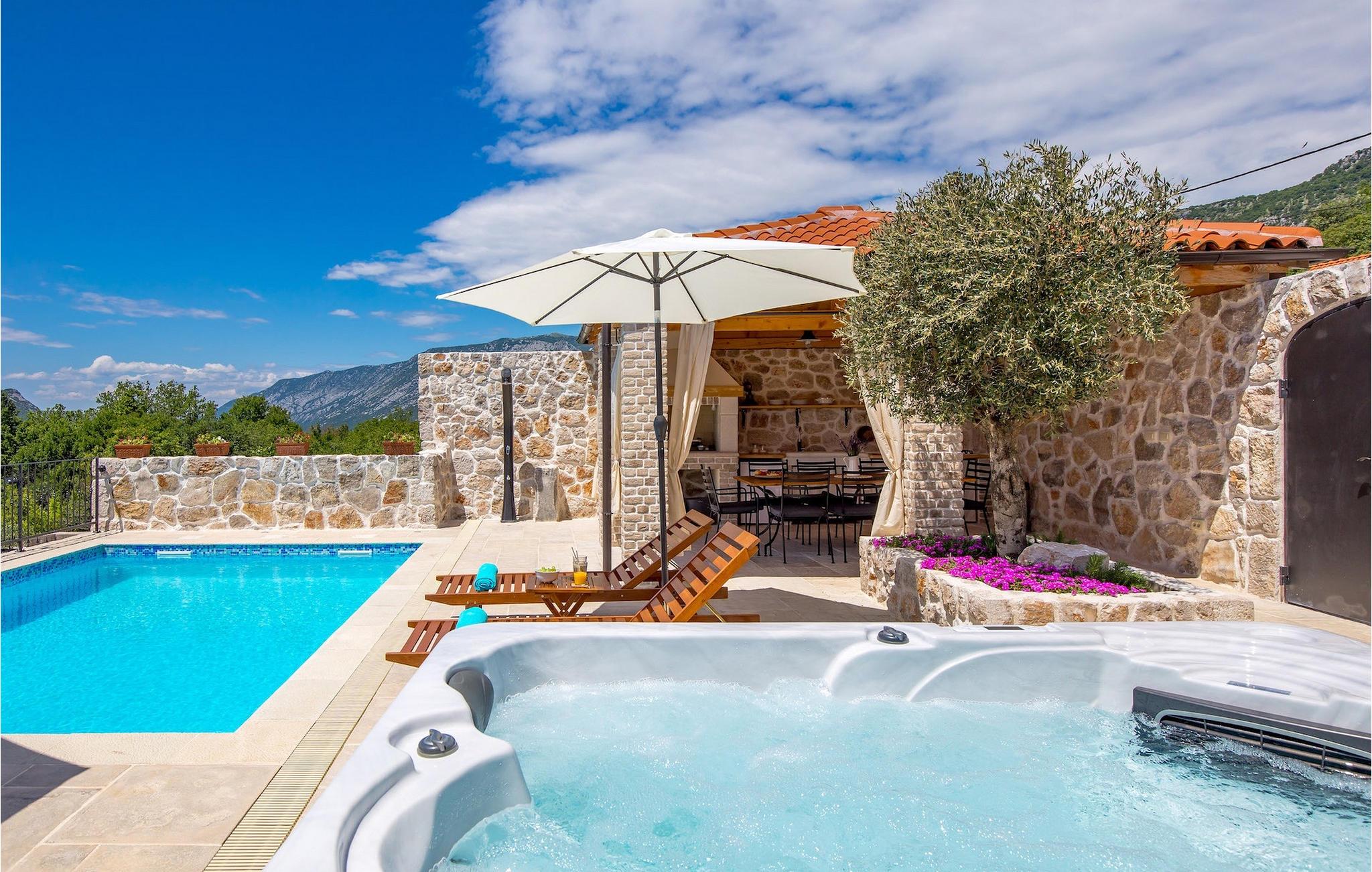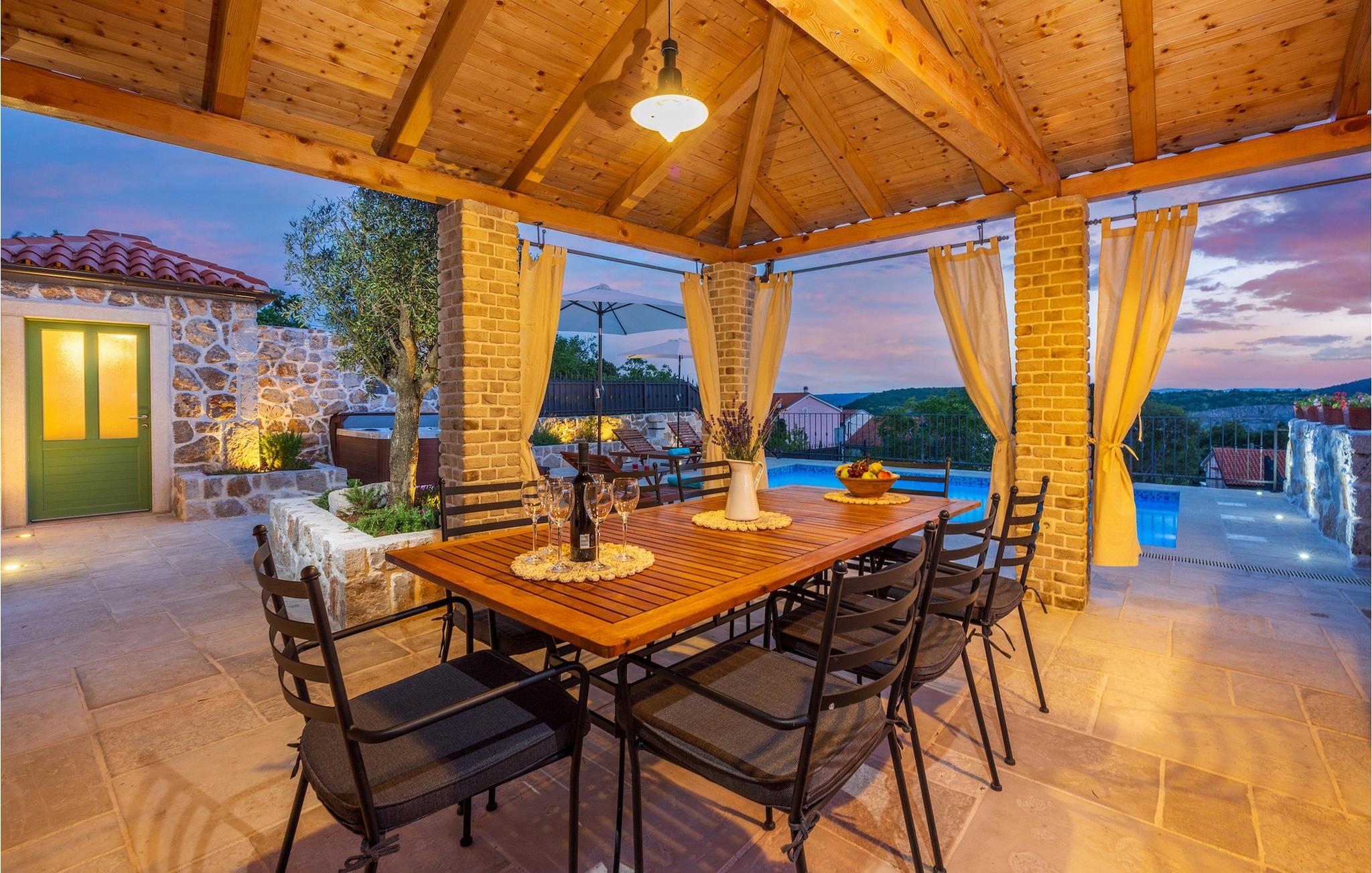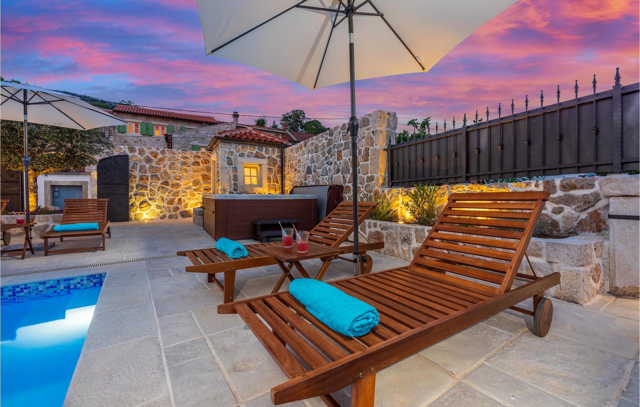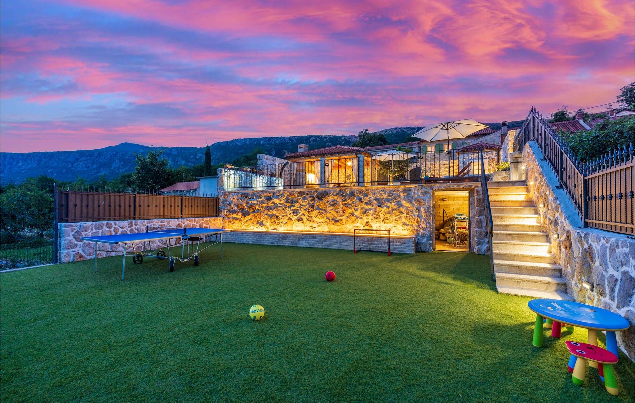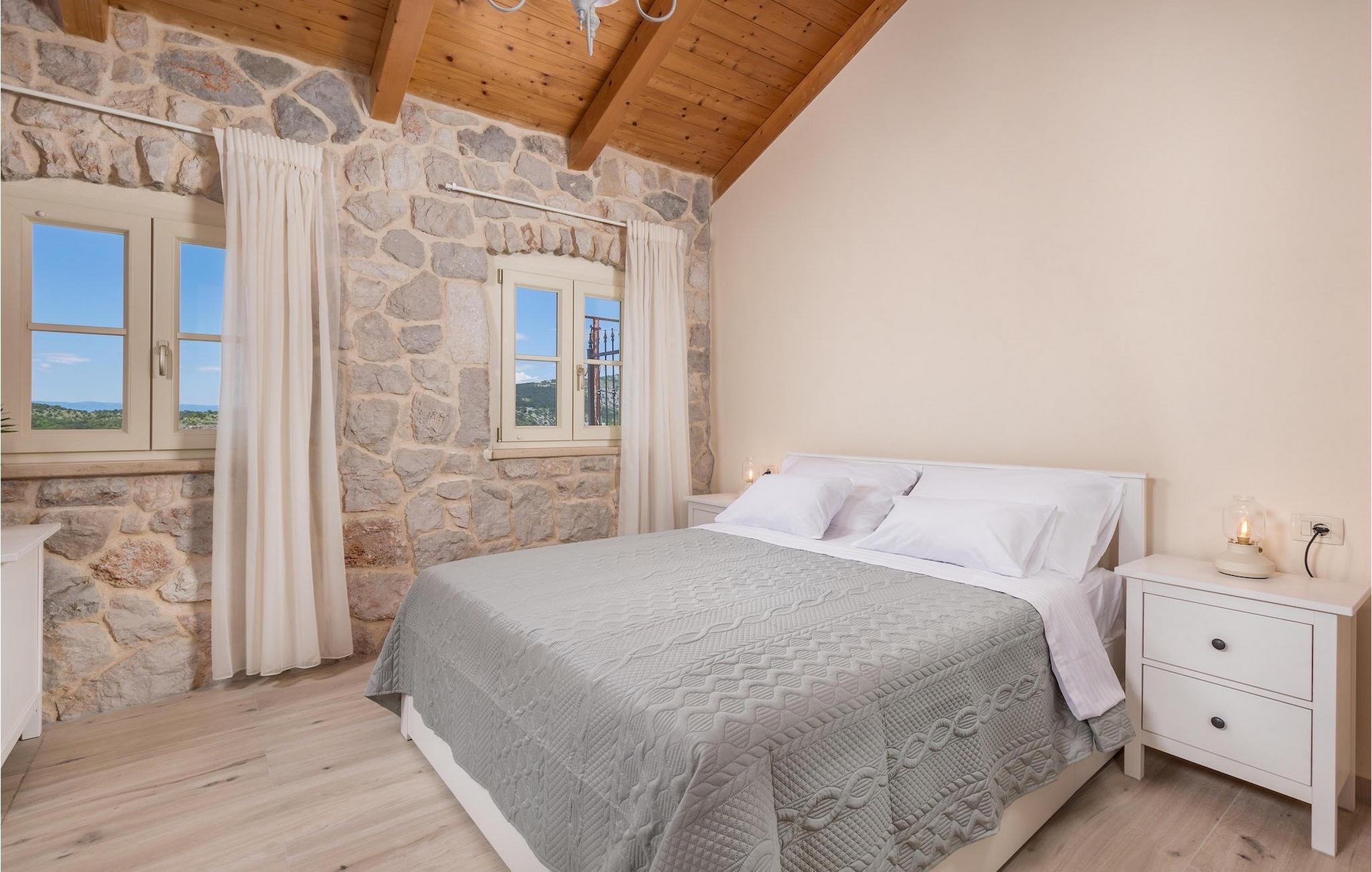 Villa Mavric, en smuk stenvilla vil give dig en drømmeferie. Det emmer af tradition og minder om de middelalderborge, der er typiske for Vinodol-området. På husets nederste etage med egen indgang er der soveværelse med eget badeværelse og dobbeltseng dekoreret med stenhvælving. Tilbring tid for dig selv i rekreationsrummet, som omfatter fitnesscenter og sauna, og det er også placeret i stueetagen med egen indgang. Denne etage er forbundet med første sal med en udendørs trappe. På husets første sal er der et soveværelse med eget badeværelse, et åbent område med en stue, et fuldt udstyret køkken og en spisestue, hvis træoverflader giver varme og er ideelle til at tilberede traditionelle opskrifter. Nyd morgensolens stråler, mens du nyder kaffe på den charmerende terrasse på første sal. På anden sal er der endnu et hyggeligt soveværelse med eget badeværelse. Alle værelser er udstyret med tv og aircondition. Lige over for adgangsvejen er der en parkeringsplads og en have med swimmingpool. Forfrisk dig selv i swimmingpoolen eller i jacuzzien og nyd panoramaudsigten over Grižane. I det overdækkede område ved poolen kan du tilbringe uforglemmelige sammenkomster med familie og venner med en grill, forfriskende drinks, brætspil eller dart. Hav det sjovt i haven med bordtennis, og der er et bord og stole, der er ideelle til børns leg. Gå ikke glip af en ferie, som du vil huske i lang tid, og nyd den lokale atmosfære i Grižane. Grižane er en landsby i nærheden af Crikvenica. Det er kendt for sine middelalderborge og Frankopan-familiens rige historie. Du vil blive henrykt over den omkringliggende skov og stilheden, som dette sted tilbyder. Der er masser af vandre- og cykelstier, der forbinder dig med Crikvenica-kysten og smukke strande. Nyd det rige traditionelle gastronomiske tilbud. Crikvenica, Selce, Dramalj, Jadranovo er blot et par kilometer væk. Ikke langt fra Grižane ligger nationalparken Plitvice Lakes. Besøg dette lille sted, hvor du vil blive fortryllet af duften af fyrreskoven og havet, og opdag det brede udvalg af restauranter i området.