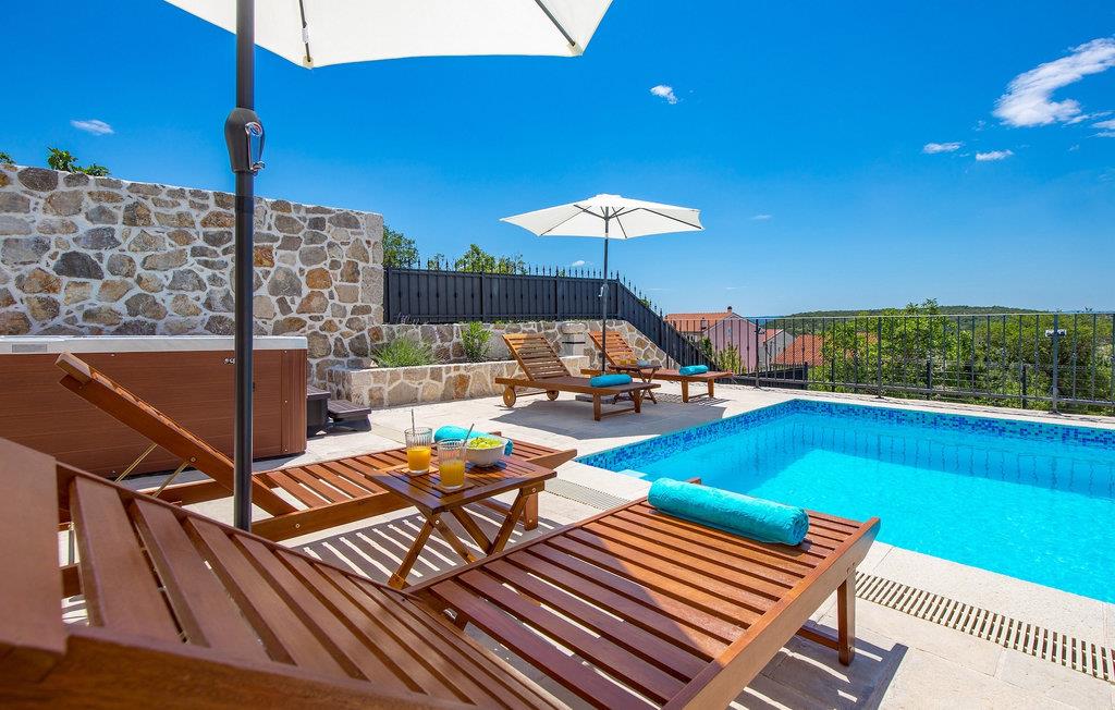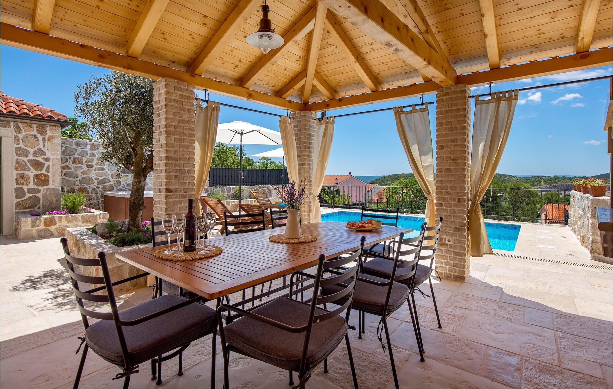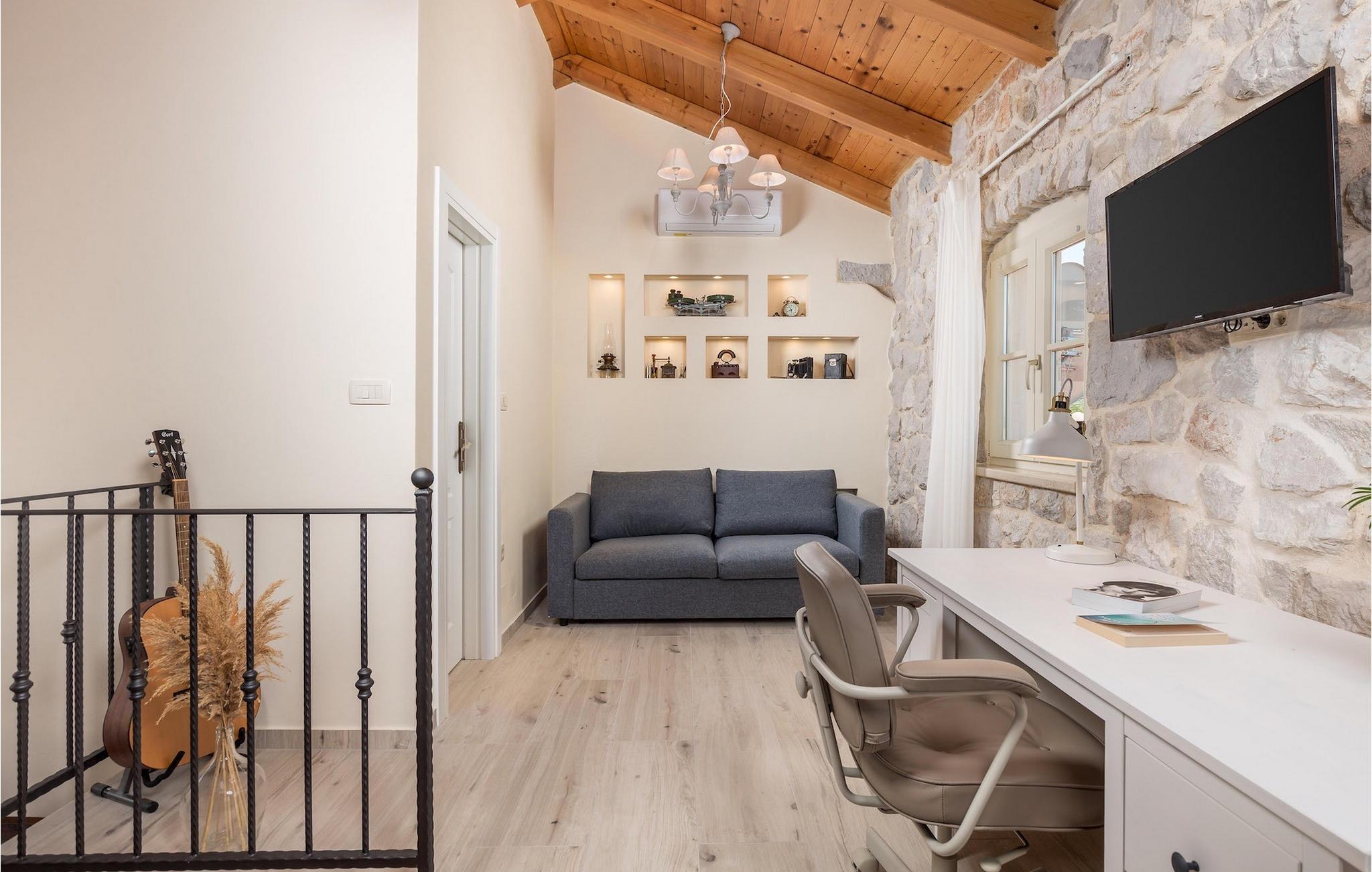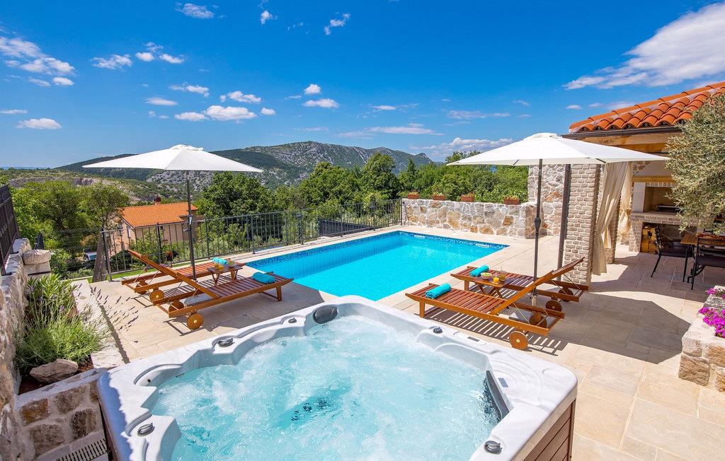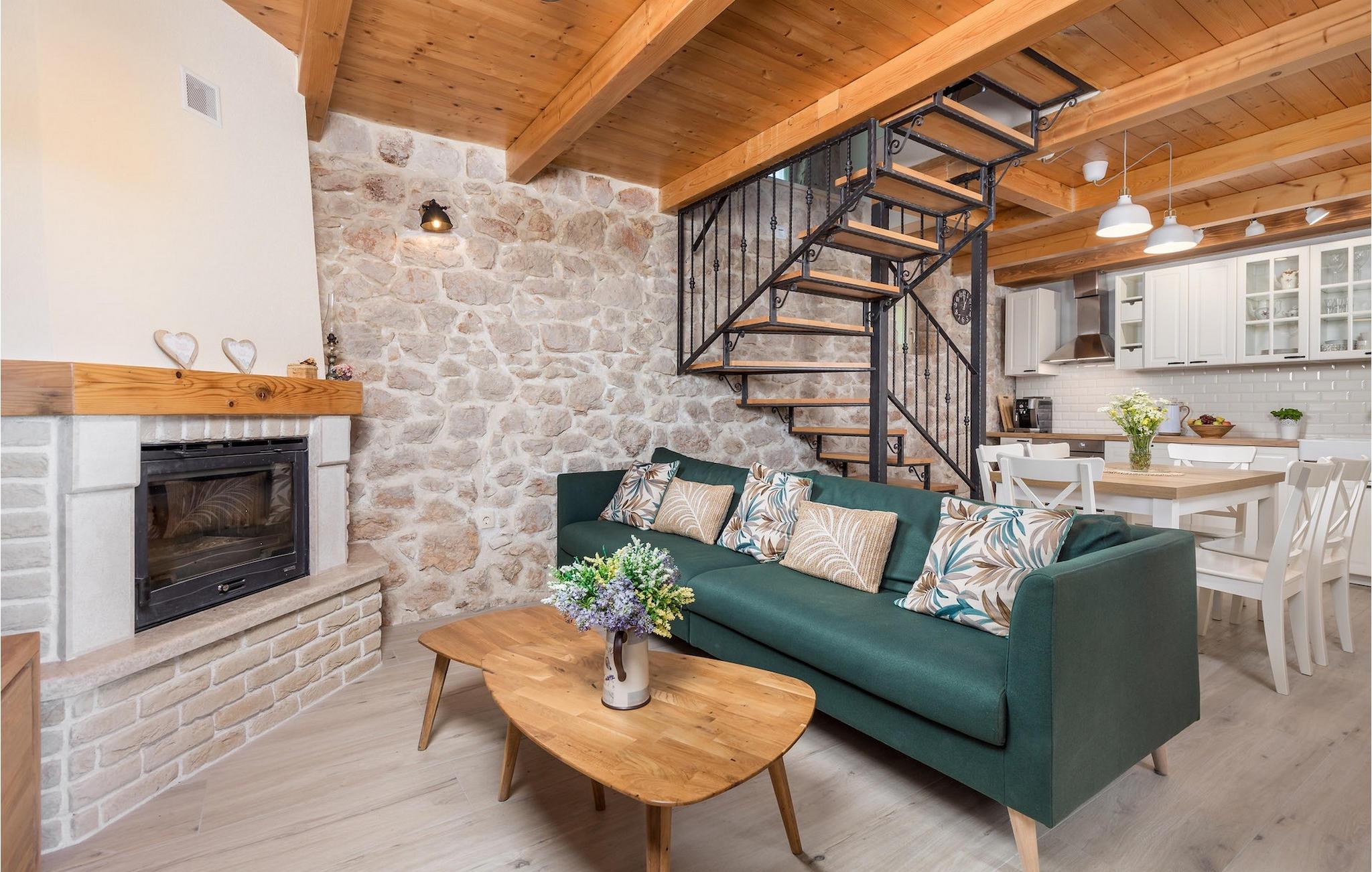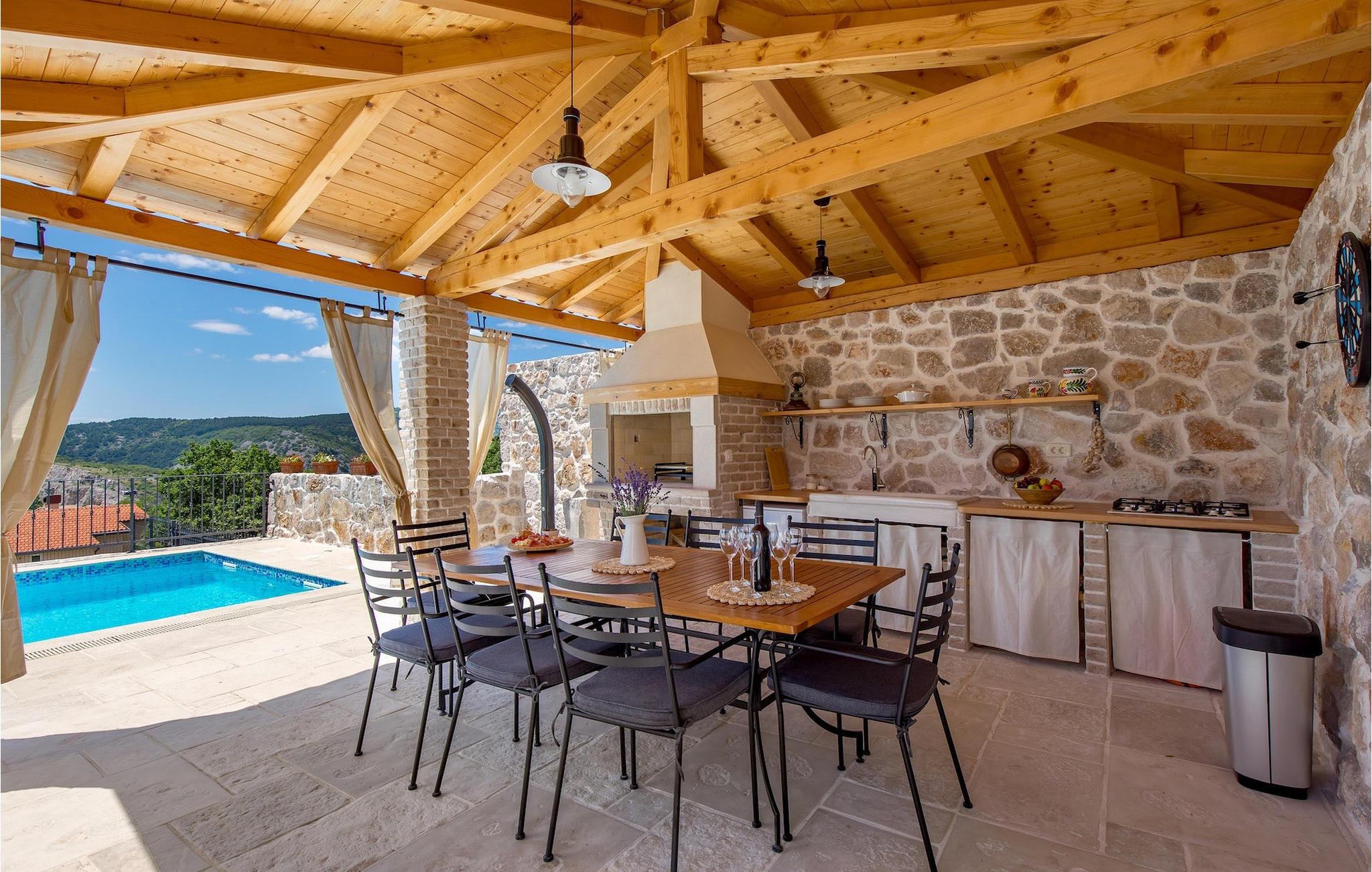 Villa Mavric, en smuk stenvilla vil give dig en drømmeferie. Det emmer af tradition og minder om de middelalderborge, der er typiske for Vinodol-området. På husets nederste etage med egen indgang er der soveværelse med eget badeværelse og dobbeltseng dekoreret med stenhvælving. Tilbring tid for dig selv i rekreationsrummet, som omfatter fitnesscenter og sauna, og det er også placeret i stueetagen med egen indgang. Denne etage er forbundet med første sal med en udendørs trappe. På husets første sal er der et soveværelse med eget badeværelse, et åbent område med en stue, et fuldt udstyret køkken og en spisestue, hvis træoverflader giver varme og er ideelle til at tilberede traditionelle opskrifter. Nyd morgensolens stråler, mens du nyder kaffe på den charmerende terrasse på første sal. På anden sal er der endnu et hyggeligt soveværelse med eget badeværelse. Alle værelser er udstyret med tv og aircondition. Lige over for adgangsvejen er der en parkeringsplads og en have med swimmingpool. Forfrisk dig selv i swimmingpoolen eller i jacuzzien og nyd panoramaudsigten over Grižane. I det overdækkede område ved poolen kan du tilbringe uforglemmelige sammenkomster med familie og venner med en grill, forfriskende drinks, brætspil eller dart. Hav det sjovt i haven med bordtennis, og der er et bord og stole, der er ideelle til børns leg. Gå ikke glip af en ferie, som du vil huske i lang tid, og nyd den lokale atmosfære i Grižane. Grižane er en landsby i nærheden af Crikvenica. Det er kendt for sine middelalderborge og Frankopan-familiens rige historie. Du vil blive henrykt over den omkringliggende skov og stilheden, som dette sted tilbyder. Der er masser af vandre- og cykelstier, der forbinder dig med Crikvenica-kysten og smukke strande. Nyd det rige traditionelle gastronomiske tilbud. Crikvenica, Selce, Dramalj, Jadranovo er blot et par kilometer væk. Ikke langt fra Grižane ligger nationalparken Plitvice Lakes. Besøg dette lille sted, hvor du vil blive fortryllet af duften af fyrreskoven og havet, og opdag det brede udvalg af restauranter i området.
