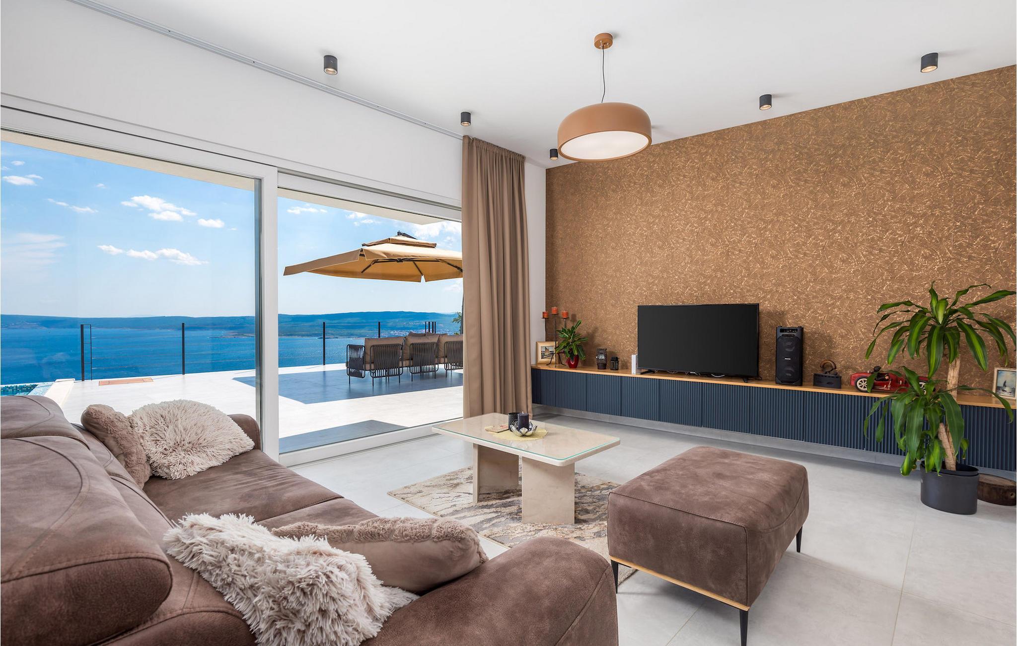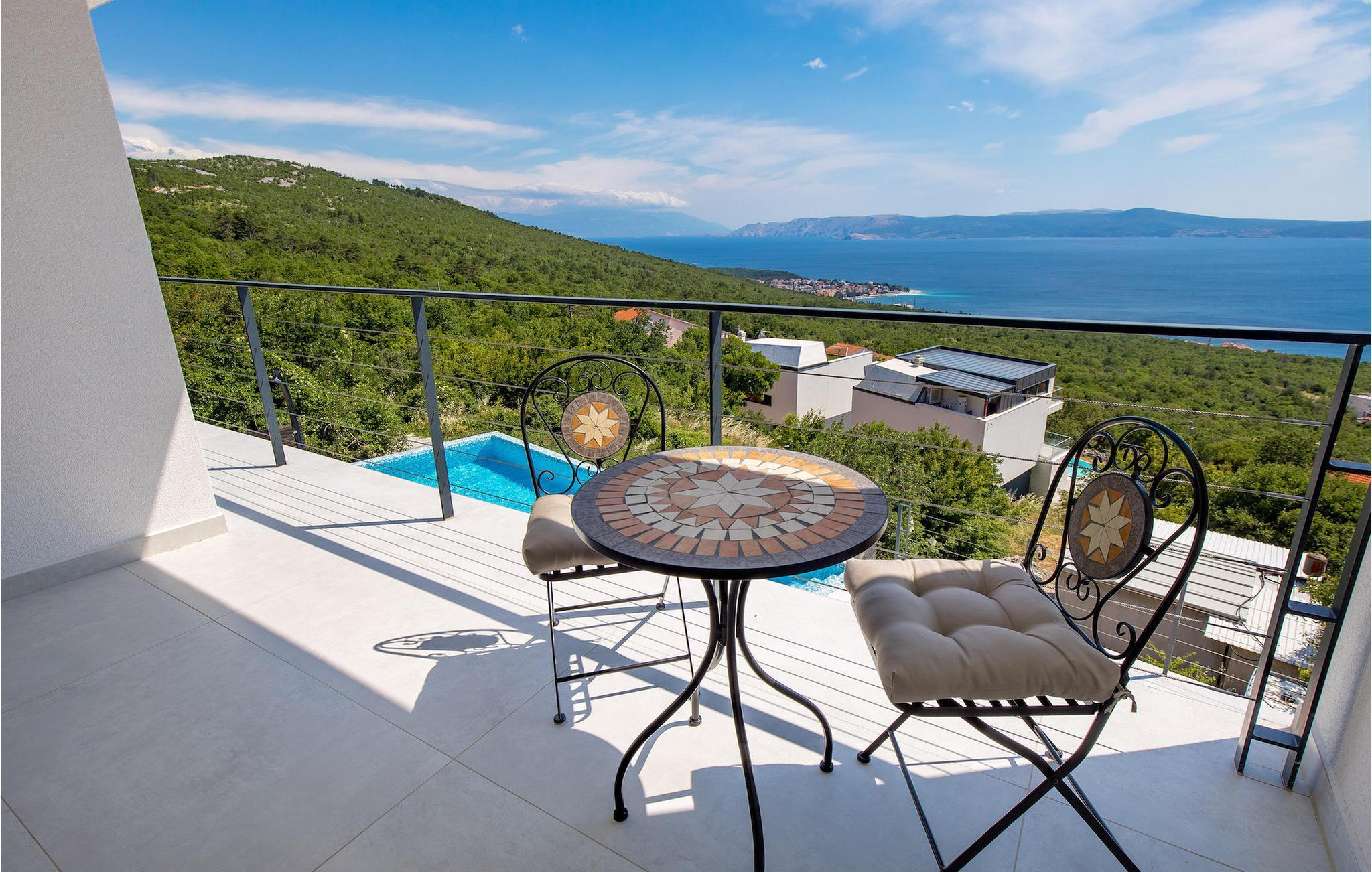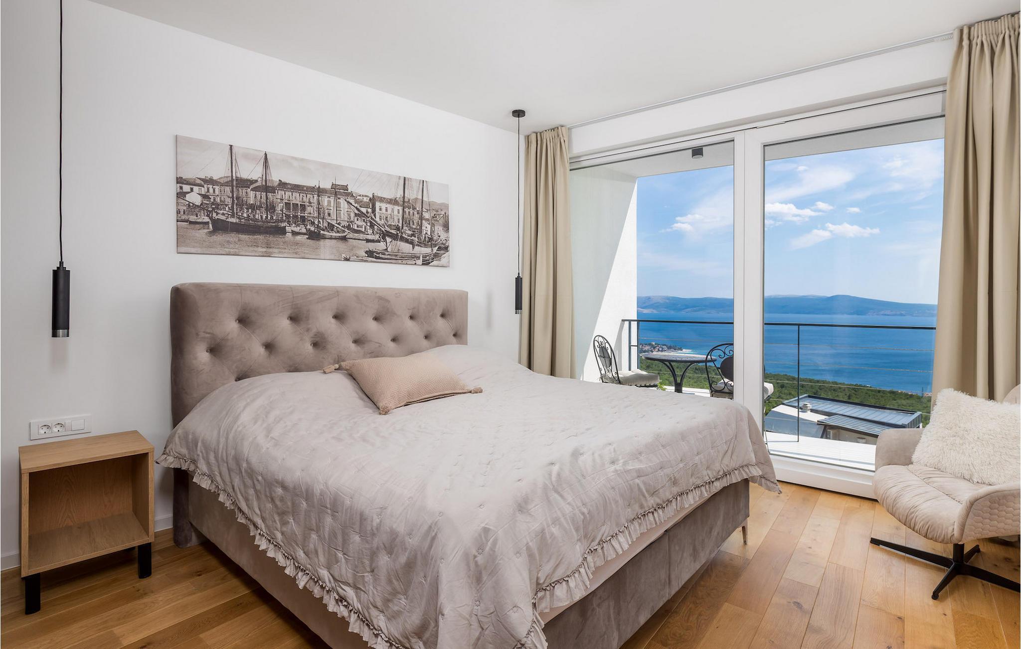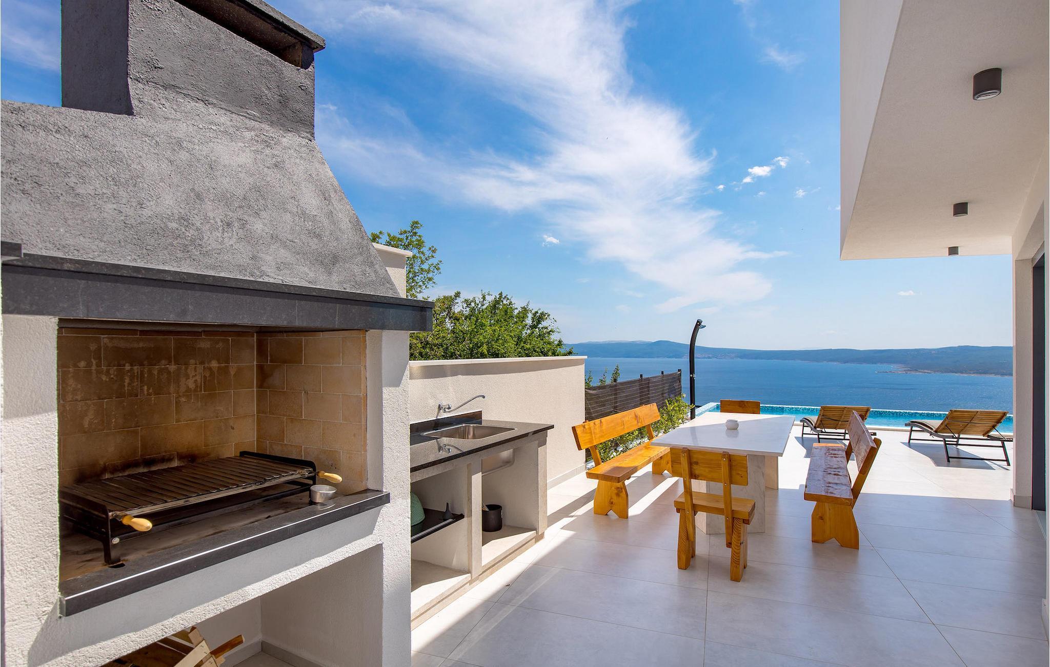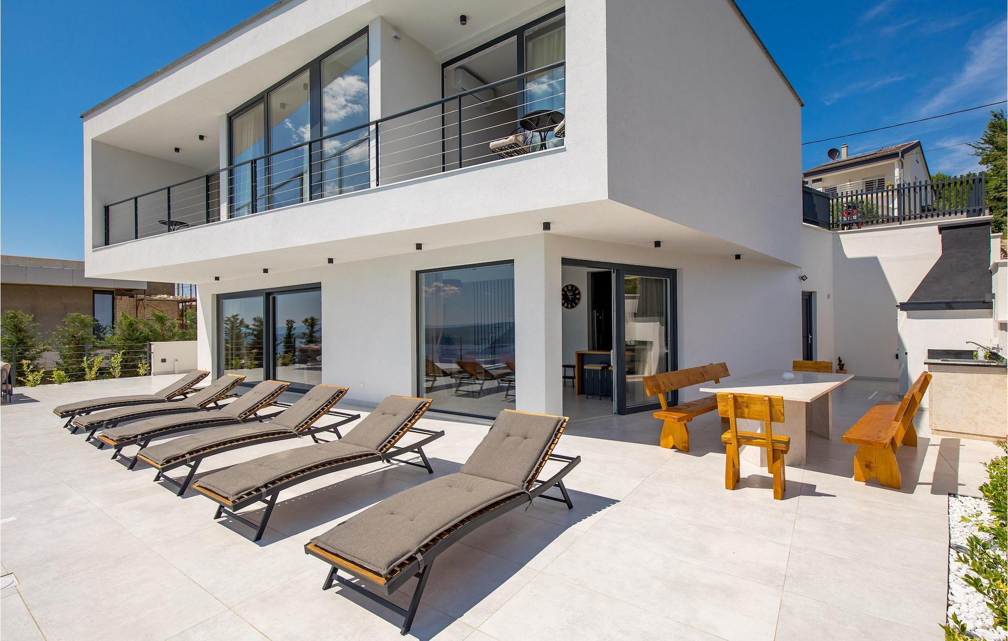 Moderne Villa Murn vil forbløffe dig med sin forbløffende panoramaudsigt over havet lige fra den private pool på kanten af terrassen. Ved siden af poolen kan du nyde solskinnet på 6 strandstole eller køle ned i det skyggefulde loungeområde. Udekøkkenet med grill og spiseplads til op til 10 gæster er perfekt til en privat middagsoplevelse med udsigt. Gennem den delvise vinduesvæg kan du komme ind i stuen, dækket af naturligt lys. På samme etage er det fuldt udstyret køkken og et andet spisebord til op til 8 personer. En etage oppe finder du 3 komfortable dobbeltværelser, hver med eget badeværelse og tv. Den solbelyste balkon byder på 2 separate små borde til to personer hver for at nyde udsigten over morgenkaffen. For en luksuriøs ferie med en uforglemmelig udsigt er Vila Murn det rigtige valg. Villa Murn ligger i Crikvenica, hvor du kan nyde sjove aktiviteter såsom dykning og besøge adrenalinparker. For en mere fredelig aktivitet kan du nyde udsigten over den smukke kyst fra pariserhjulet eller slappe af på en af de fantastiske strande. Omkring en halv time væk kan du besøge Rijeka og udforske Trsat Slot. Slottets gårdhave er nu omdannet til restaurant og er perfekt til en unik middagsoplevelse ved en fæstning.