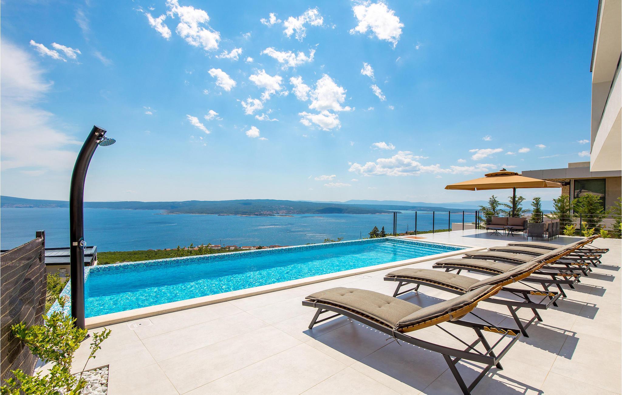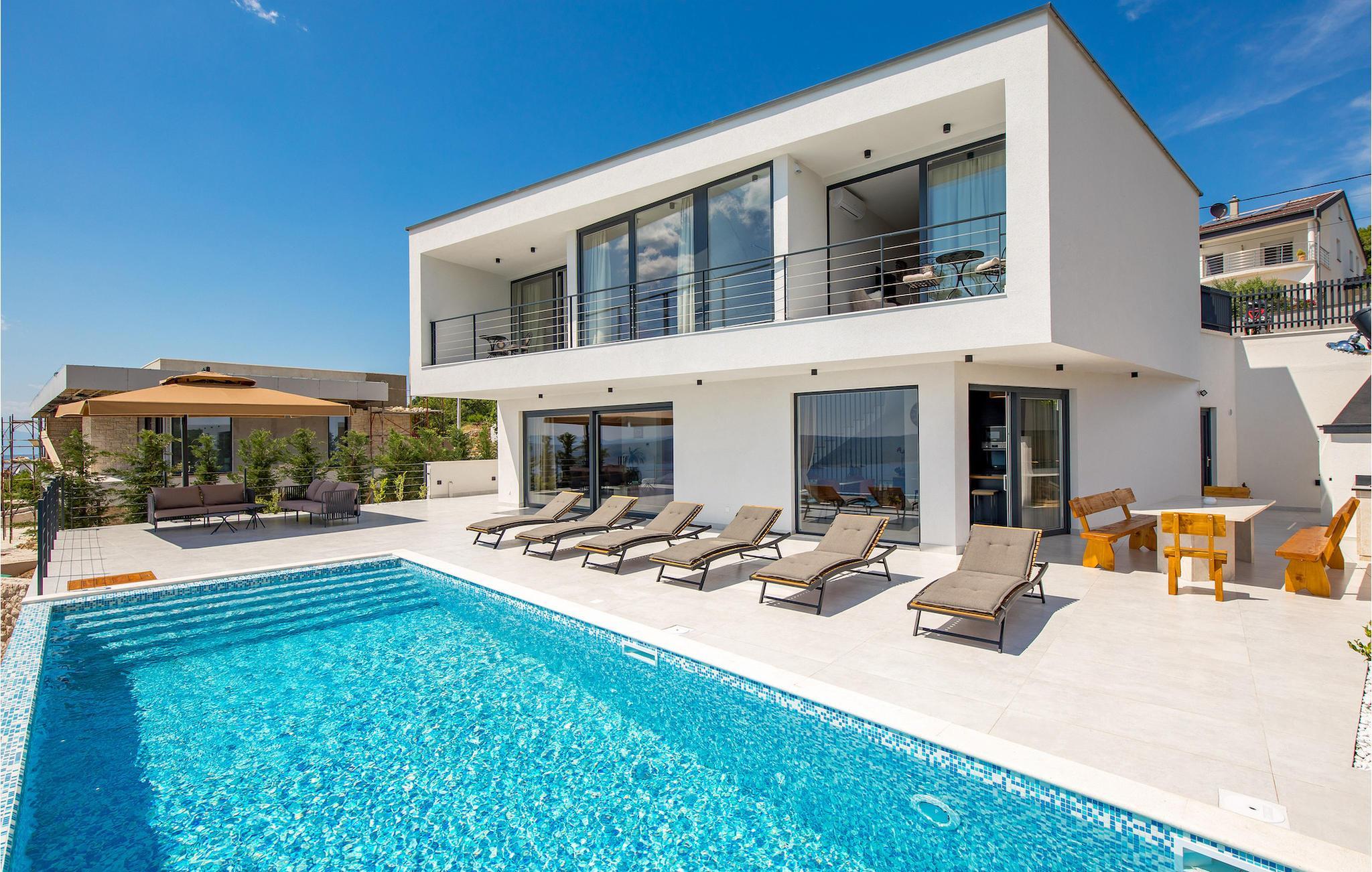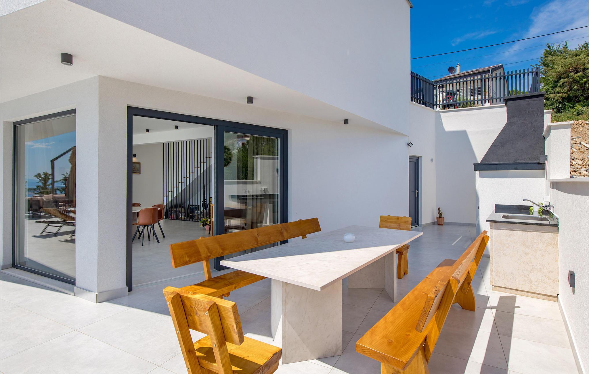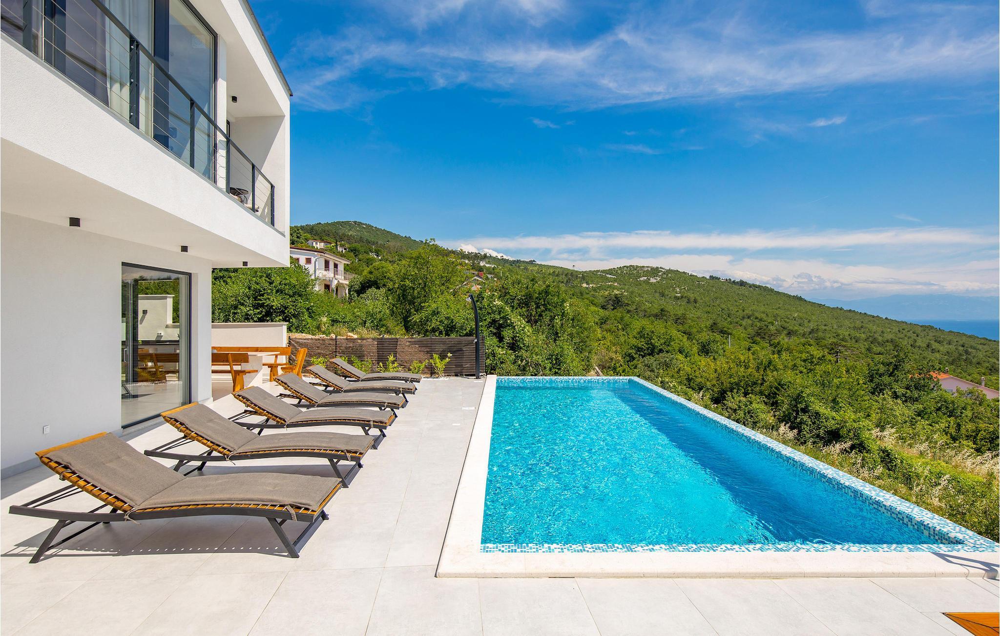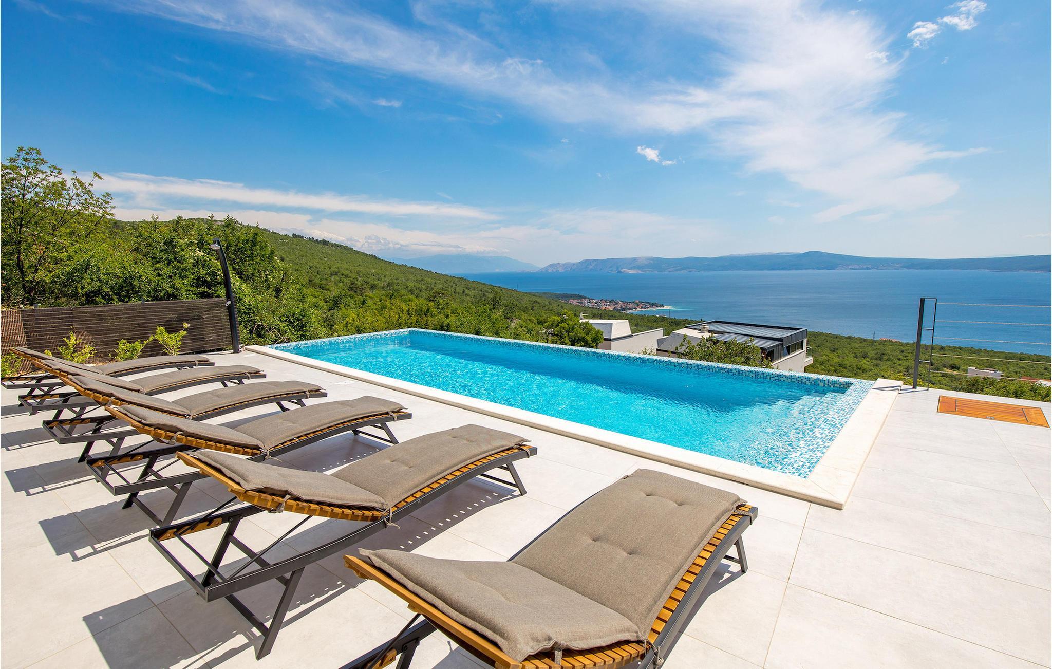 Moderne Villa Murn vil forbløffe dig med sin forbløffende panoramaudsigt over havet lige fra den private pool på kanten af terrassen. Ved siden af poolen kan du nyde solskinnet på 6 strandstole eller køle ned i det skyggefulde loungeområde. Udekøkkenet med grill og spiseplads til op til 10 gæster er perfekt til en privat middagsoplevelse med udsigt. Gennem den delvise vinduesvæg kan du komme ind i stuen, dækket af naturligt lys. På samme etage er det fuldt udstyret køkken og et andet spisebord til op til 8 personer. En etage oppe finder du 3 komfortable dobbeltværelser, hver med eget badeværelse og tv. Den solbelyste balkon byder på 2 separate små borde til to personer hver for at nyde udsigten over morgenkaffen. For en luksuriøs ferie med en uforglemmelig udsigt er Vila Murn det rigtige valg. Villa Murn ligger i Crikvenica, hvor du kan nyde sjove aktiviteter såsom dykning og besøge adrenalinparker. For en mere fredelig aktivitet kan du nyde udsigten over den smukke kyst fra pariserhjulet eller slappe af på en af de fantastiske strande. Omkring en halv time væk kan du besøge Rijeka og udforske Trsat Slot. Slottets gårdhave er nu omdannet til restaurant og er perfekt til en unik middagsoplevelse ved en fæstning.