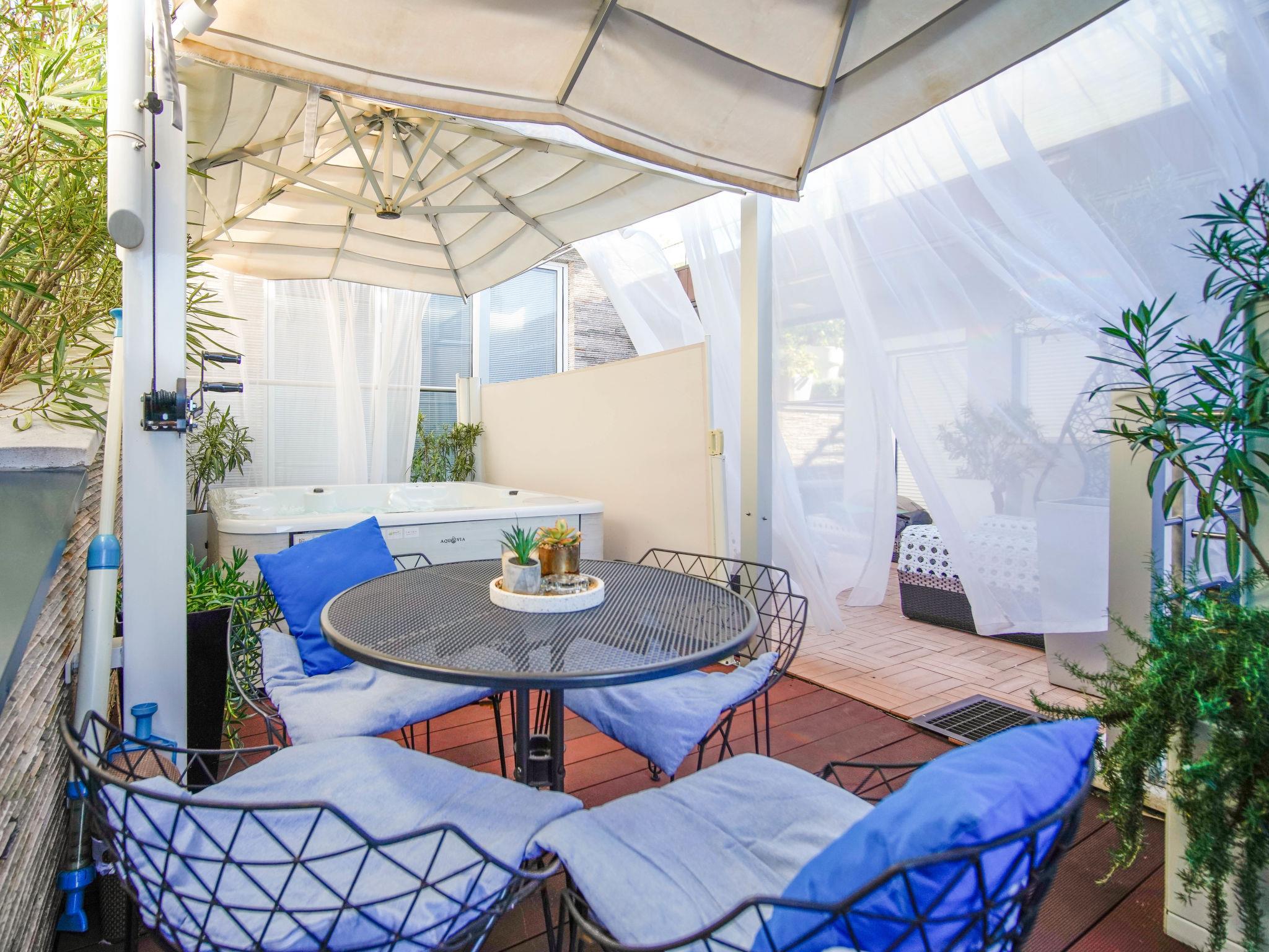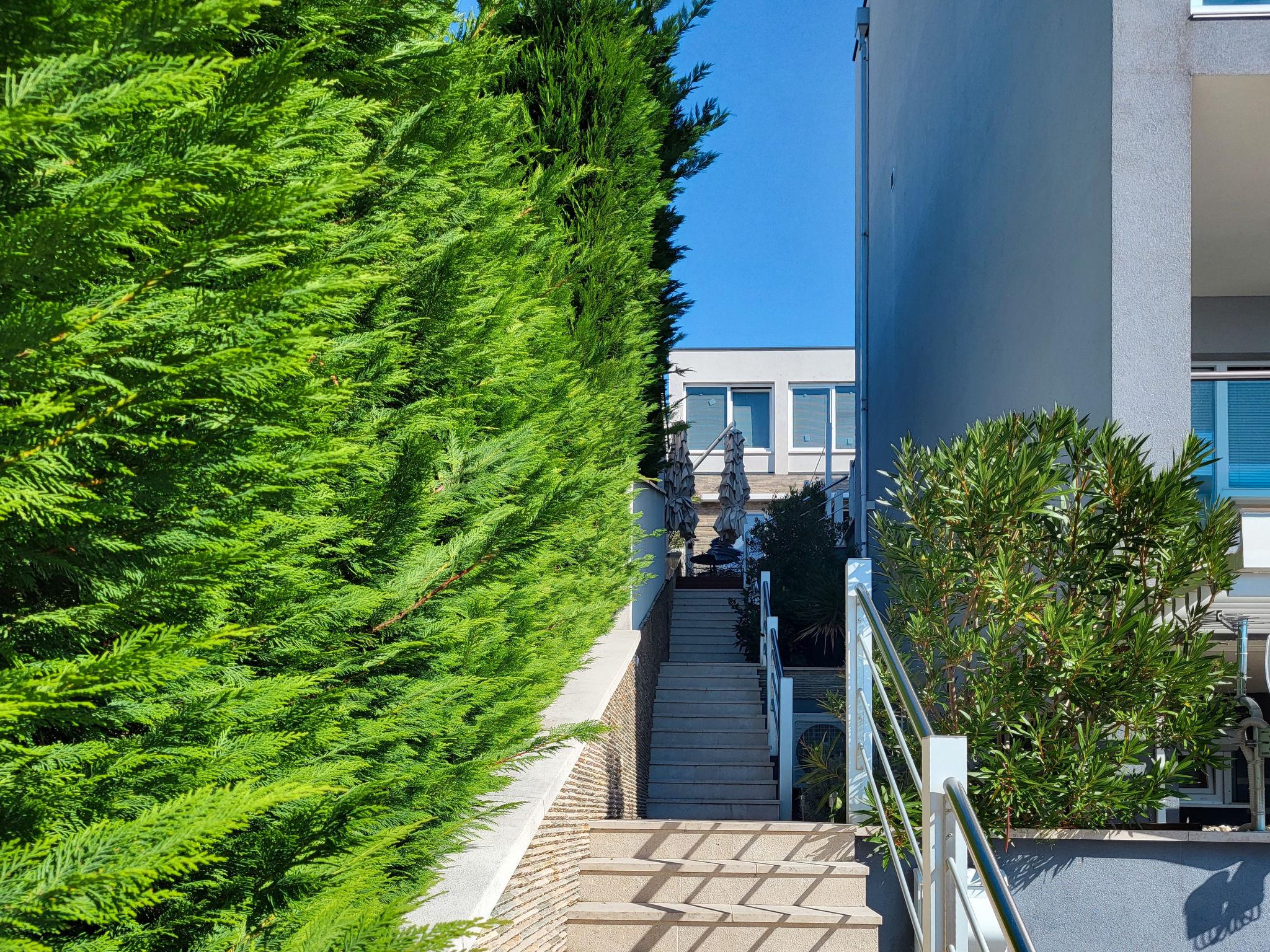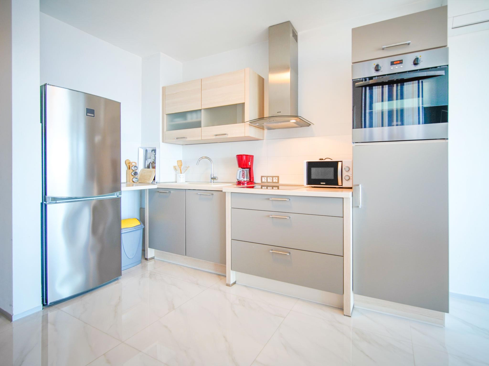 2-room apartment 56 m2 on 2nd floor. Living/dining room with 1 double sofabed (160 cm, length 250 cm), satellite TV and air conditioning. 1 room with 1 french bed (180 cm, length 200 cm). Open kitchen (oven, dishwasher, 4 ceramic glass hob hotplates, toaster, kettle, microwave, freezer, electric coffee machine). Shower/WC. Forced-air heating. Terrace 15 m2. Balcony furniture. Beautiful view of the sea. Facilities: iron, children's high chair, baby cot, hair dryer. Internet (WiFi, free). Please note: private entrance, fire extinguisher.
