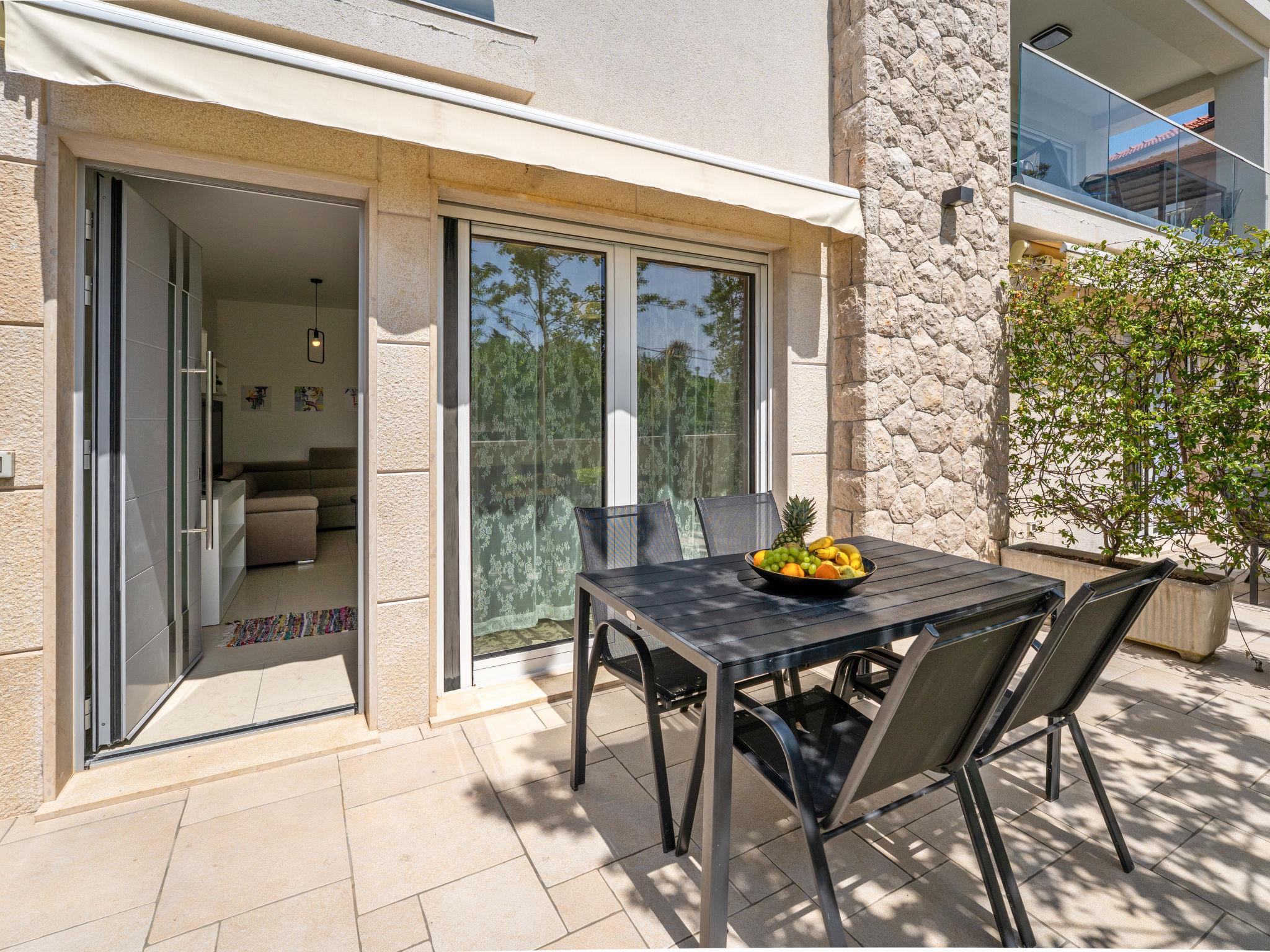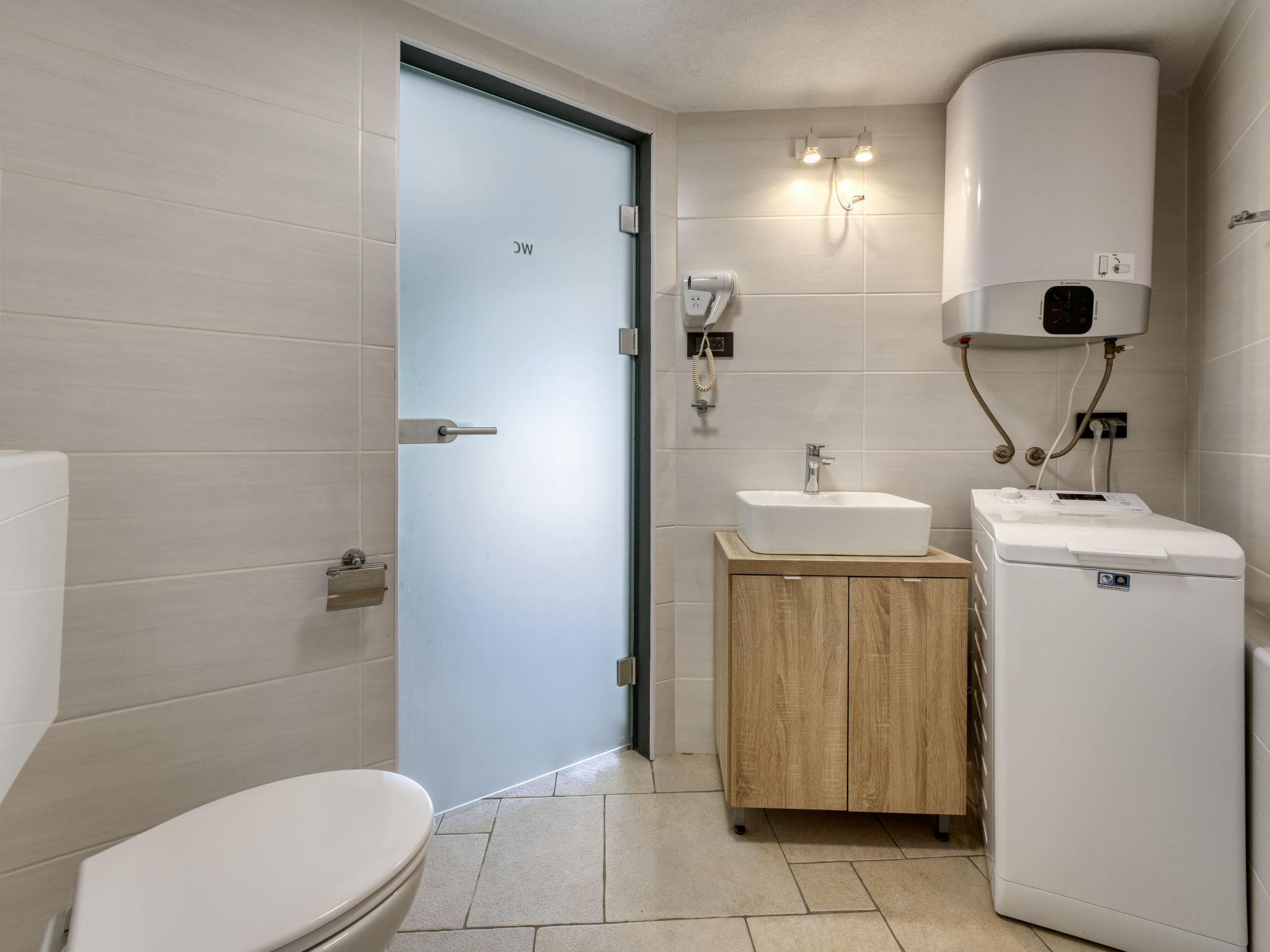 "Dita 2", 3-room apartment 75 m2, on the ground floor. Modern furnishings: living/dining room with 1 double sofabed (140 cm, length 180 cm), satellite TV. 1 room with 1 french bed (160 cm, length 200 cm), satellite TV. 1 room with 2 beds (90 cm, length 200 cm). Open kitchen (dishwasher, 2 induction hot plates, toaster, kettle, microwave, electric coffee machine). Shower/WC, sep. WC. Forced-air heating. Terrace 12 m2. Terrace furniture. Facilities: washing machine, baby cot, hair dryer. Internet (WiFi, free).