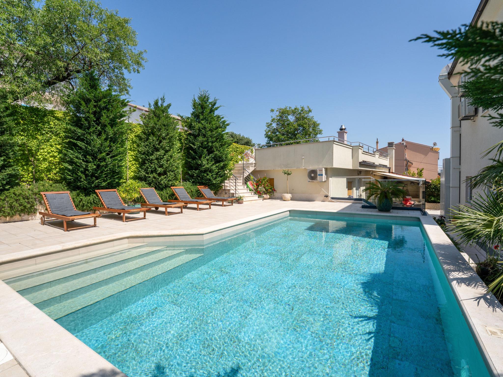 Crikvenica: Modern apartment house "Dita", 3 storeys. 1.3 km from the sea. For shared use: property 900 m2 (fenced), swimming pool angular (8 x 4 m, 32 m2, seasonal availability: 15.May. - 15.Oct.) with internal staircase. Outdoor shower, poolhouse with shower and WC, terrace (70 m2), barbecue. In the complex: internet access, sauna (extra). Parking at the house on the premises. Shop 1.1 km, bus stop 2.2 km, pebble beach 1.3 km. The owner does not accept any youth groups. Please note: the owner lives in the same residence.