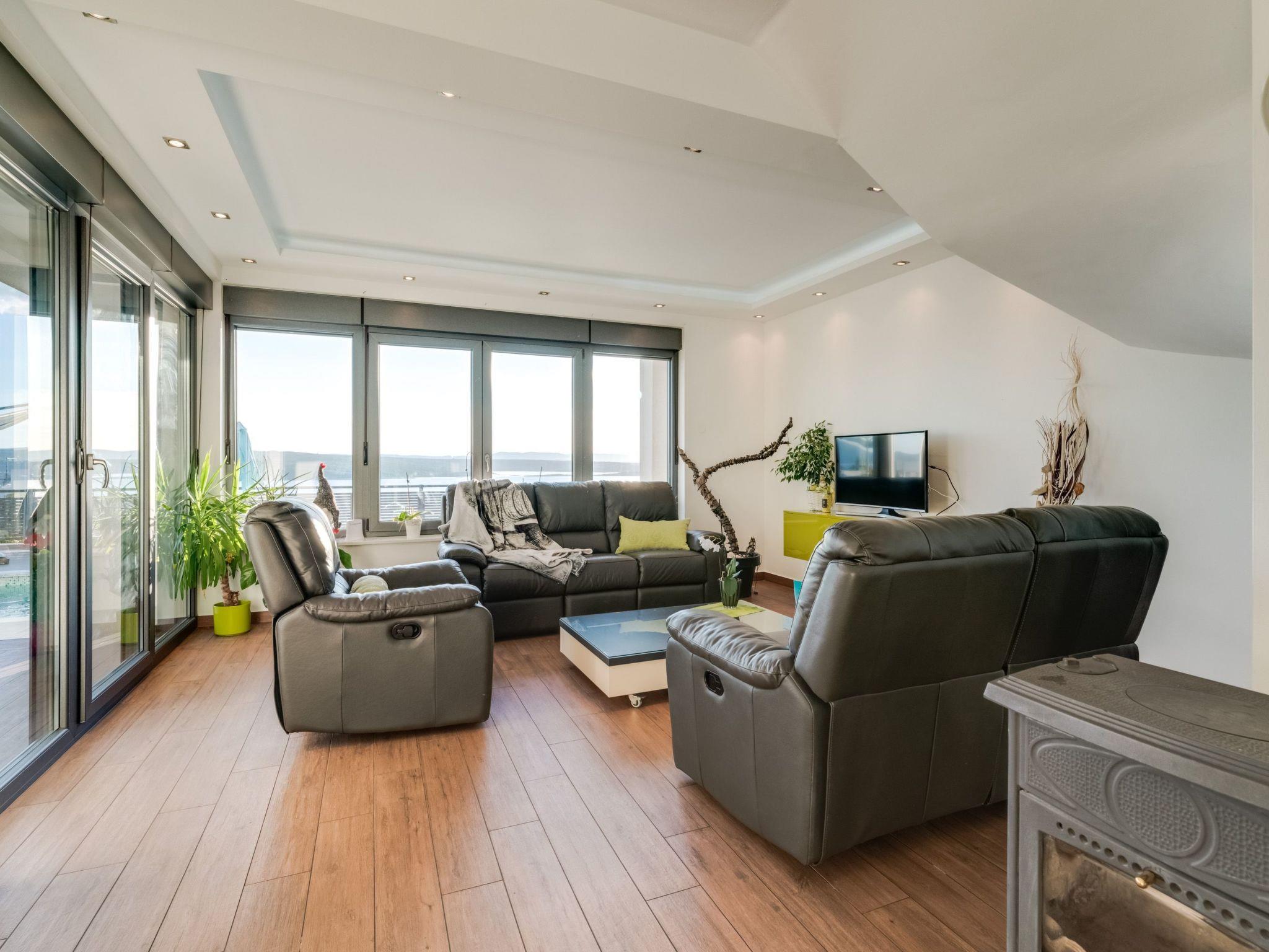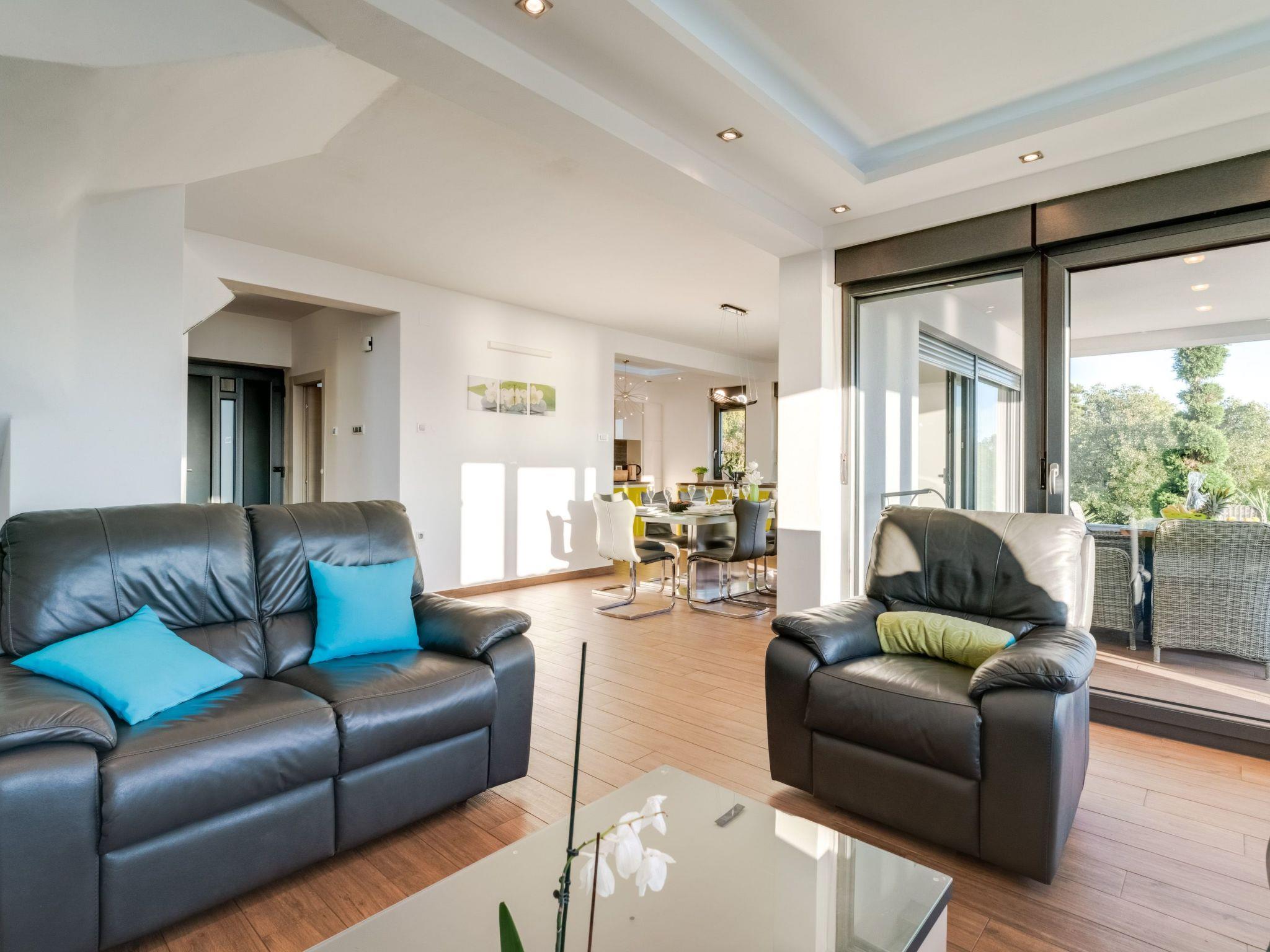 The dining room leads to a large terrace with adjoining pool, from which you can enjoy the grandiose, breathtaking sea view with your family and friends. The villa is located on a 1,500 m2 plot, surrounded by many Mediterranean plants. As the property is completely fenced, your children can be completely undisturbed in the big children's playground.