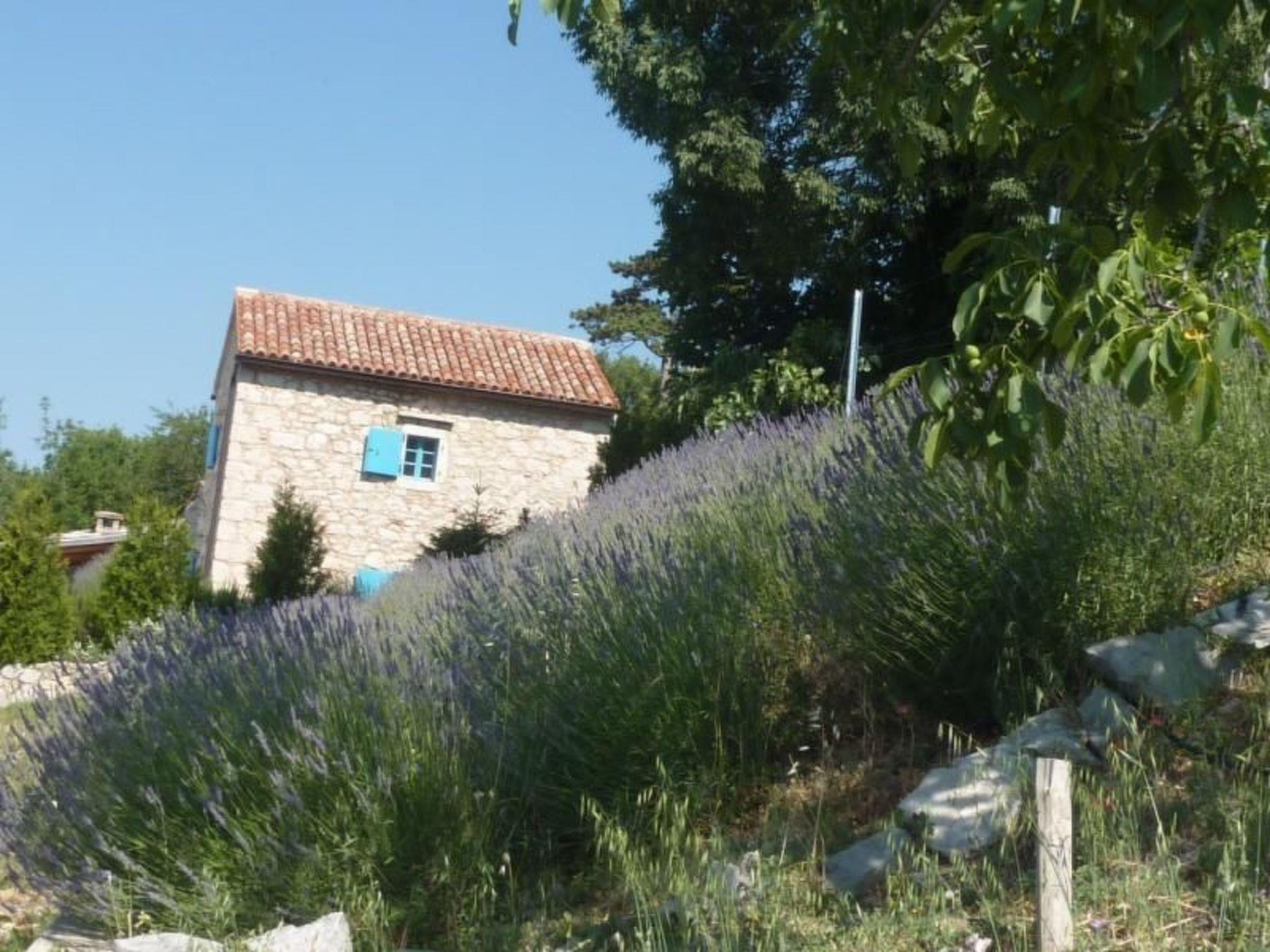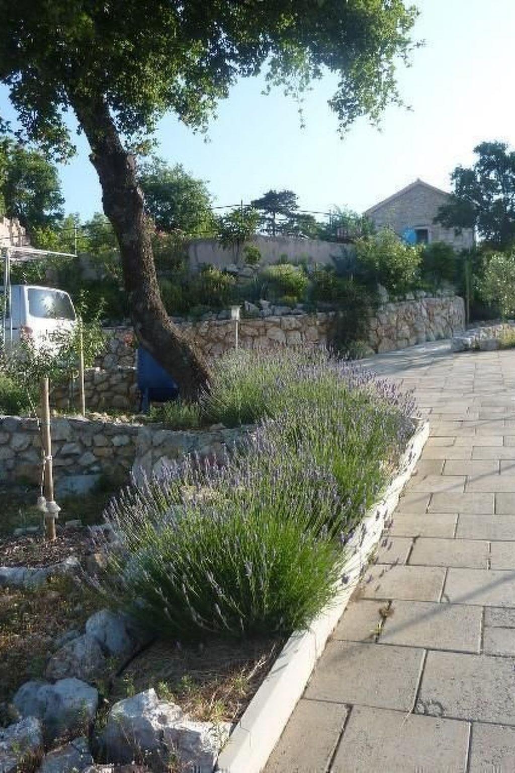 The open plan kitchen is light and leads on to the large shady terrace. The outside dining area next to the pool is a perfect place to relax and enjoy the long summer evenings. It invites also to spend the hot hours of the day in the shade, refreshed by the sight of water, while enjoying an unimpaired view of the Adriatic Sea. On the ground floor, the stairs separate the living room from the kitchen and dinning room. These wooden stairs lead up to the bedroom with the breathtaking view overlooking the picturesque town of Selce and the Adriatic Sea. The bedroom leads out to its very own private upper garden. Apart from the immediate pool area and this upper garden, there are several other lovely terraces and areas for reading and relaxing outdoors.