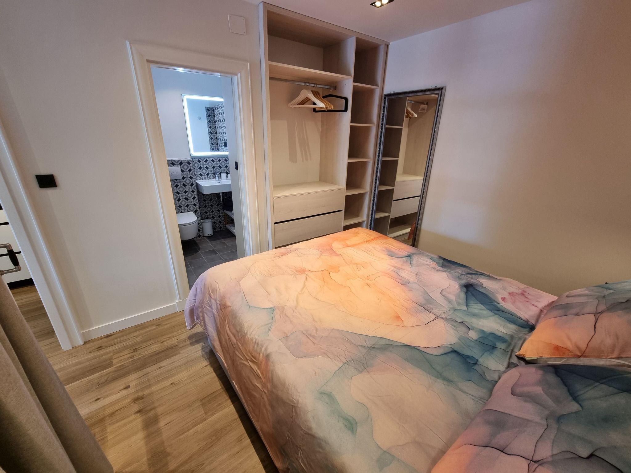 The interior of the apartment is thoughtfully arranged to maximize space and provide everything you need in one open-plan area. The sleeping arrangements include a comfortable couch that doubles as a bed for one person and a cozy double bed, ensuring a good night's sleep for all guests. The apartment is equipped with essential amenities to make your stay as comfortable as possible, including a mini oven, electric kettle, and a coffee machine, perfect for starting your mornings right. A bathroom, neatly separated by a glass door, adds to the convenience of this ground-floor apartment, ensuring privacy and comfort.