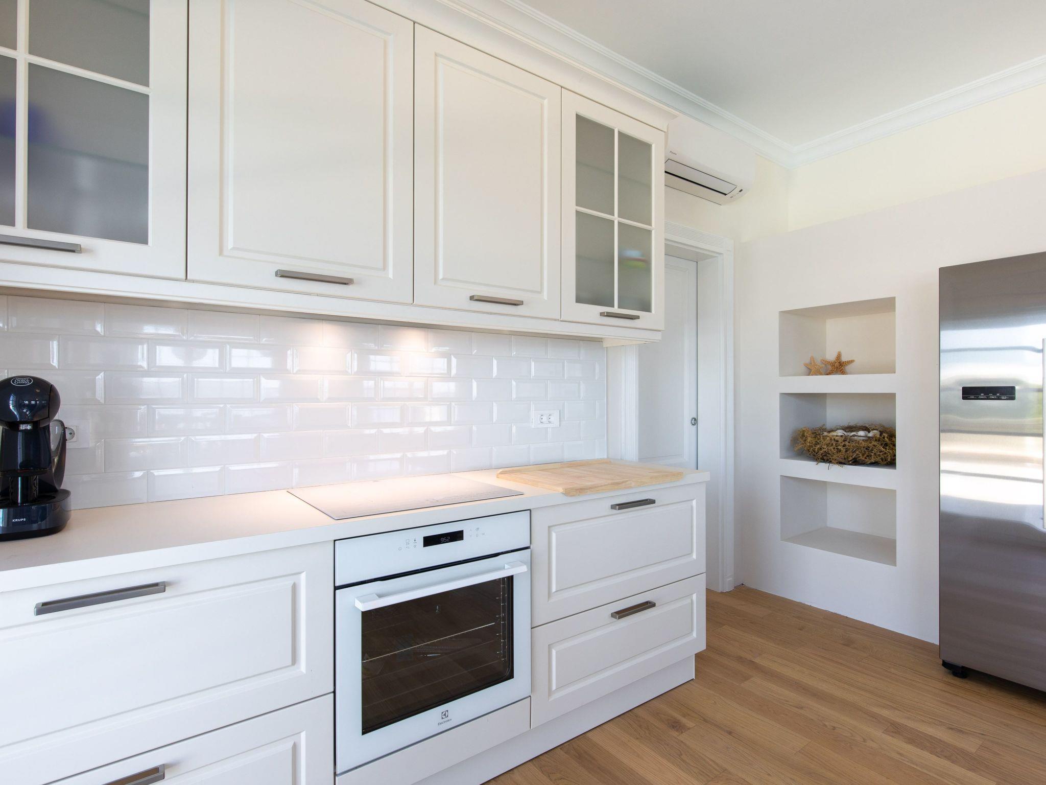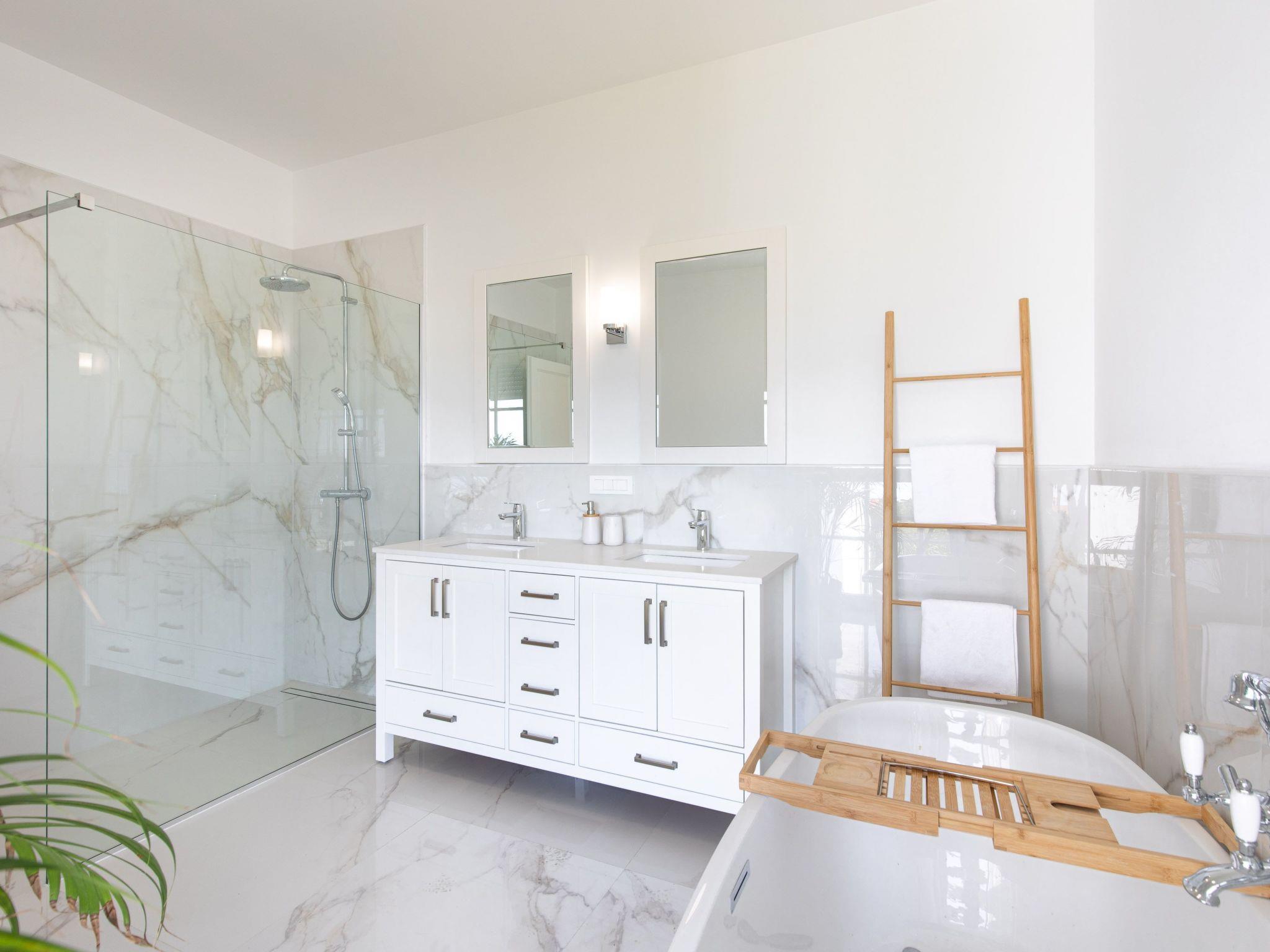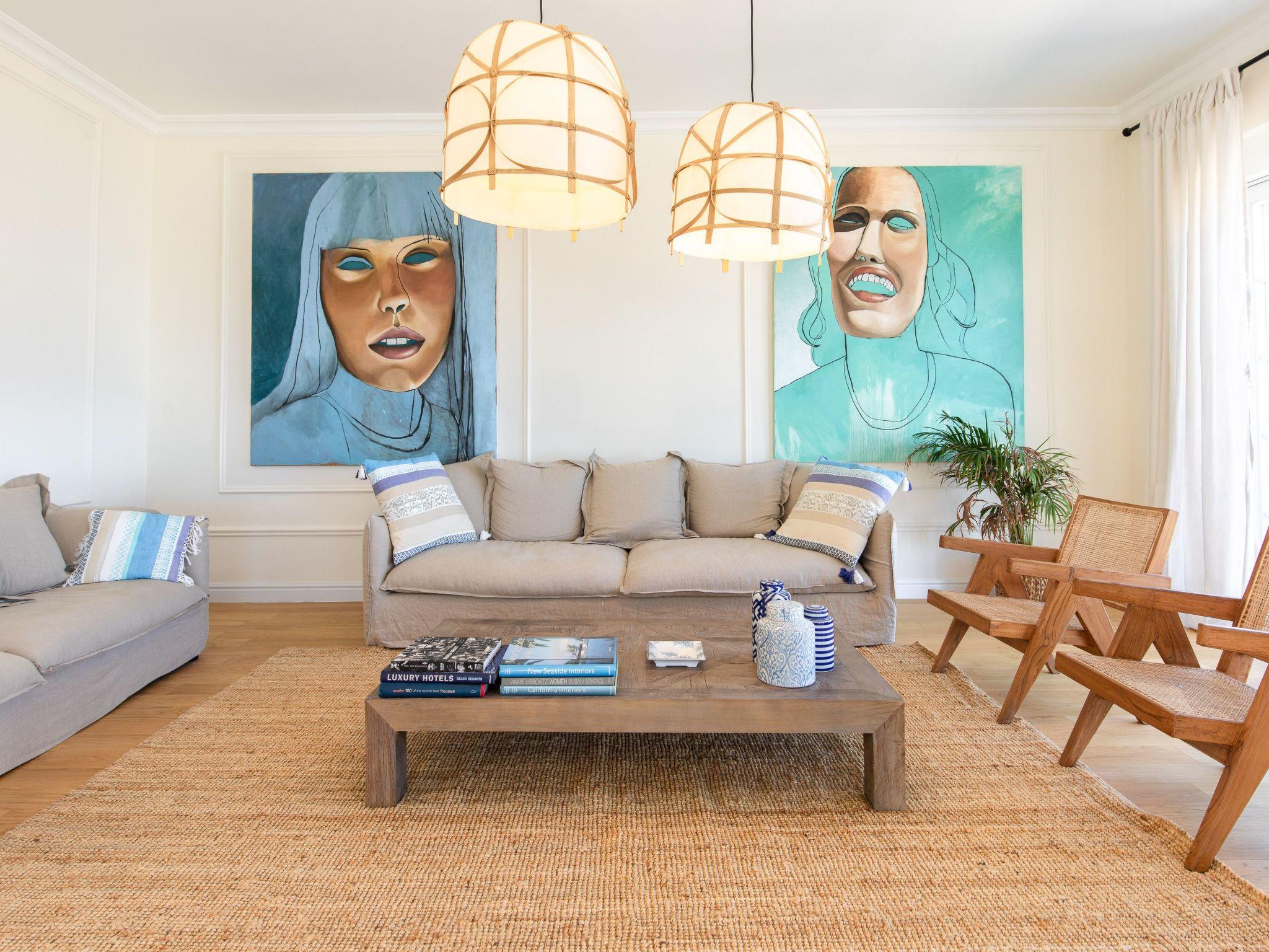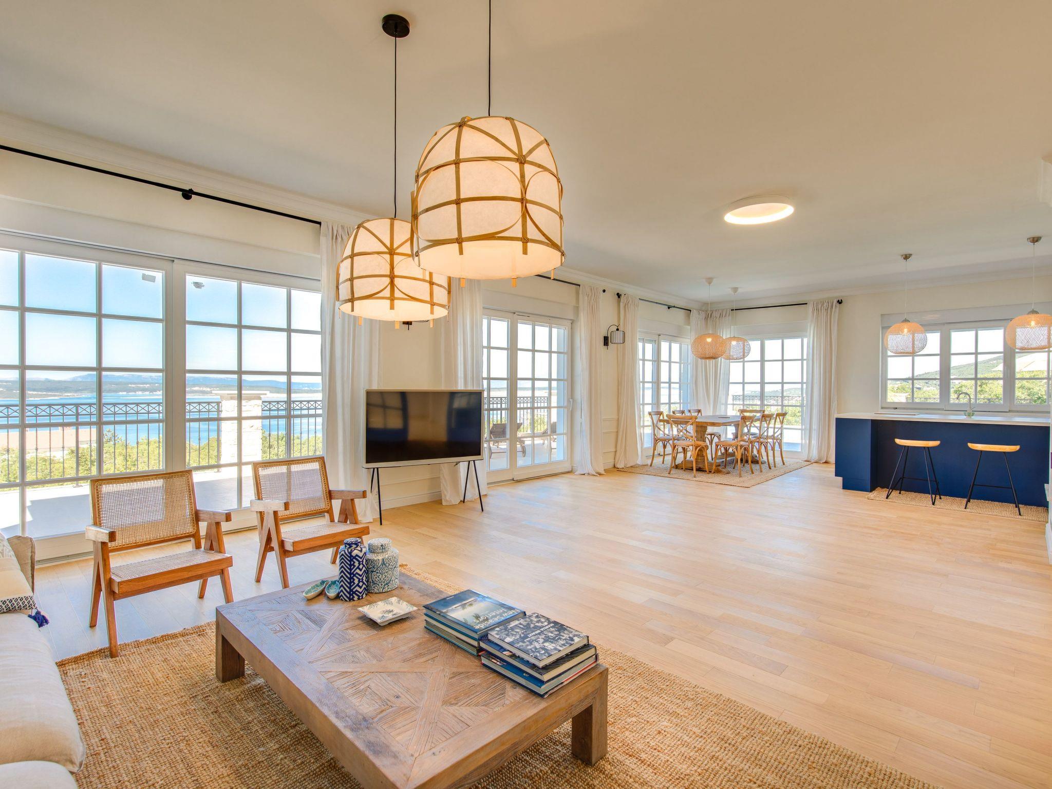 The tastefully and high-quality furnished holiday accommodation has a living space of approx. 400 m², divided over two fully heated and air-conditioned floors. The spacious living room, furnished with hardwood oak parquet flooring and bright, large French doors to the terraces, leads directly into the fully equipped kitchen with adjoining dining area for up to eight people and the pool area with pool house and barbecue area. All four bedrooms have wooden parquet flooring and offer comfortable box-spring beds (1.80 m wide) for a good night's sleep and modern smart TVs for relaxing evening entertainment. The bedrooms each have an en suite bathroom equipped with a walk-in shower, double washbasin, hairdryer and toilet. The two main bedrooms, the master bedrooms, are also equipped with a walk-in wardrobe and the bathrooms are fitted with showers as well as bathtubs. While three of the four bedrooms are located on the ground floor, the fourth is on the first floor and, like the lower bedrooms, benefits from the impressive panoramic sea view. A washing machine for free use completes the facilities of this luxurious holiday accommodation. A travel cot and high chair can be booked in advance at no extra charge.