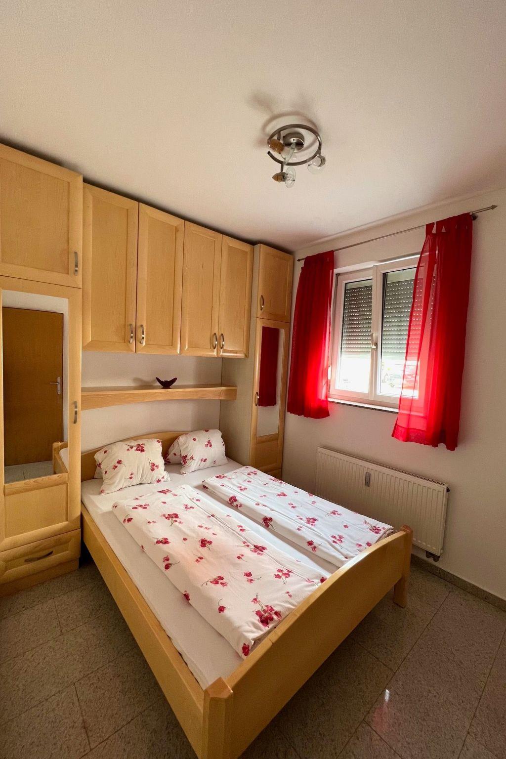 This ground-floor apartment of measuring 40m² comprises a double room, a shower room and a combined living and dining room. The bedroom is furnished with a double bed with a large wall cupboard combination with a headpiece, with two double-door wardrobes and other storage space for your luggage. The centrepiece of the apartment is the living room with an open kitchen unit in the front part, equipped with two cooking rings, a fridge, microwave, coffee machine and kettle for practical self-catering. Behind the kitchen unit there is a dining table with four bar stools, as well as a corner sofa with a coffee table and a wall-mounted flatscreen TV. The bathroom is fitted with a shower cubicle, a washbasin with a wall cupboard and mirror, and a WC. There is a pleasant indoor temperature owing to the air conditioning.