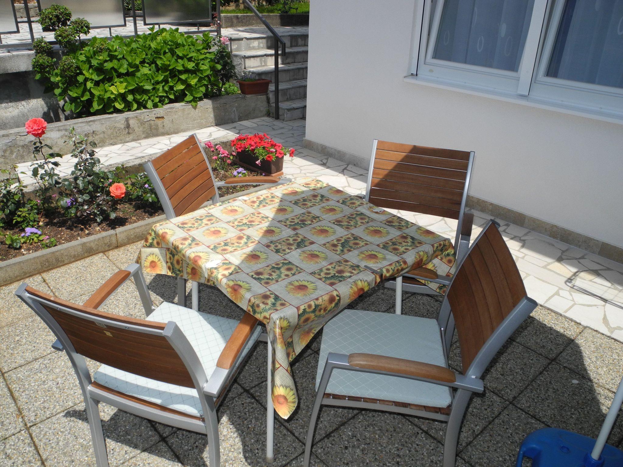 Outside, the private terrace presents the perfect spot for morning coffees or evening relaxation. It's an intimate space where guests can enjoy the tranquil ambiance of the surroundings, perhaps with a book or simply soaking in the calmness of the area. This outdoor area adds an extra layer of enjoyment to your stay, offering a private slice of the beautiful Crikvenica setting.