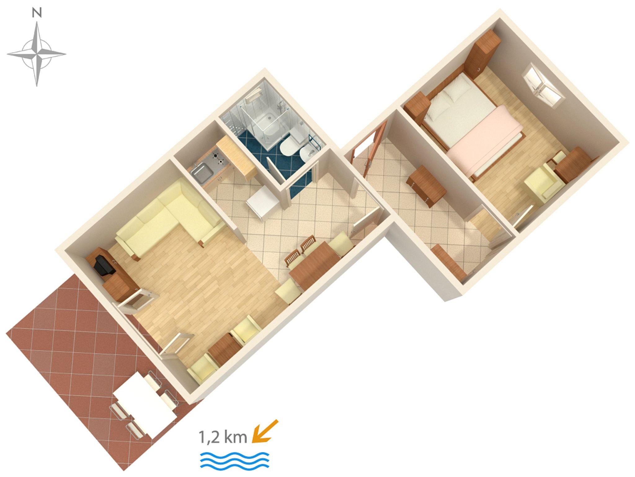 Ferienwohnung bietet Platz für 4 Gäste. Die Betten sind in Schlafzimmern, die es 1 gibt, und in Wohnzimmer, innerhalb einer Gesamtfläche von 34m2, angeordnet. Die Gäste haben eine eigene Terrasse zur Verfügung, auf der sie in warmen Sommernächten genießen können. Es ist erlaubt, Speisen auf dem Gemeinschafts-Grill vorzubereiten. IM PREIS INBEGRIFFEN: Kurtaxe, Endreinigung, Klimatisierung, Parkplatz, Internet, Bügeleisen, Bügelbrett, Föhn. VERBINDLICHE ZUSÄTZLICHE KOSTEN: Aufzahlung für Kurzaufenthalte (prozentualer Zuschlag pro Nächtigungsanzahl: 30% - 1, 20% - 2, 10% - 3). UNVERBINDLICHE ZUSÄTZLICHE KOSTEN: Wäschewaschen (5,00 € Waschen). Die Verfügbarkeit zusätzlicher Dienstleistungen in Ihrem reservierten Termin und die Preise derselben (falls nicht aufgeführt) müssen im Voraus überprüft werden. Zusätzliche Dienstleistungen die in der Zahlungsaufforderung nicht aufgeführt sind werden direkt beim Vermieter bezahlt, angenommen der Gast nutzt auch diese.