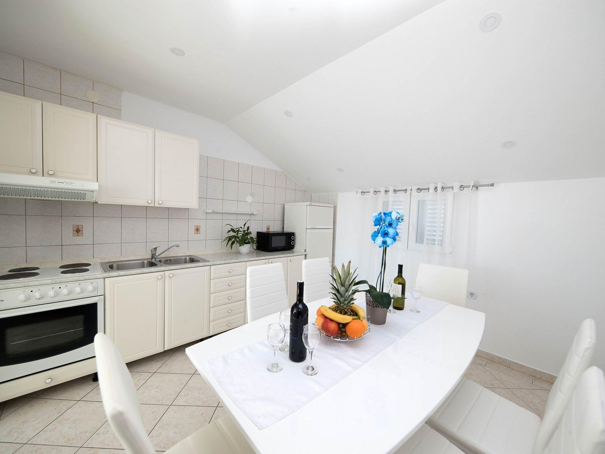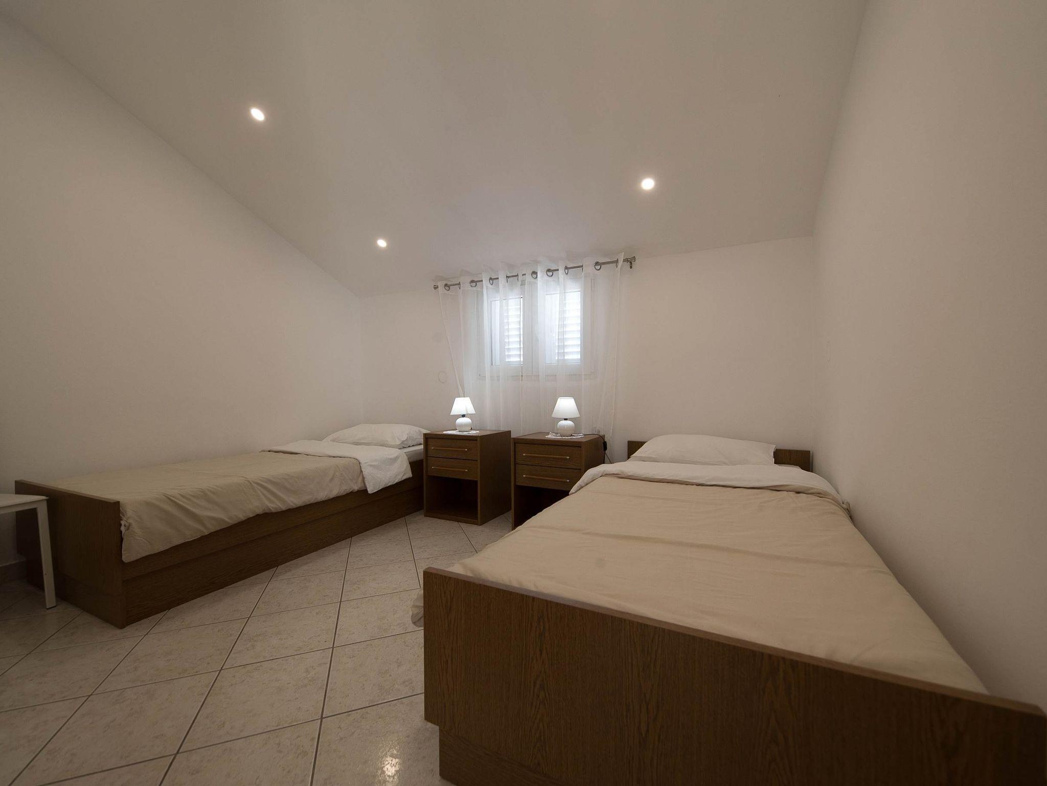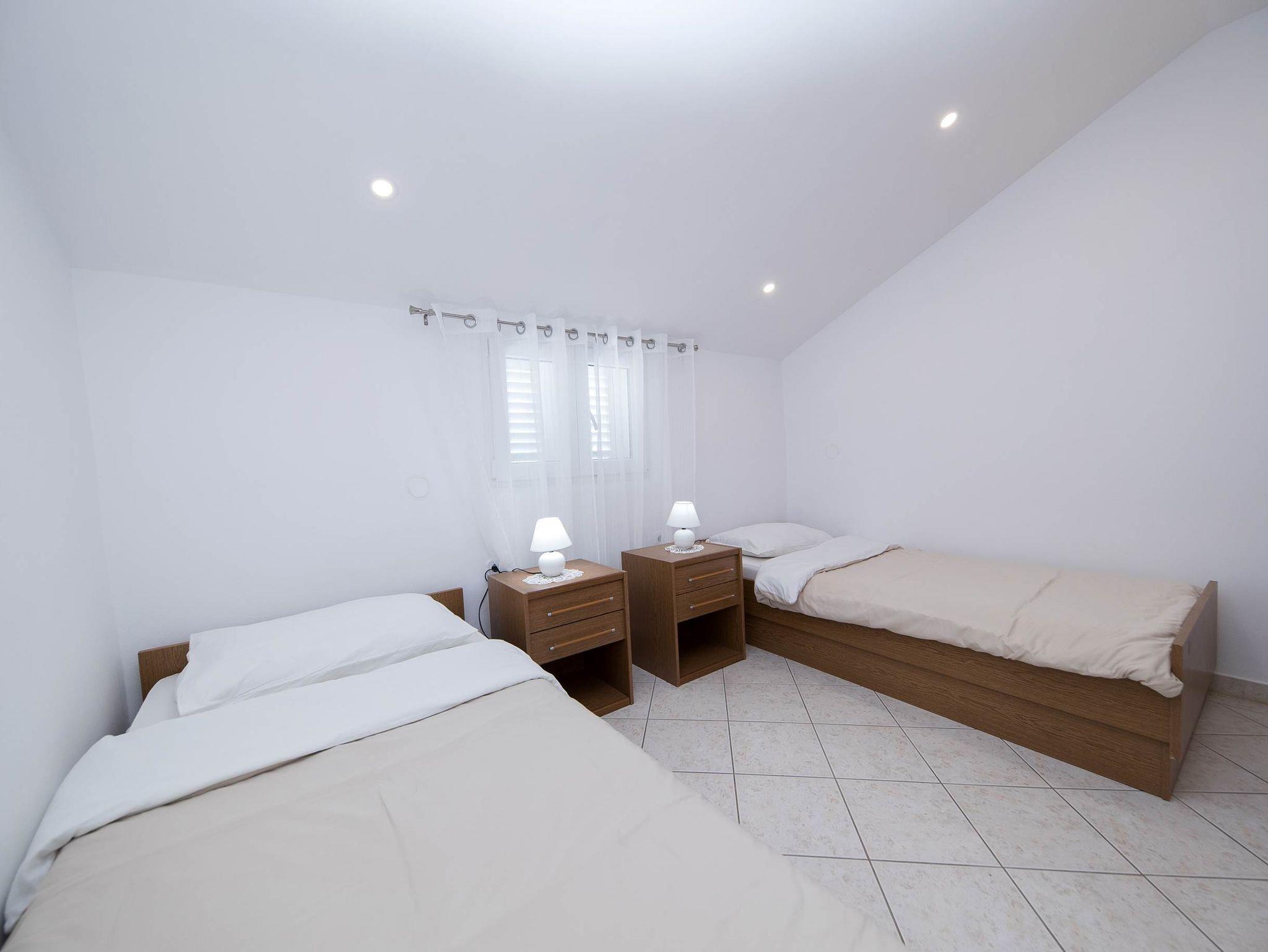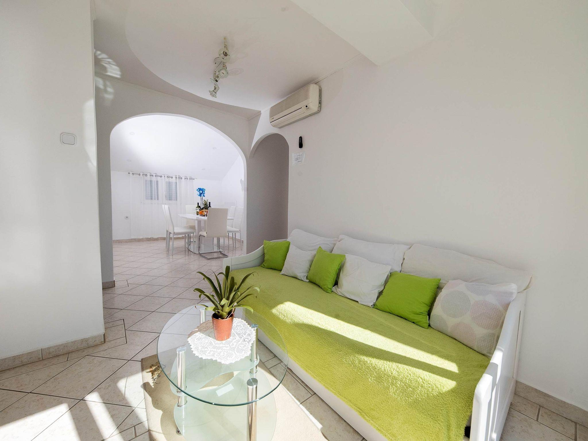 Ferienwohnung bietet Platz für 5 Gäste. Die Betten sind in Schlafzimmern, die es 2 gibt, und in Wohnzimmer, innerhalb einer Gesamtfläche von 47m2, angeordnet. Die Gäste haben eine eigene Terrasse zur Verfügung, auf der sie in warmen Sommernächten genießen können. Das Apartment bietet Meerblick. Es ist erlaubt, Speisen auf dem Gemeinschafts-Grill vorzubereiten. Während ihres Aufenthalts können Gäste das gemeinsam zur Nutzung stehende Schwimmbad benutzen. Räume der gebuchten Unterkunftseinheit werden nicht in eine Ganze verbunden. IM PREIS INBEGRIFFEN: Kurtaxe, Endreinigung, Klimatisierung, Pool, Parkplatz, Internet, Kinderbett, Bügeleisen, Bügelbrett, Föhn. VERBINDLICHE ZUSÄTZLICHE KOSTEN: Aufzahlung für Kurzaufenthalte (prozentualer Zuschlag pro Nächtigungsanzahl: 30% - 1, 20% - 2, 10% - 3). Die Verfügbarkeit zusätzlicher Dienstleistungen in Ihrem reservierten Termin und die Preise derselben (falls nicht aufgeführt) müssen im Voraus überprüft werden. Zusätzliche Dienstleistungen die in der Zahlungsaufforderung nicht aufgeführt sind werden direkt beim Vermieter bezahlt, angenommen der Gast nutzt auch diese. Ermäßigung auf den Grundpreis: Gratistag 14=13 (bei einem Aufenthalt von 14 Tagen oder mehr erhalten Sie einen Gratistag für den Aufenthalt bis 31.12.26).