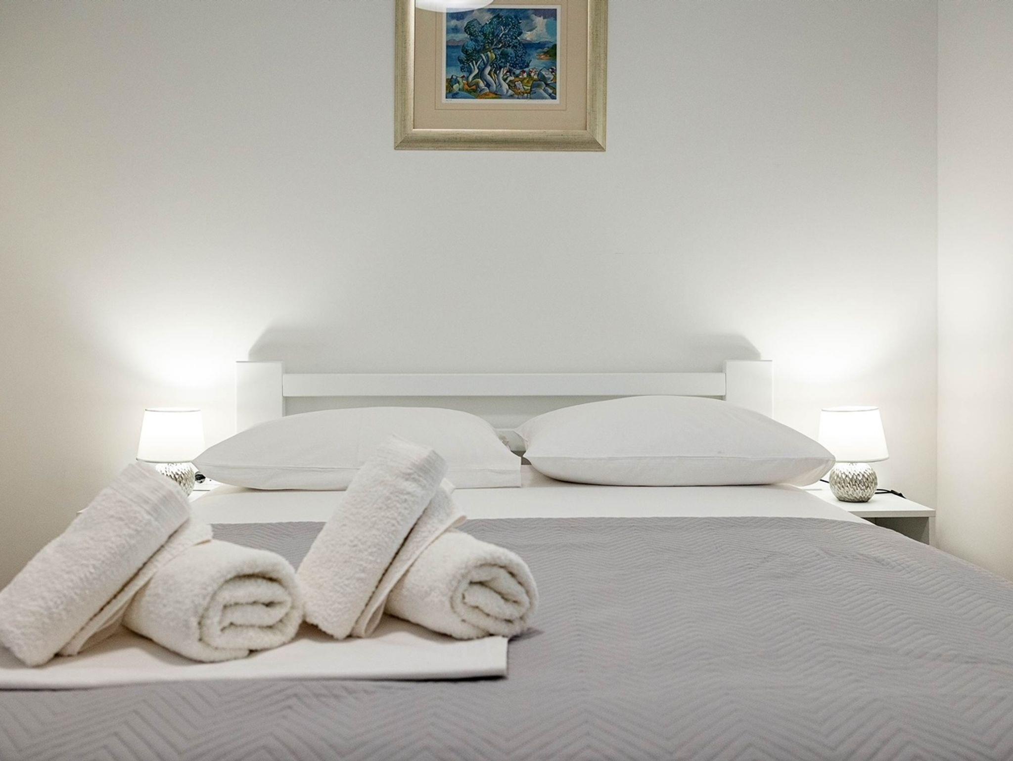 Ferienwohnung bietet Platz für 4 Gäste. Die Betten sind in Schlafzimmern, die es 1 gibt, und in Wohnzimmer, innerhalb einer Gesamtfläche von 53m2, angeordnet. Die Gäste haben eine eigene Terrasse zur Verfügung, auf der sie in warmen Sommernächten genießen können. IM PREIS INBEGRIFFEN: Kurtaxe, Endreinigung, Klimatisierung, Parkplatz, Internet, Bügeleisen, Bügelbrett, Föhn. VERBINDLICHE ZUSÄTZLICHE KOSTEN: Aufzahlung für Kurzaufenthalte (prozentualer Zuschlag pro Nächtigungsanzahl: 30% - 1, 20% - 2, 10% - 3). UNVERBINDLICHE ZUSÄTZLICHE KOSTEN: Wäschewaschen (5,00 € Waschen). Die Verfügbarkeit zusätzlicher Dienstleistungen in Ihrem reservierten Termin und die Preise derselben (falls nicht aufgeführt) müssen im Voraus überprüft werden. Zusätzliche Dienstleistungen die in der Zahlungsaufforderung nicht aufgeführt sind werden direkt beim Vermieter bezahlt, angenommen der Gast nutzt auch diese.
