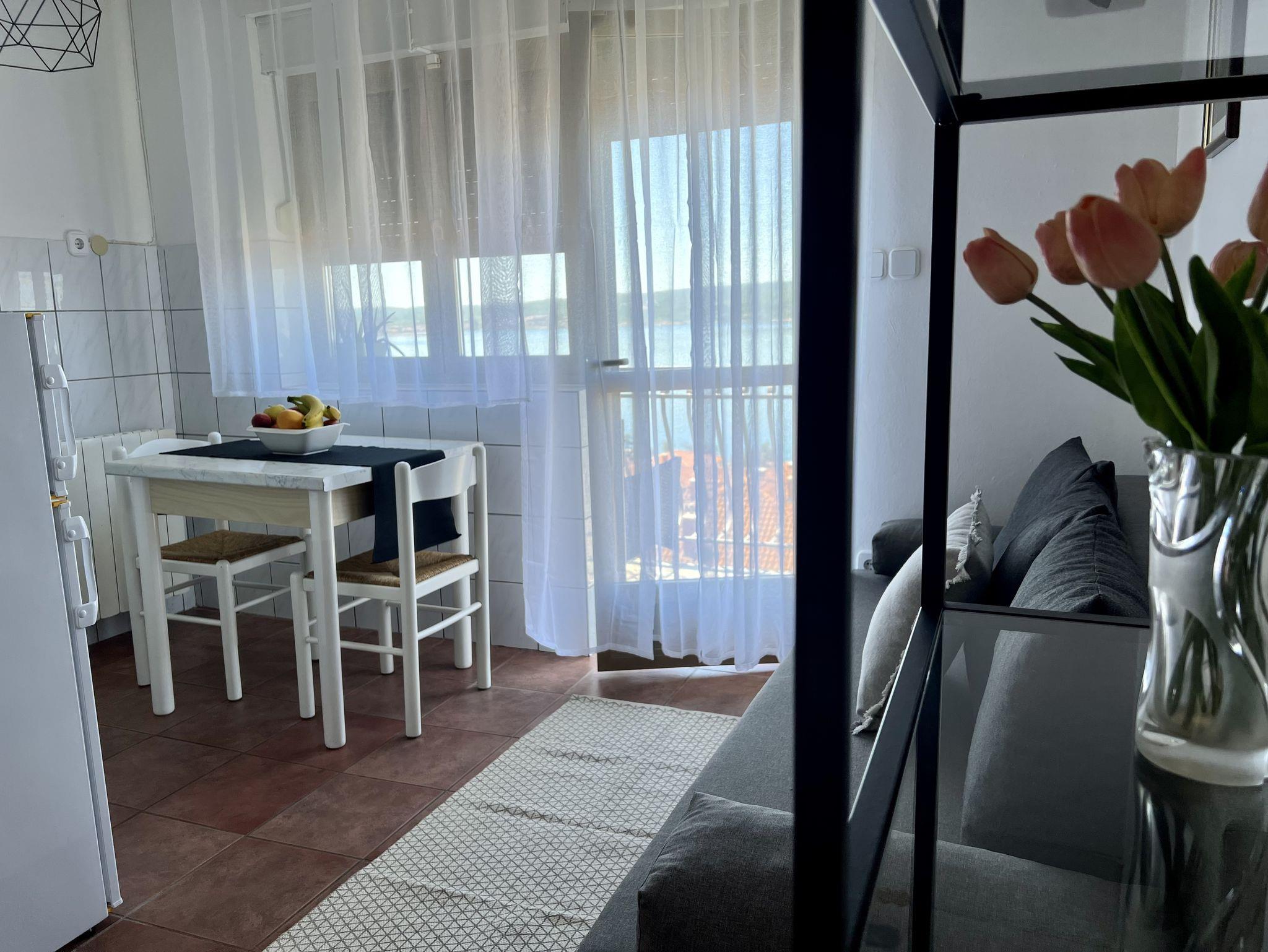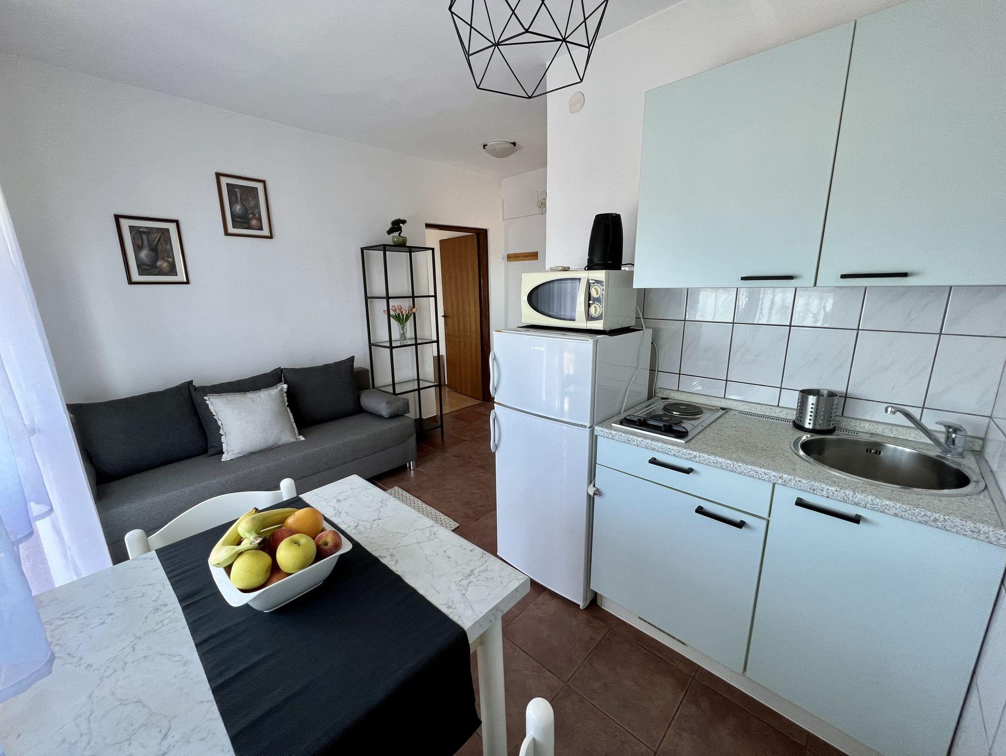 Ferienwohnung bietet Platz für 4 Gäste. Die Betten sind in Schlafzimmern, die es 1 gibt, und in Esszimmer, innerhalb einer Gesamtfläche von 26m2, angeordnet. Die Gäste haben einen eigenen Balkon zur Verfügung, auf der sie in warmen Sommernächten genießen können. Das Apartment bietet Meerblick. Es ist erlaubt, Speisen auf dem Gemeinschafts-Grill vorzubereiten. In der Unterkunftseinheit besteht die Möglichkeit des Mitbringens von Haustieren gegen Aufpreis. IM PREIS INBEGRIFFEN: Kurtaxe, Endreinigung, Klimatisierung, Internet. VERBINDLICHE ZUSÄTZLICHE KOSTEN: Aufzahlung für Kurzaufenthalte (prozentualer Zuschlag pro Nächtigungsanzahl: 30% - 1, 20% - 2, 10% - 3). UNVERBINDLICHE ZUSÄTZLICHE KOSTEN: Wäschewaschen (5,00 € Waschen), Haustiere (5,00 € pro Nacht). Die Verfügbarkeit zusätzlicher Dienstleistungen in Ihrem reservierten Termin und die Preise derselben (falls nicht aufgeführt) müssen im Voraus überprüft werden. Zusätzliche Dienstleistungen die in der Zahlungsaufforderung nicht aufgeführt sind werden direkt beim Vermieter bezahlt, angenommen der Gast nutzt auch diese. Ermäßigung auf den Grundpreis: Gratistag 14=13 (bei einem Aufenthalt von 14 Tagen oder mehr erhalten Sie einen Gratistag für den Aufenthalt bis 31.12.26).
