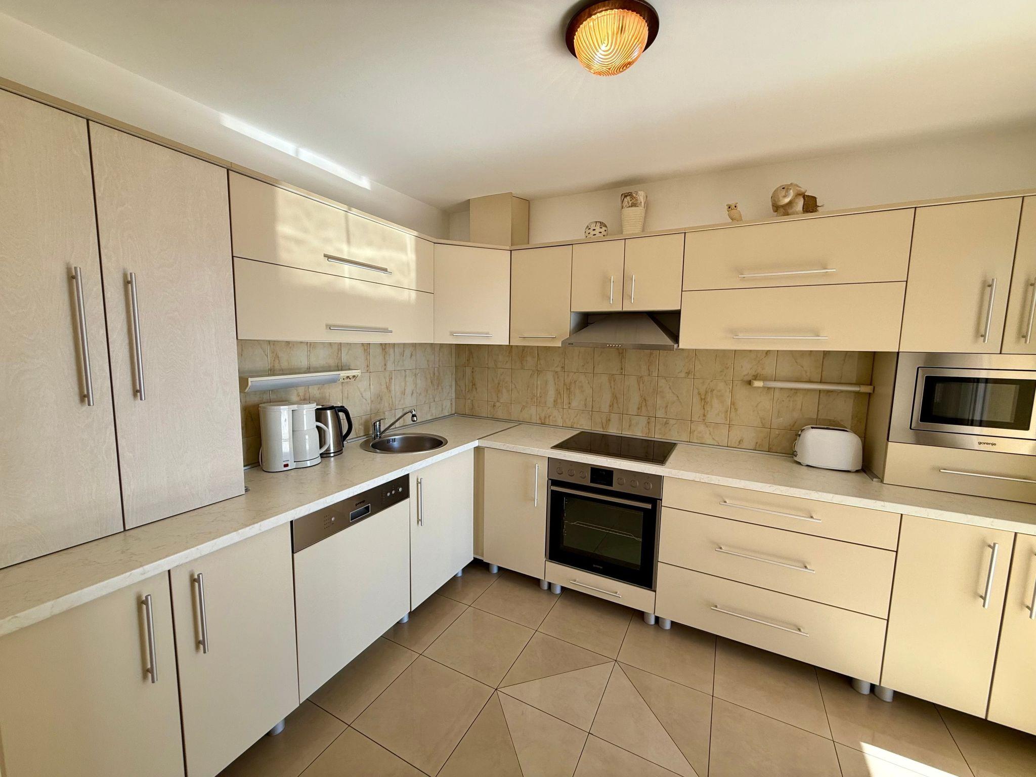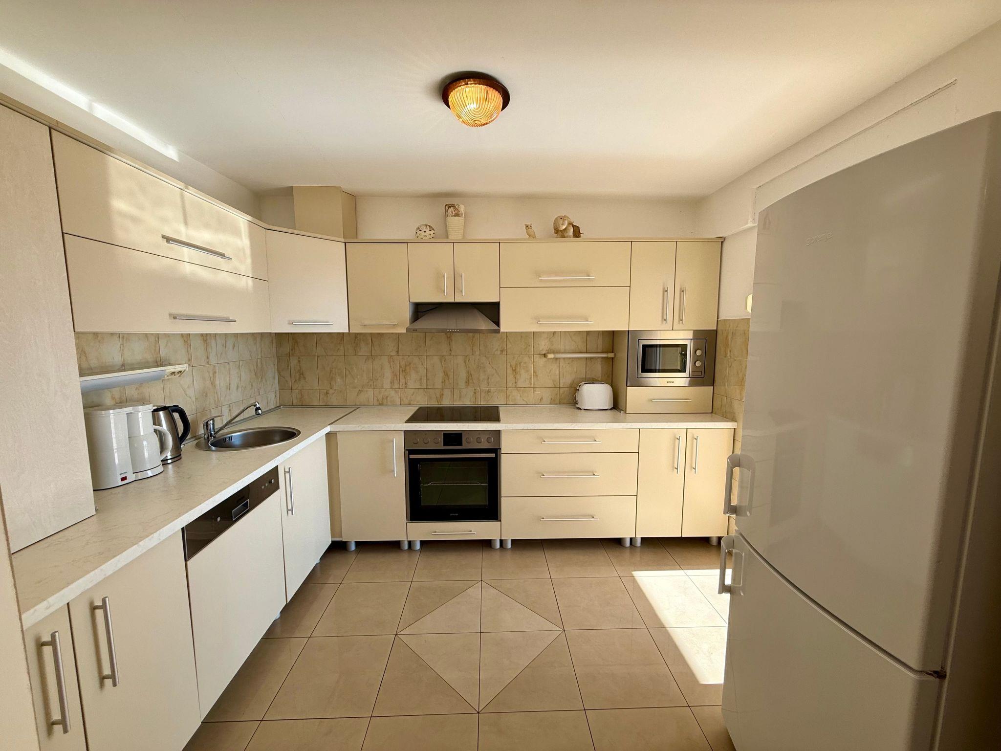 Inside the flat, you will find three bedrooms that offer peaceful sleep after an eventful day. There is also a bathroom with a bathtub, which promises welcome relaxation after long hikes or days spent swimming. The partial air conditioning ensures pleasant temperatures in the warmer months. A practical kettle is available for your morning coffee or tea time to get your day off to a gentle start.
