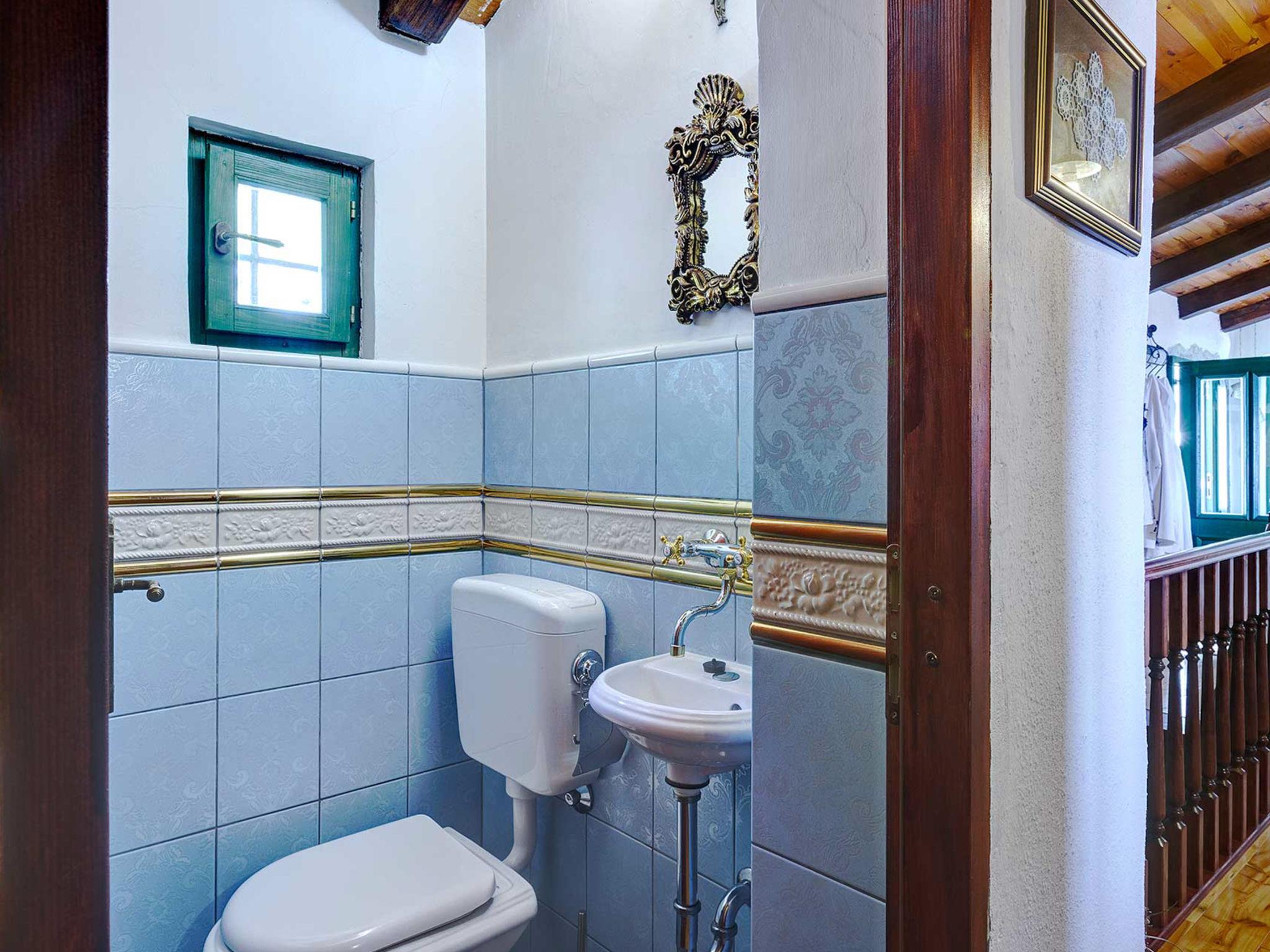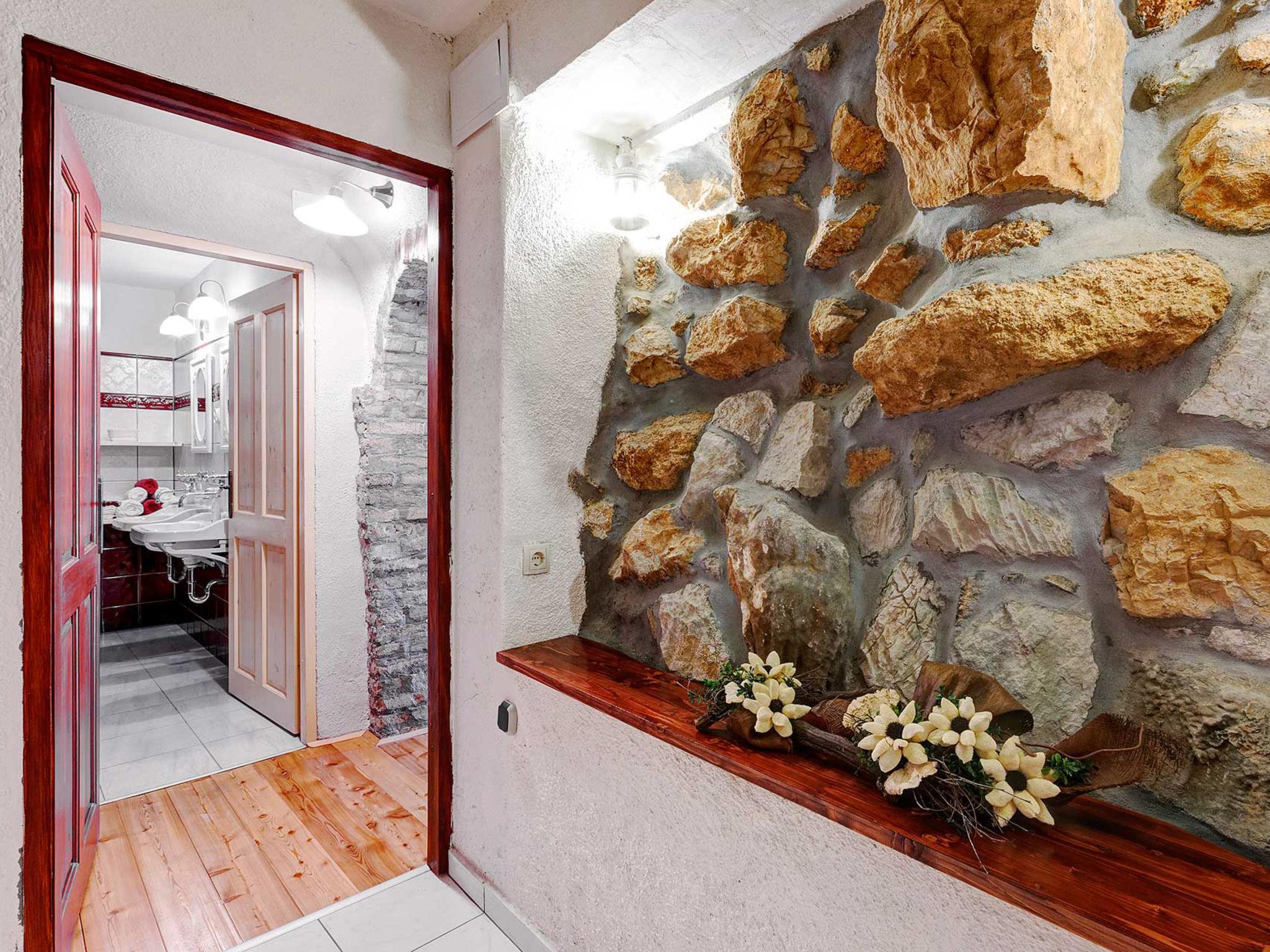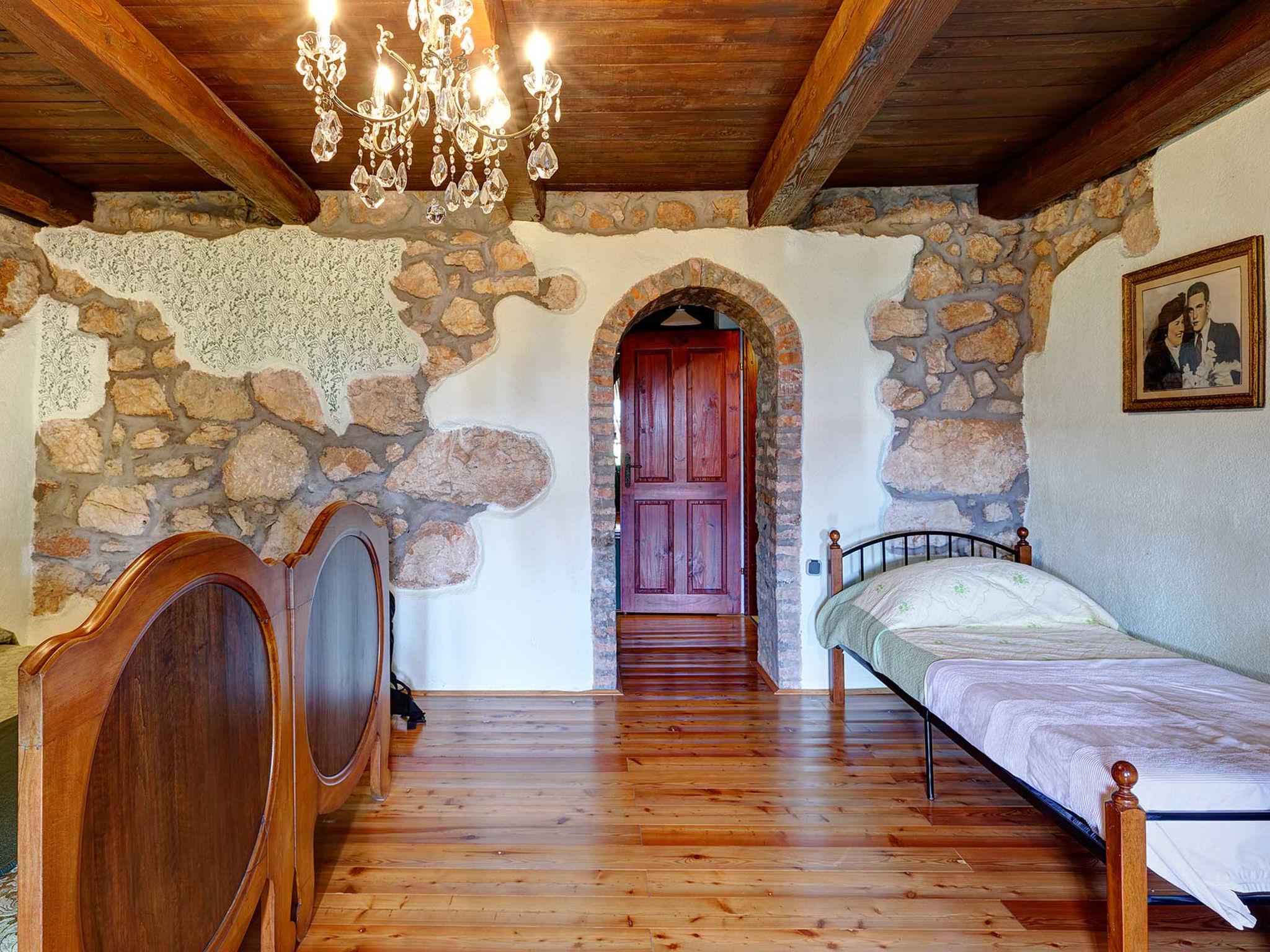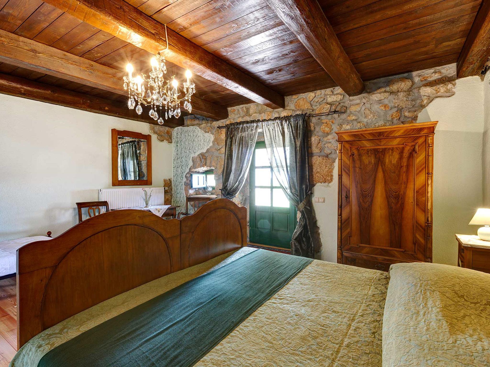 4-room house 242 m2. Living room with open-hearth fireplace, satellite TV and air conditioning. Exit to the terrace. 1 room with 1 french bed (140 cm, length 200 cm). Open kitchen (4 hot plates, oven, dishwasher, toaster, kettle, microwave, freezer, electric coffee machine) with dining table. Exit to the terrace. Sep. WC. On the lower ground floor: 2 rooms, each room with 1 bed (90 cm, length 200 cm), 1 french bed (180 cm, length 200 cm), shower/WC. Facilities: safe, iron, mosquito net, hair dryer. Internet (WiFi, free). Please note: fire extinguisher.