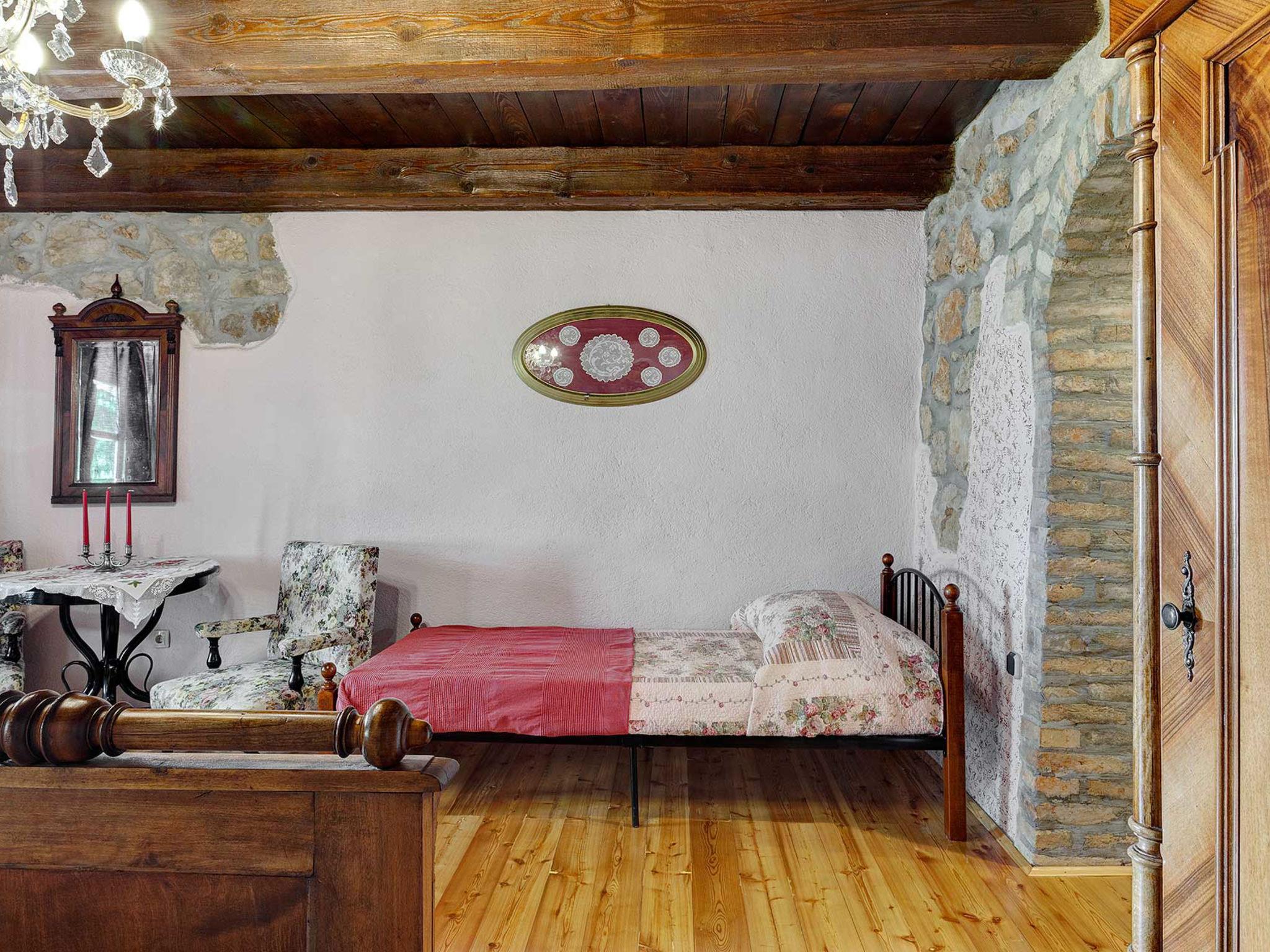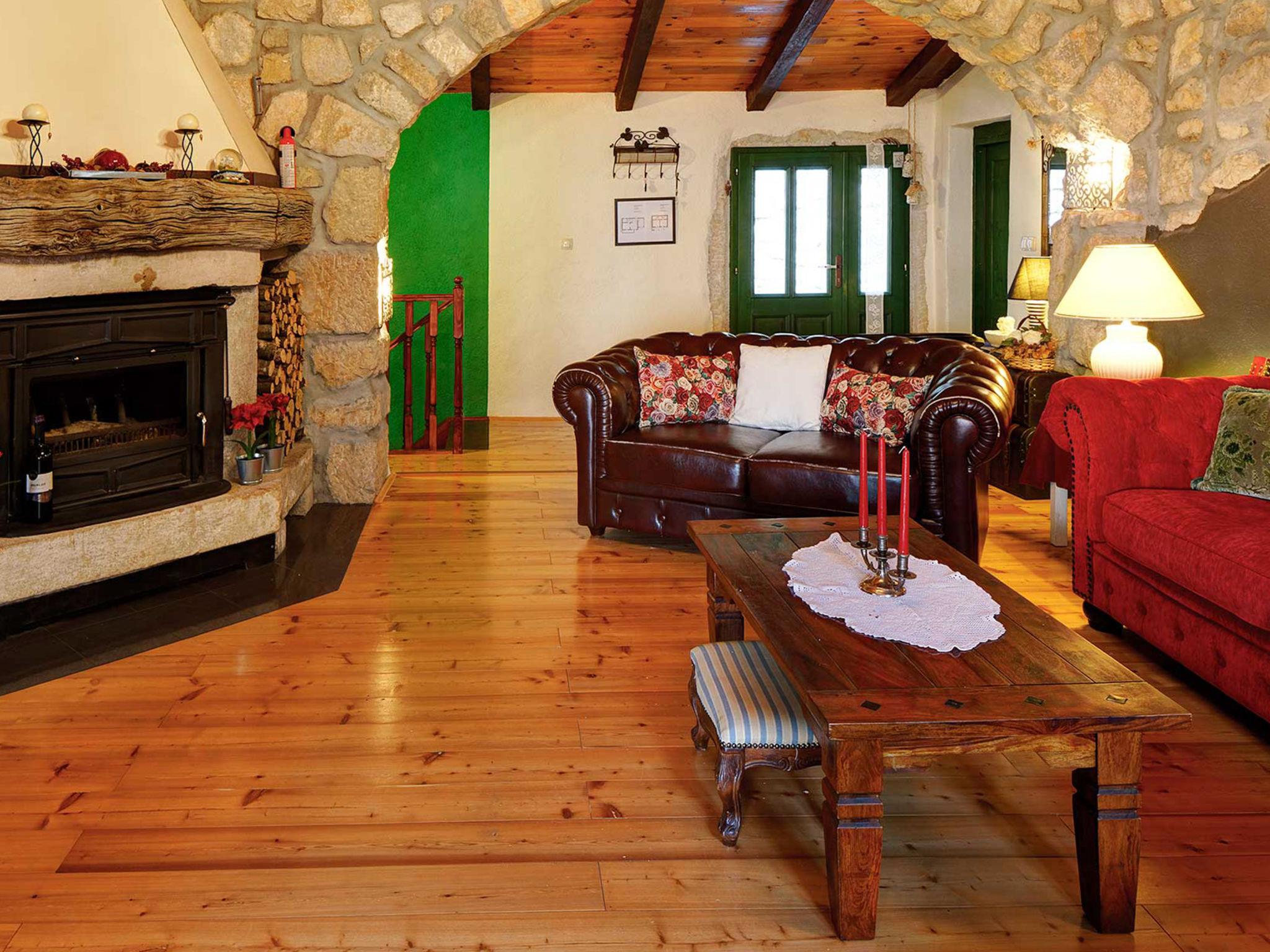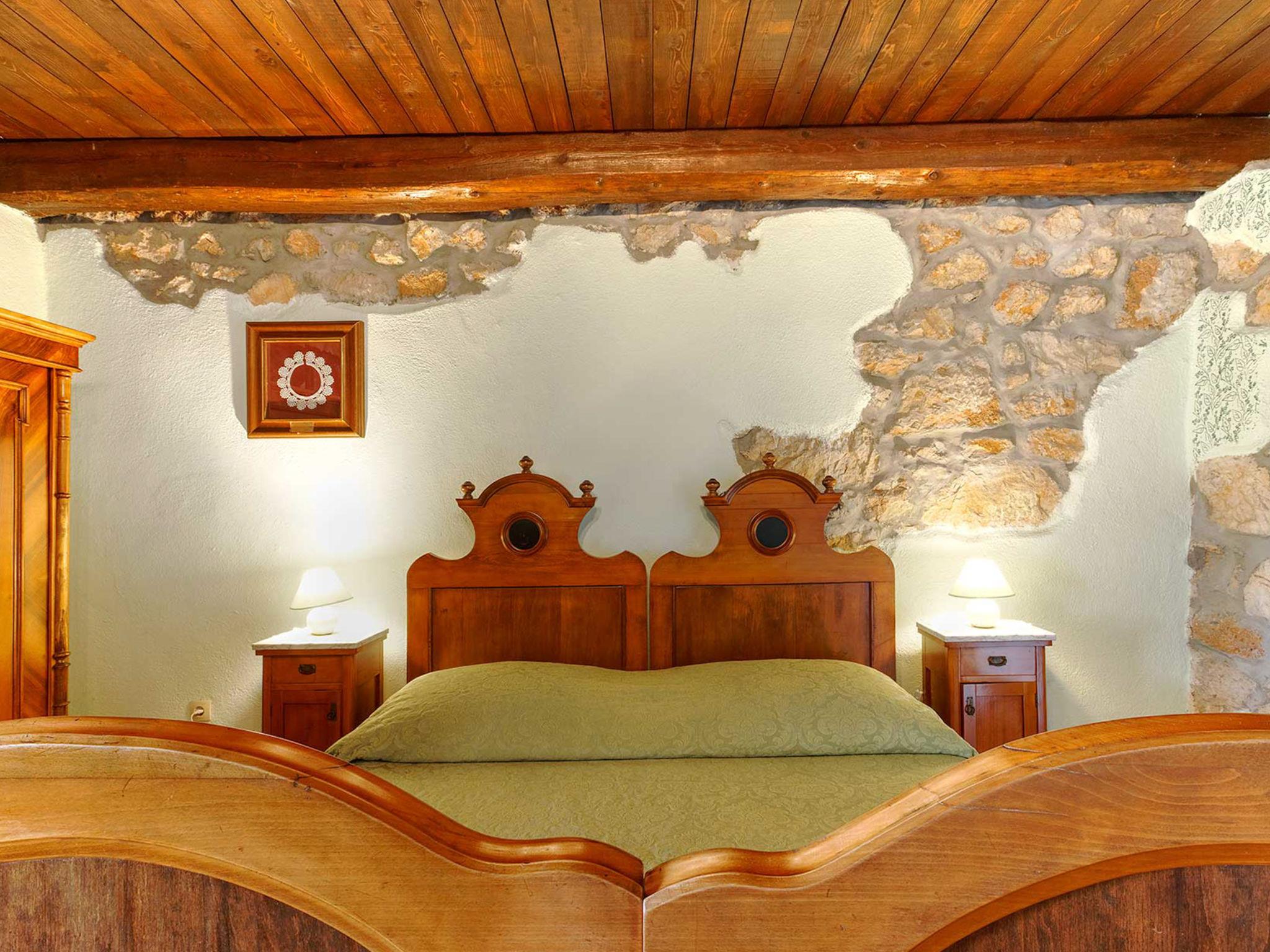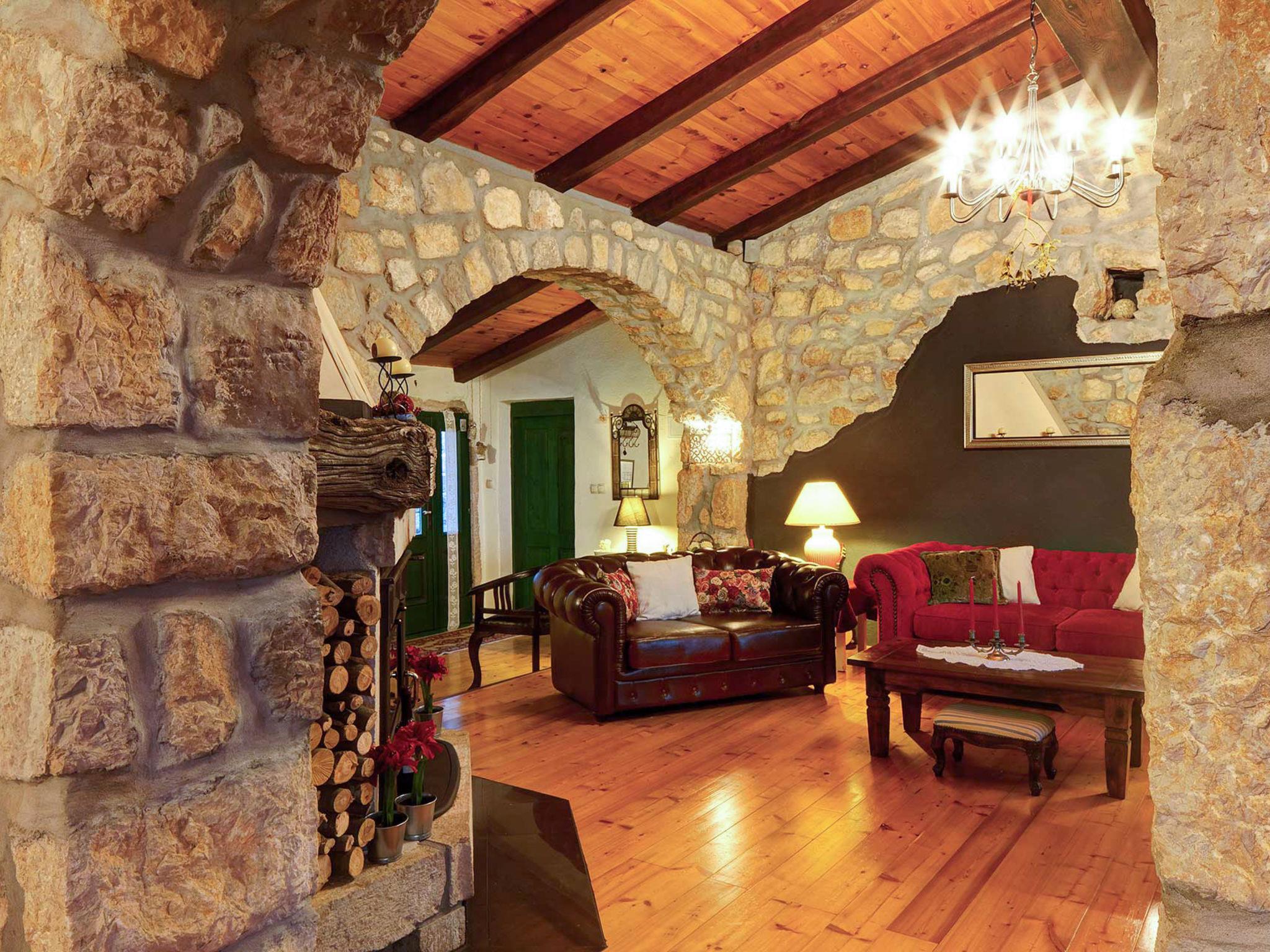 4-room house 242 m2. Living room with open-hearth fireplace, satellite TV and air conditioning. Exit to the terrace. 1 room with 1 french bed (140 cm, length 200 cm). Open kitchen (4 hot plates, oven, dishwasher, toaster, kettle, microwave, freezer, electric coffee machine) with dining table. Exit to the terrace. Sep. WC. On the lower ground floor: 2 rooms, each room with 1 bed (90 cm, length 200 cm), 1 french bed (180 cm, length 200 cm), shower/WC. Facilities: safe, iron, mosquito net, hair dryer. Internet (WiFi, free). Please note: fire extinguisher.