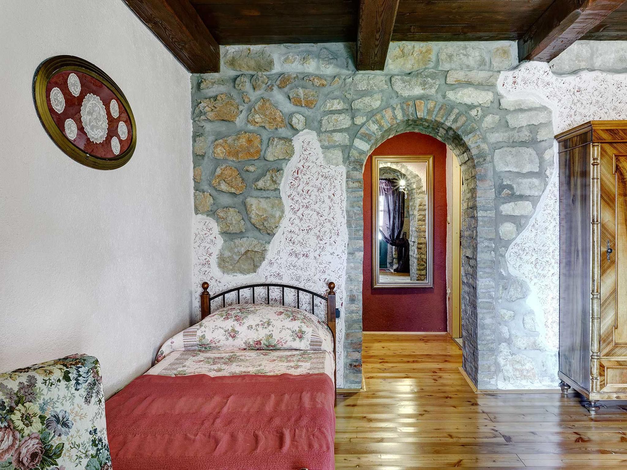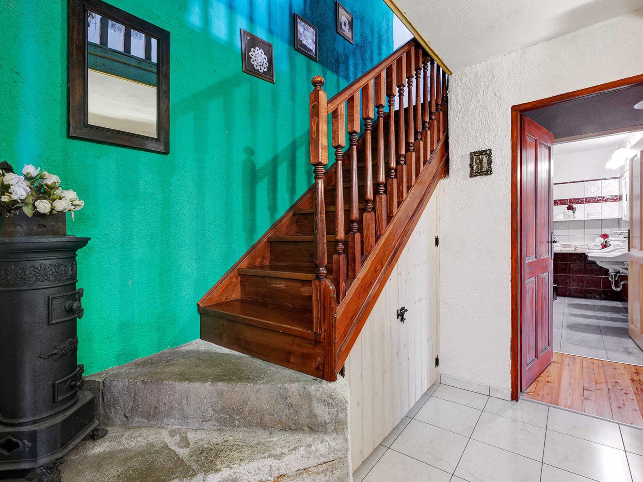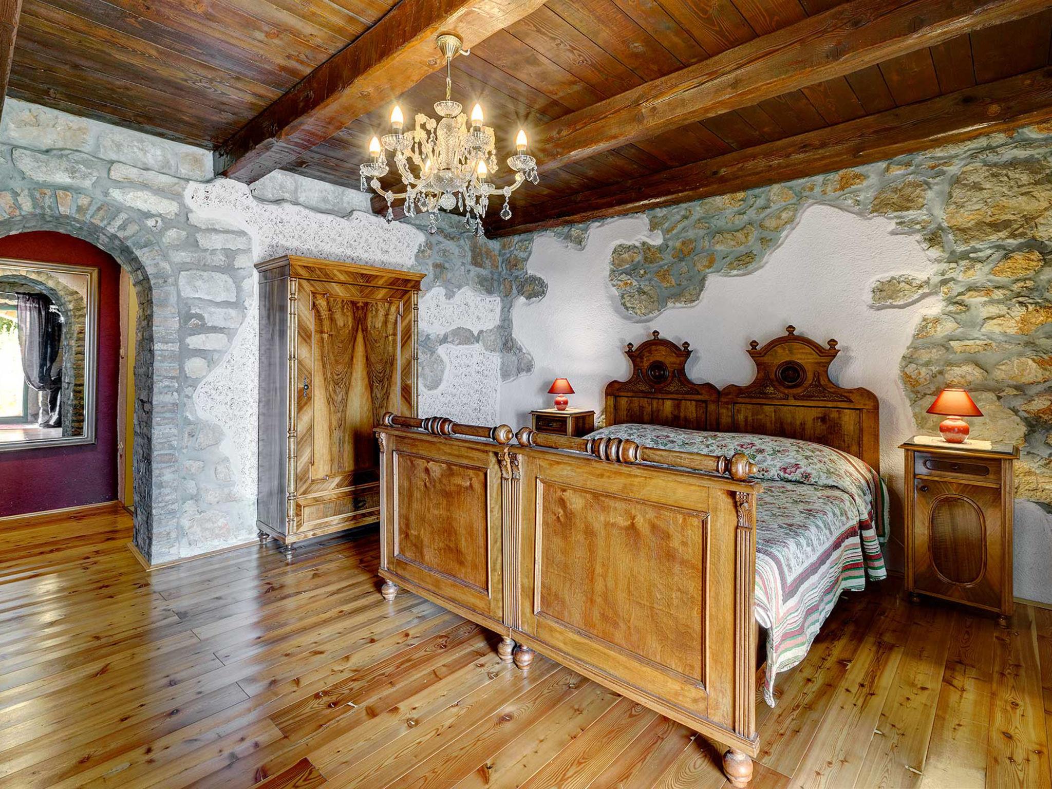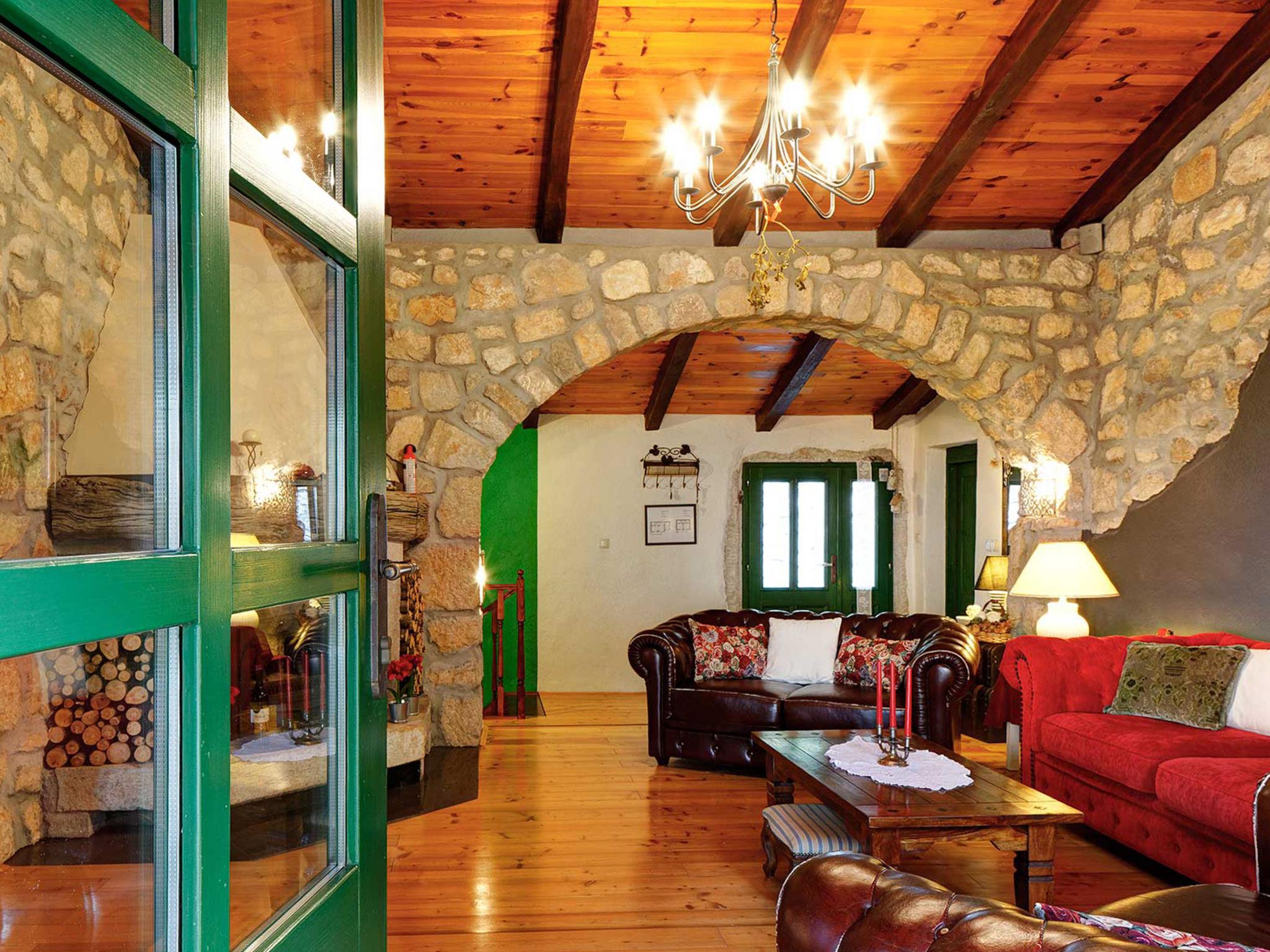 4-room house 242 m2. Living room with open-hearth fireplace, satellite TV and air conditioning. Exit to the terrace. 1 room with 1 french bed (140 cm, length 200 cm). Open kitchen (4 hot plates, oven, dishwasher, toaster, kettle, microwave, freezer, electric coffee machine) with dining table. Exit to the terrace. Sep. WC. On the lower ground floor: 2 rooms, each room with 1 bed (90 cm, length 200 cm), 1 french bed (180 cm, length 200 cm), shower/WC. Facilities: safe, iron, mosquito net, hair dryer. Internet (WiFi, free). Please note: fire extinguisher.