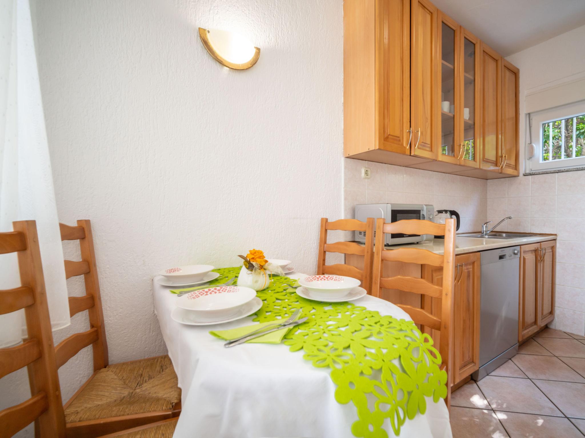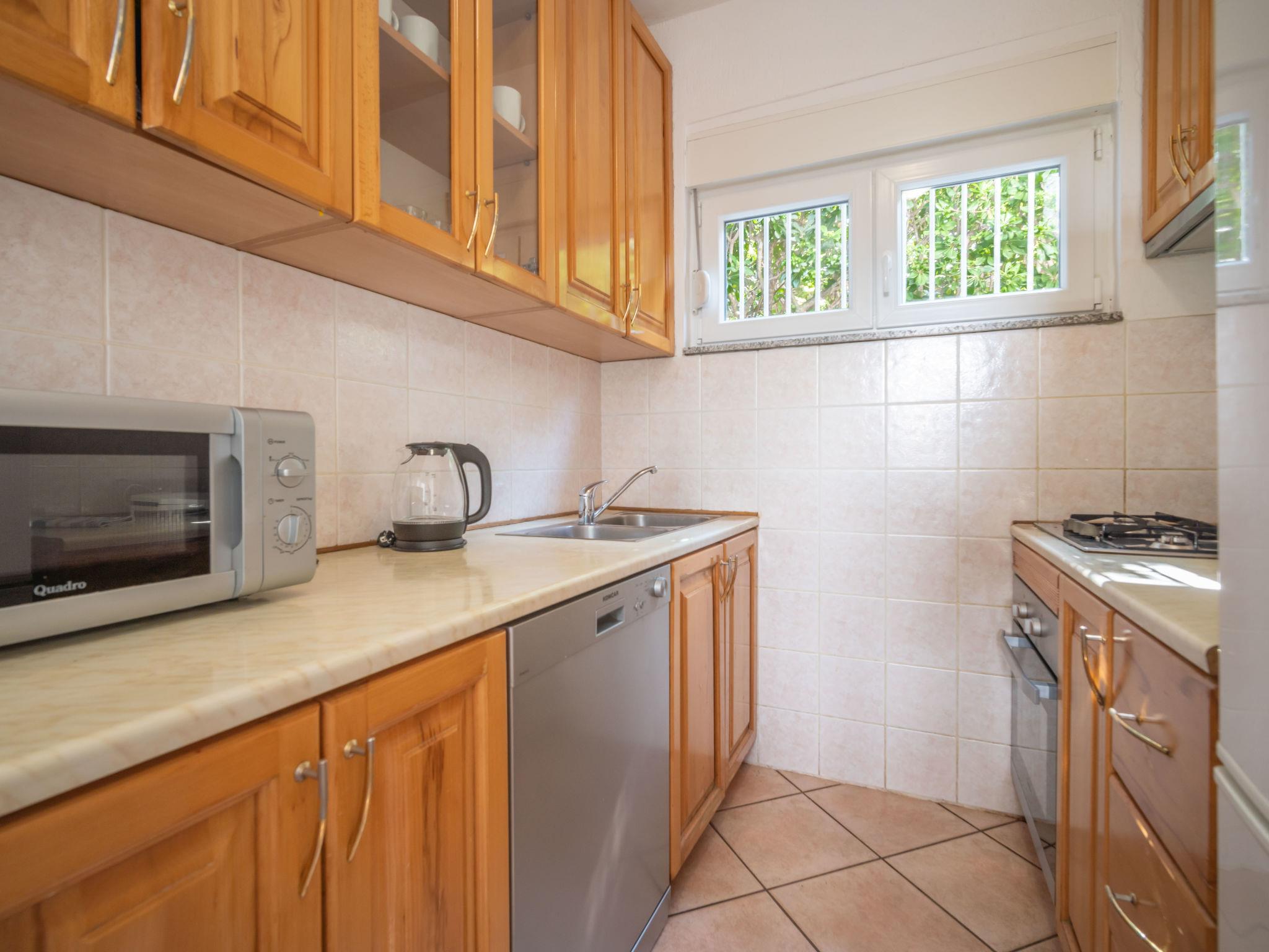3-room apartment 50 m2, on the ground floor. Living/dining room 20 m2 with cable TV and flat screen. Exit to the terrace. Entrance hall with air conditioning. 1 room with 1 double bed (2 x 90 cm, length 190 cm). Exit to the balcony. 1 room with 1 double bed (2 x 90 cm, length 200 cm). Open kitchen (4 hot plates, oven, dishwasher, microwave, freezer). Hip bath/bidet/WC. Air-conditioning (extra). No heating option. Balcony 4 m2, terrace 20 m2 partly roofed. Terrace furniture, barbecue (portable), deck chairs. Marvellous view of the sea. Facilities: washing machine. Internet (WiFi, free).