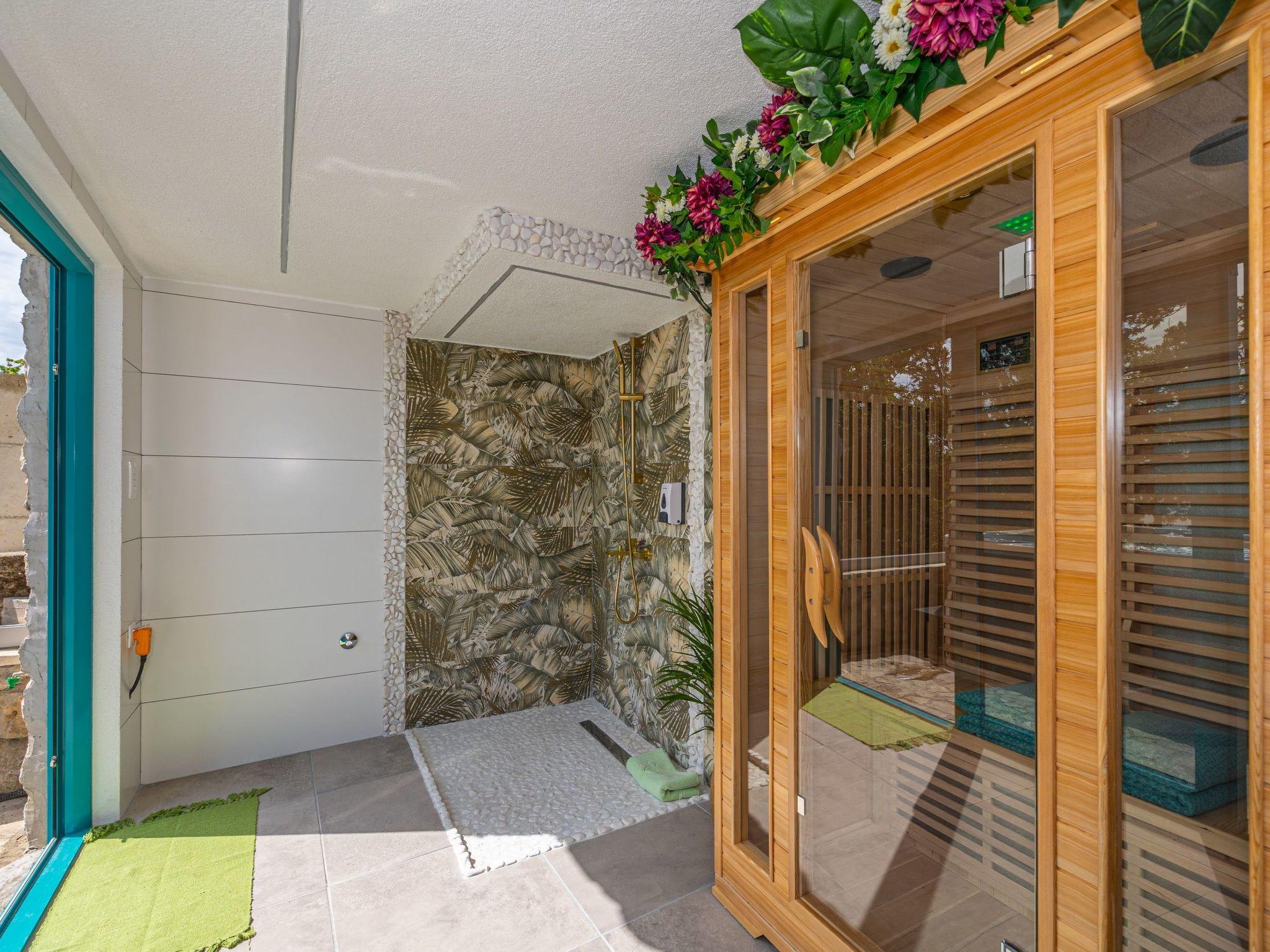 Inside, the villa impresses with comfortable furnishings that leave nothing to be desired. Three inviting bedrooms, each with its own bathroom, ensure privacy and comfort for all guests. A washing machine for exclusive use adds to the comfort. The living areas are equipped with air conditioning throughout, ensuring pleasant temperatures at any time of year. The technical equipment includes a dishwasher, an induction hob, a kettle and a coffee machine, which make everyday life easier and ensure culinary delights.