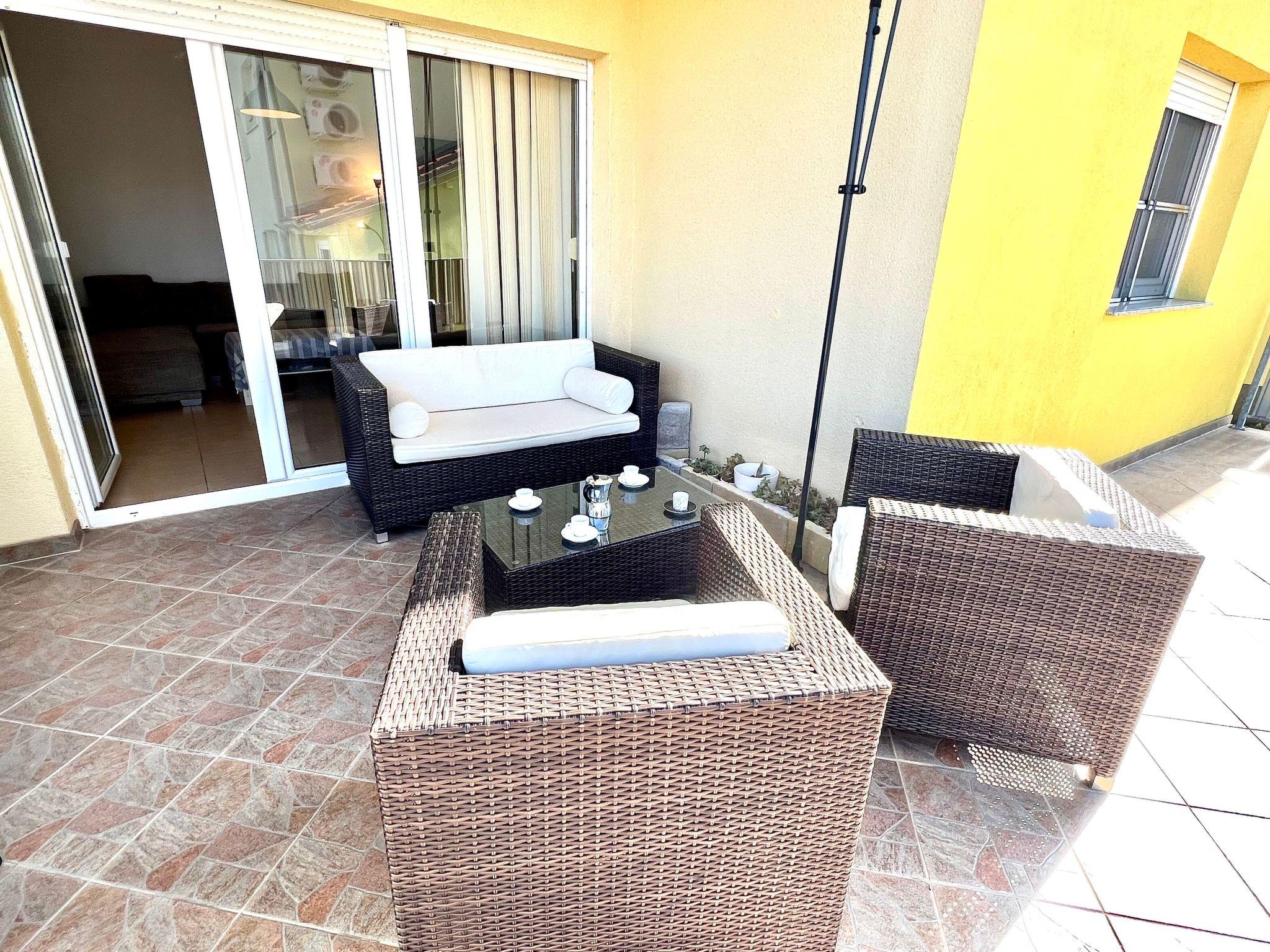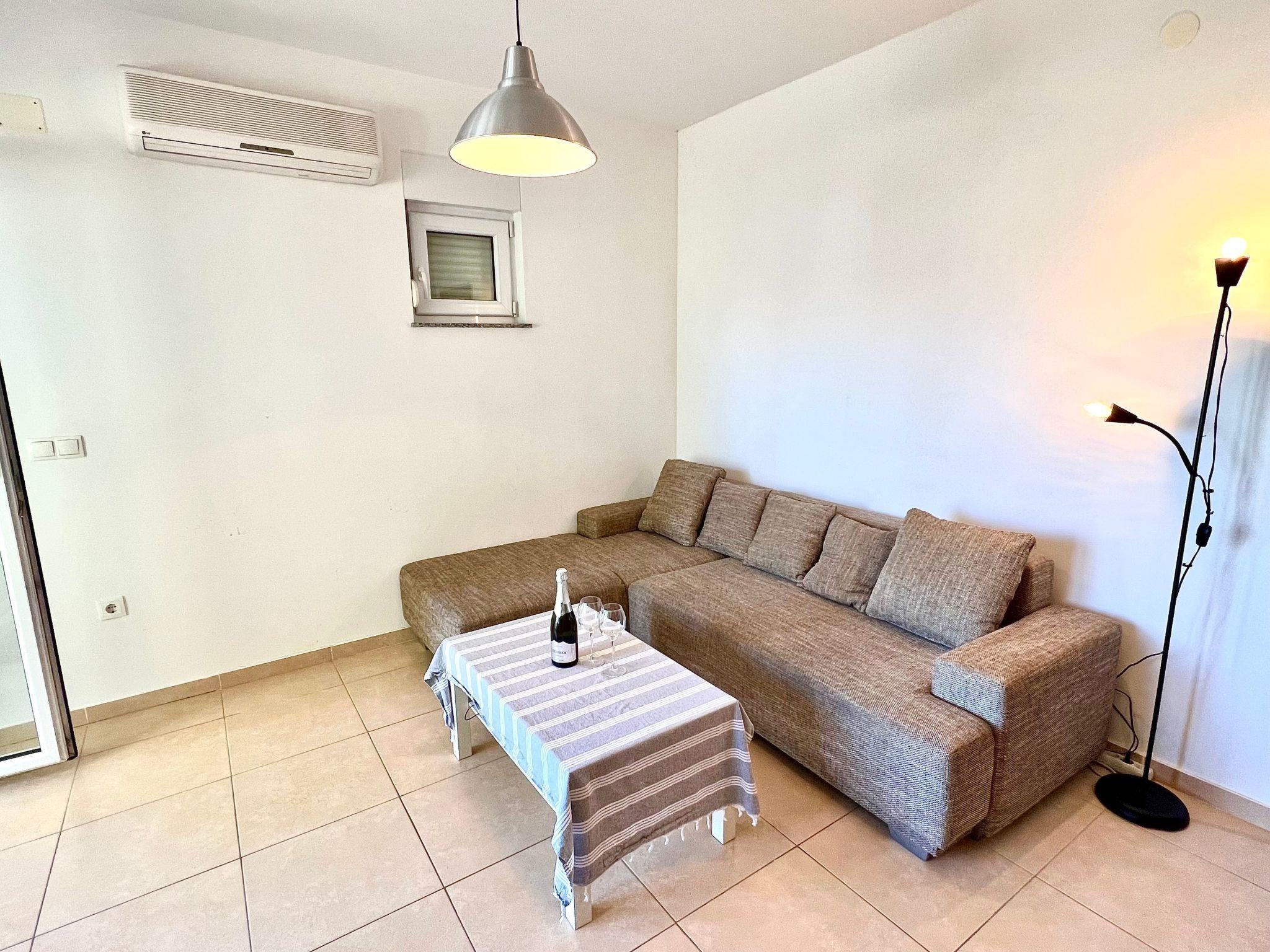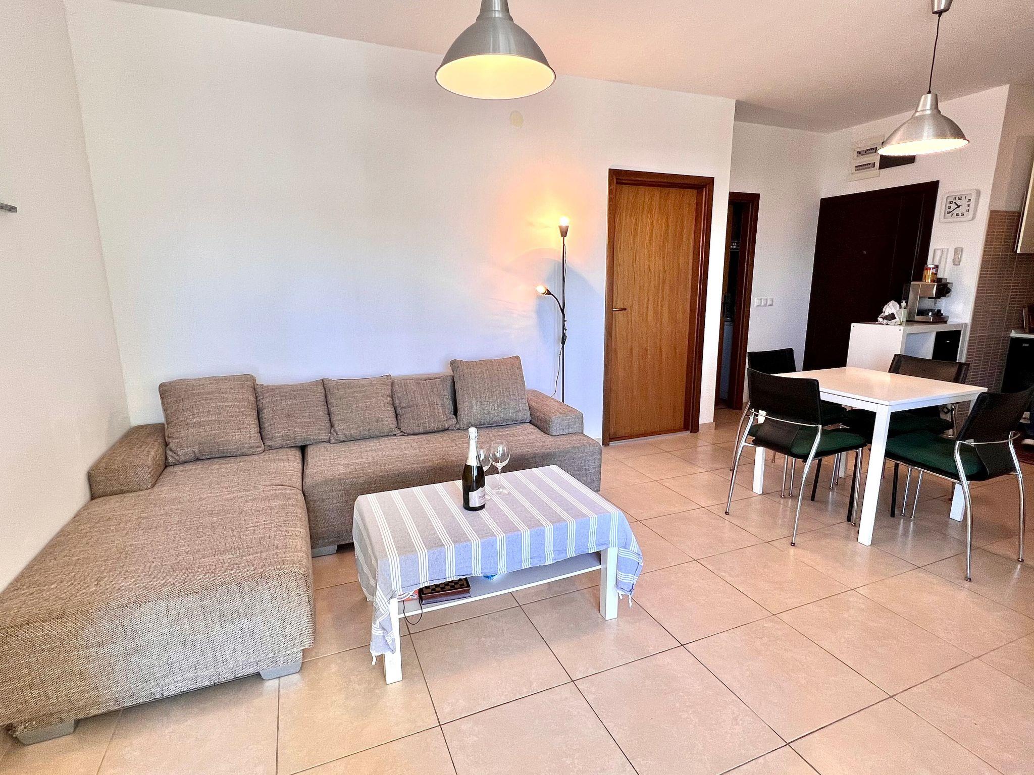 Inside the flat you will find a comfortable and welcoming atmosphere. The two bedrooms are cosily furnished - one with a double bed and the other with two single beds. The eat-in kitchen is the central meeting point of the flat. Here you can cook, eat and relax together. The kitchen is equipped with all the necessary utensils, including a kettle, and the dining table seats four people. In the living area, you will find a pull-out couch that offers additional sleeping space for one person. Thanks to the air conditioning installed throughout, pleasant temperatures are guaranteed throughout the flat, regardless of the season.