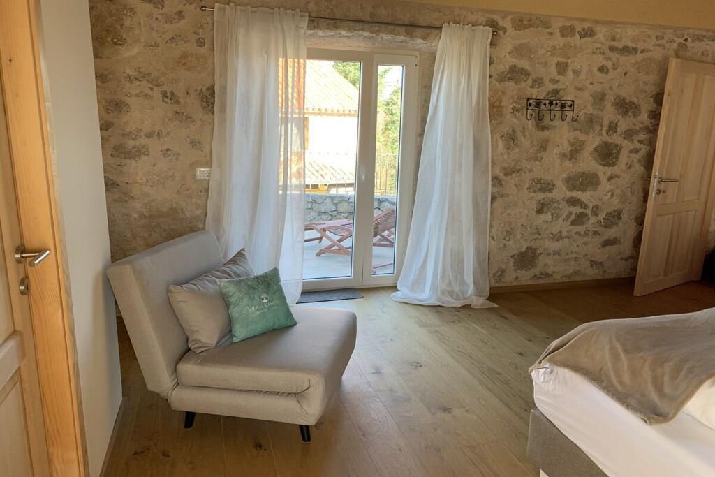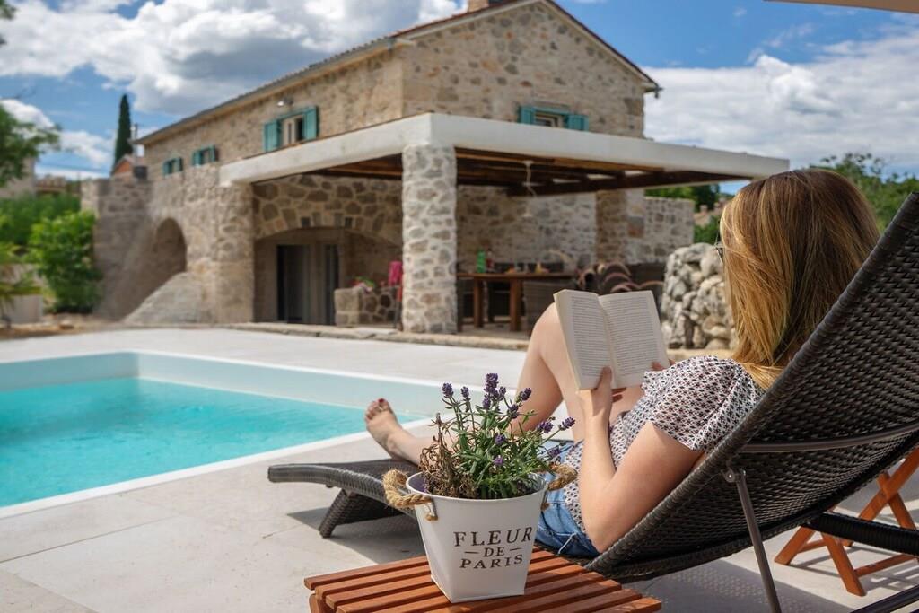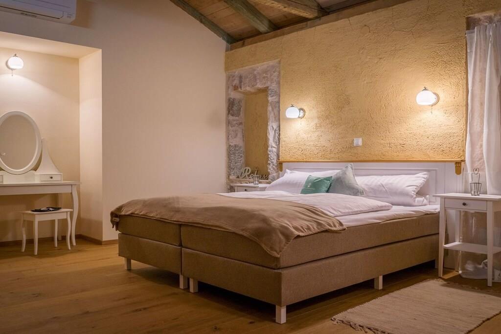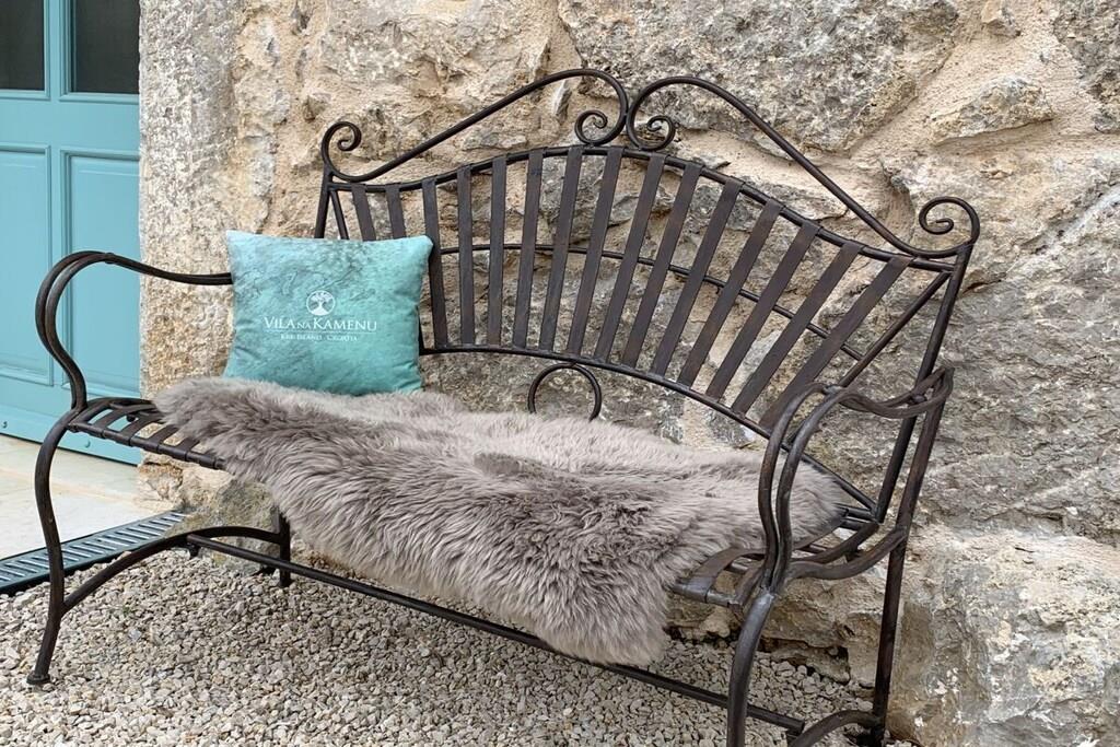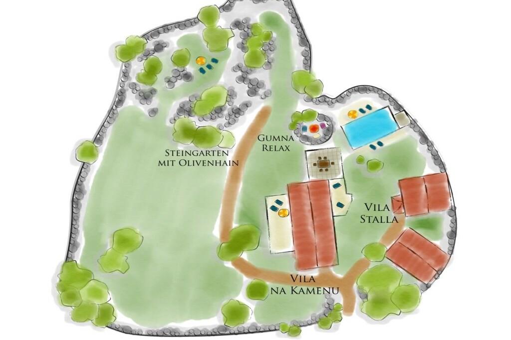 Auf 144 m² Wohnfläche des Ferienhaus Vila na Kamenu stehen 3 Schlafzimmer (Doppelzimmer), 3 Badezimmer, 1 Wohnzimmer mit Schlafcouch, 1 vollausgestattete Küche mit Esszimmer, 2 Terrassen im Obergeschoss und ein weitläufiger Außenbereich mit überdachter Pergola, Weber- Grill, Relax-Gumna (antiker Getreidedreschplatz) und ein beheizbarer Pool (Mai- Mitte Oktober)für bis zu 8 Personen zur Verfügung.