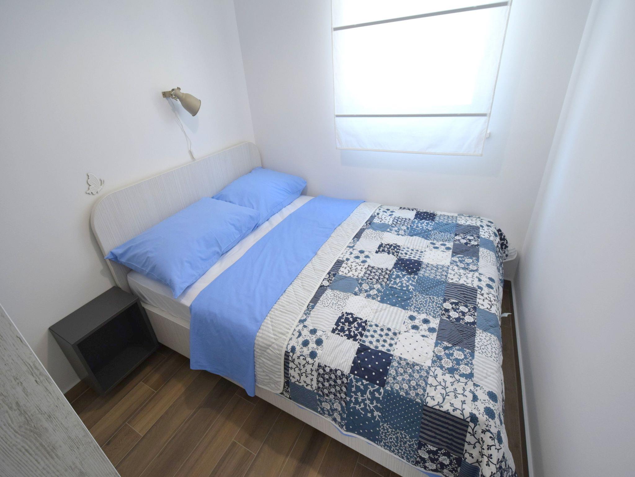 Ferienwohnung bietet Platz für 4 Gäste. Die Betten sind in Schlafzimmern, die es 2 gibt, innerhalb einer Gesamtfläche von 46m2, angeordnet. Die Gäste haben eine eigene Terrasse zur Verfügung, auf der sie in warmen Sommernächten genießen können. Es ist erlaubt, Speisen auf dem Gemeinschafts-Grill vorzubereiten. IM PREIS INBEGRIFFEN: Kurtaxe, Endreinigung, Klimatisierung, Parkplatz, Internet. VERBINDLICHE ZUSÄTZLICHE KOSTEN: Aufzahlung für Kurzaufenthalte (prozentualer Zuschlag pro Nächtigungsanzahl: 30% - 1, 20% - 2, 10% - 3). Die Verfügbarkeit zusätzlicher Dienstleistungen in Ihrem reservierten Termin und die Preise derselben (falls nicht aufgeführt) müssen im Voraus überprüft werden. Zusätzliche Dienstleistungen die in der Zahlungsaufforderung nicht aufgeführt sind werden direkt beim Vermieter bezahlt, angenommen der Gast nutzt auch diese.