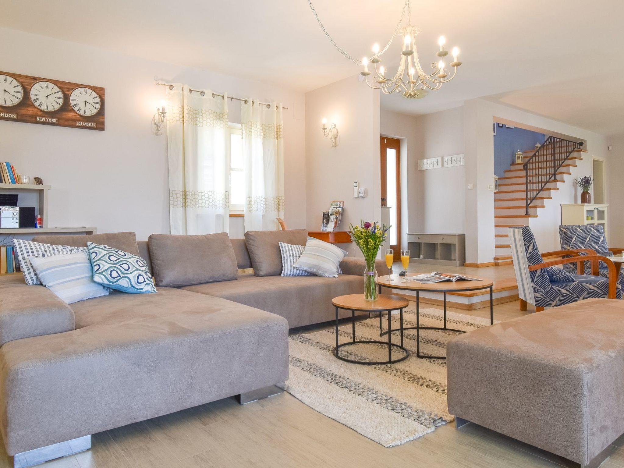 The villa is arranged on two floors (ground floor and first floor). On the ground floor there is a big living room, kitchen, dining room, bathroom, laundry room and bedroom. The living room has two big sofas, two armchairs, fireplace, big TV and DVD, radio, computer table, bookcase. The kitchen is fully equipped with fridge and freezer, cooker, microwave oven, toaster, coffee machine, and a big dining room. From the living and dining room there is an exit to a large terrace (60 m), on which there is a table for eating and a sofa and outdoor armchairs. On the first floor there are 3 double bedrooms, each with its own private bathroom and a children's room with a bed 0,80x190cm, a cot and a large terrace with a sea view.