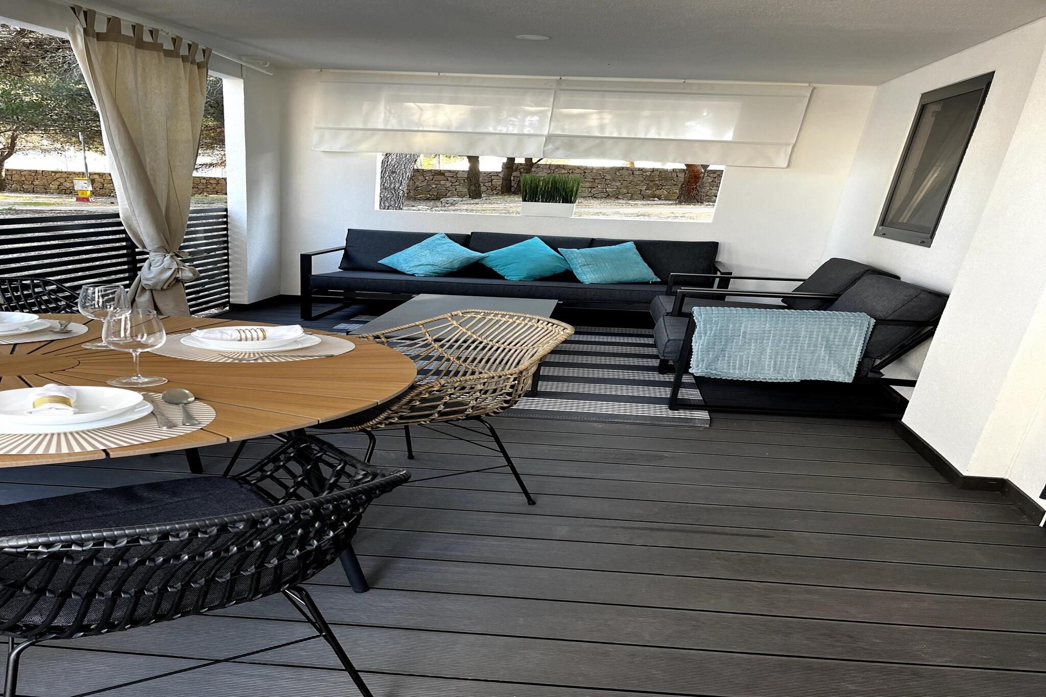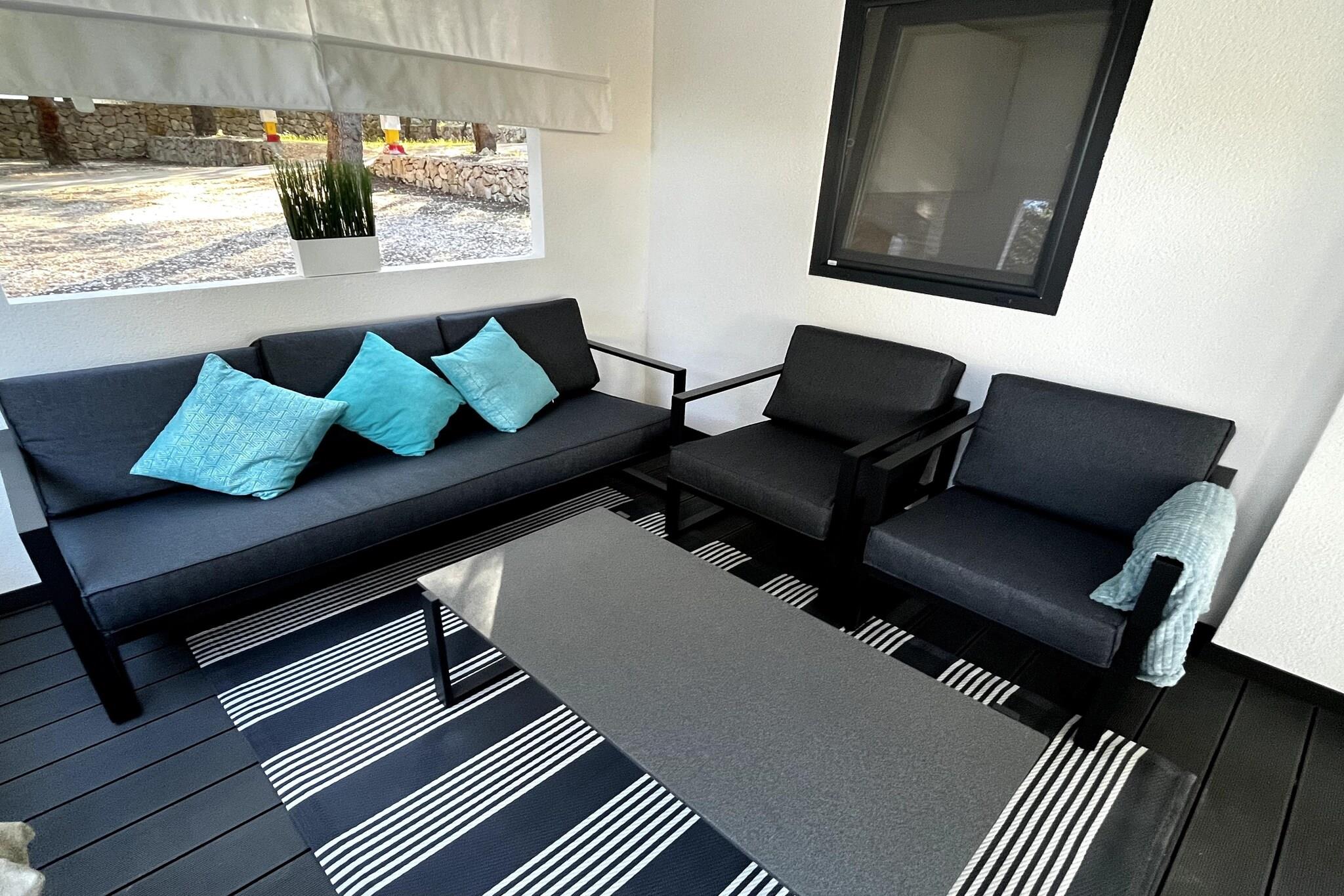 Stueetage: (Stue(dobbeltsovesofa, Fjernsyn(fladskærm)), Køkken(spisebord, elkedel, brødrister, kaffemaskine, mikrobølgeovn, opvaskemaskine , køle-fryseskab), soveværelse(dobbeltseng), soveværelse(enkeltseng, enkeltseng), badeværelse(bruser, håndvask, toilet), terrasse(privat, 18 m2)) klimaanlæg, havemøbler, grill, parkering, strygebræt, strygejern, føntørrer
