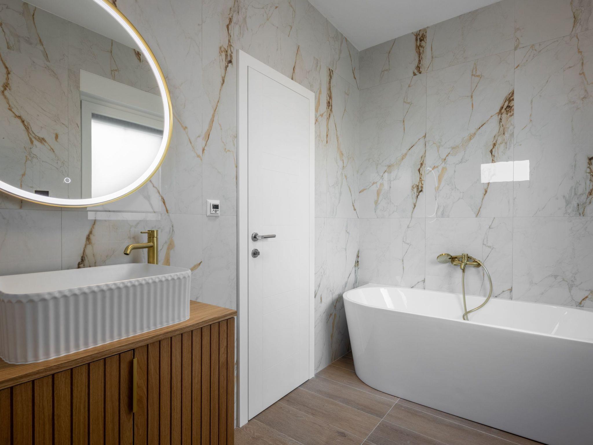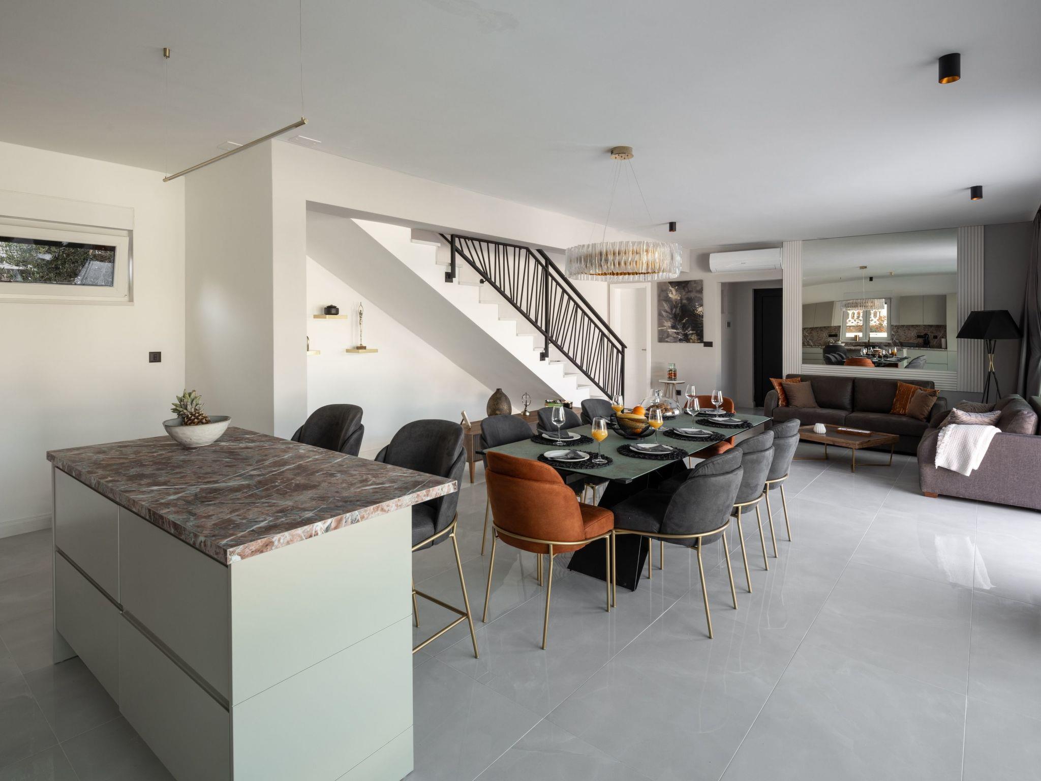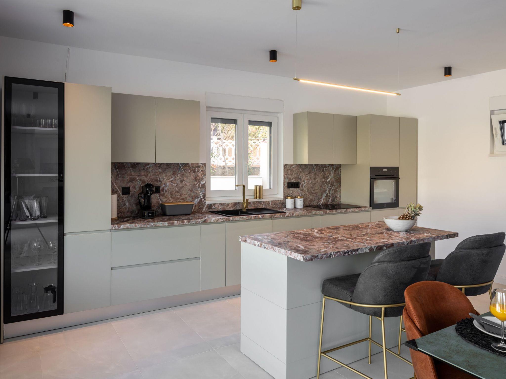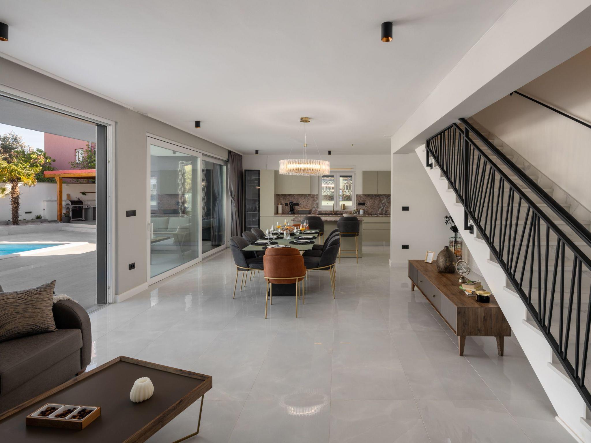 On the ground floor of the villa you can find the kitchen, living room, bathroom and laundry room. On the first floor there are 5 bedrooms and 4 bathrooms. Two bedrooms have their own bathrooms. All bedrooms have a TV and AC. The bed in each room is 200x160. The kitchen is fully equiped so it has an oven, stove, microwave, coffee machine and a dining table for 12 guests. In the living room you can find two sofa beds for two extra guests. You also have a smart TV, different games and chess board.