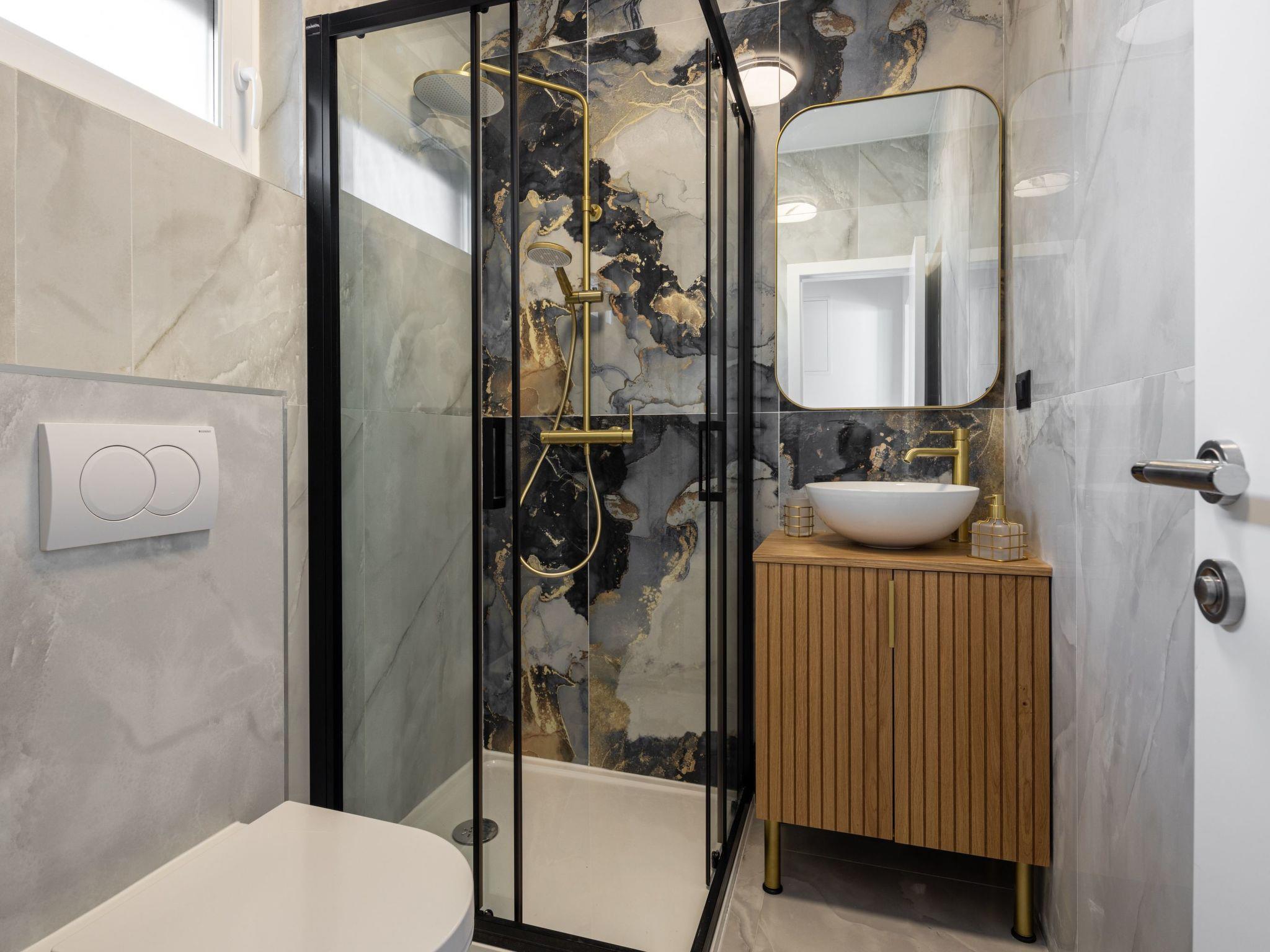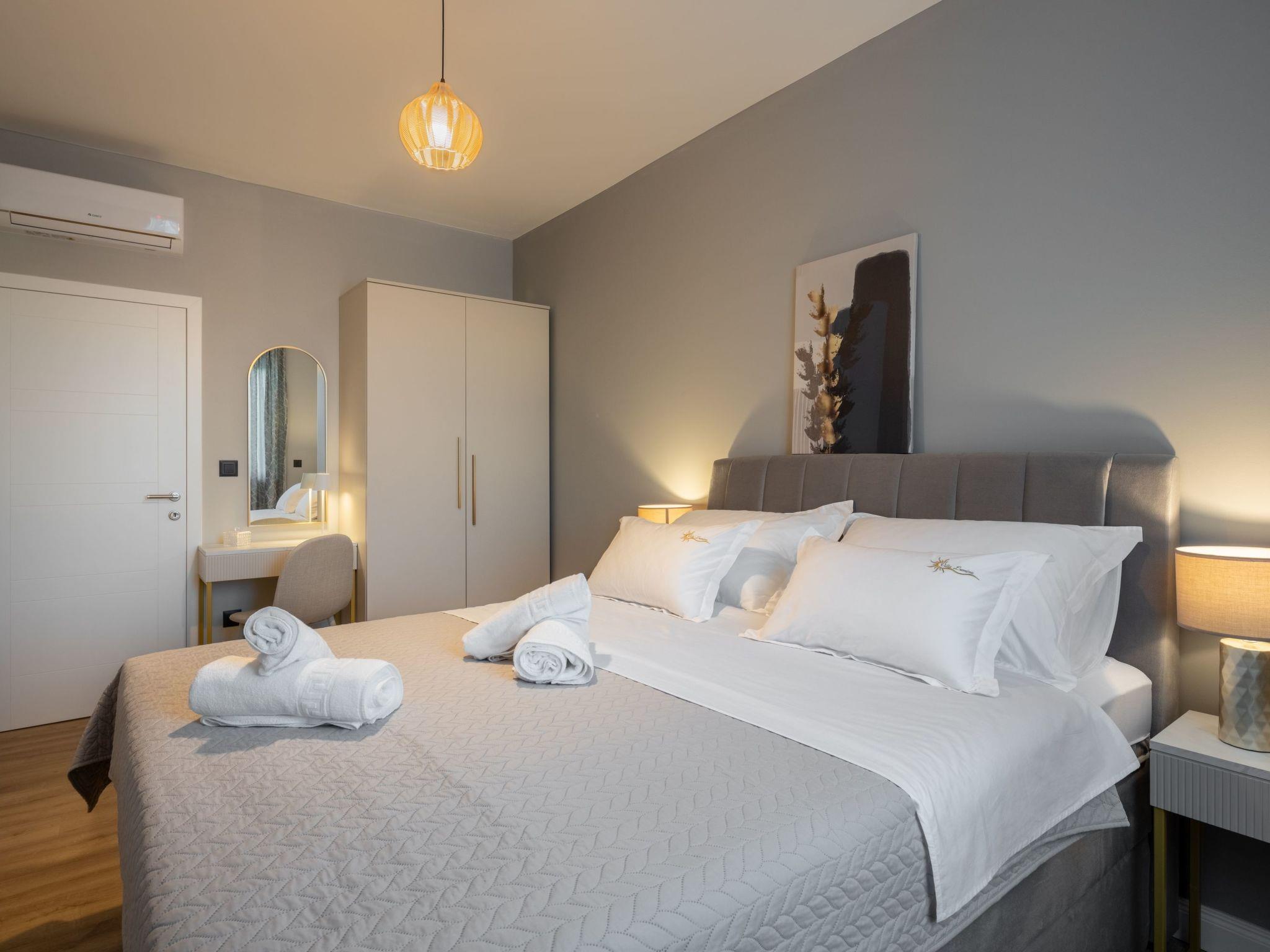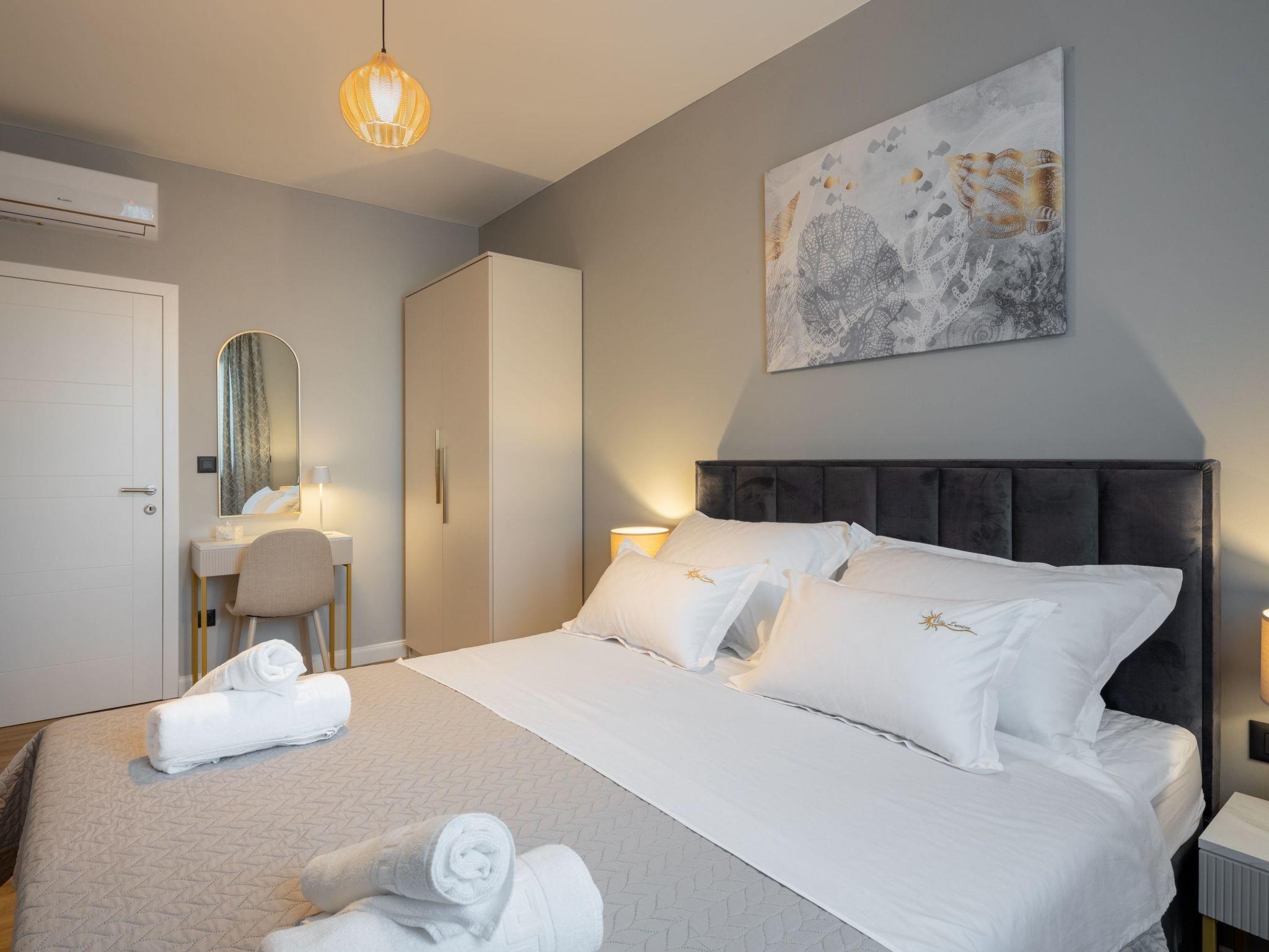 On the ground floor of the villa you can find the kitchen, living room, bathroom and laundry room. On the first floor there are 5 bedrooms and 4 bathrooms. Two bedrooms have their own bathrooms. All bedrooms have a TV and AC. The bed in each room is 200x160. The kitchen is fully equiped so it has an oven, stove, microwave, coffee machine and a dining table for 12 guests. In the living room you can find two sofa beds for two extra guests. You also have a smart TV, different games and chess board.