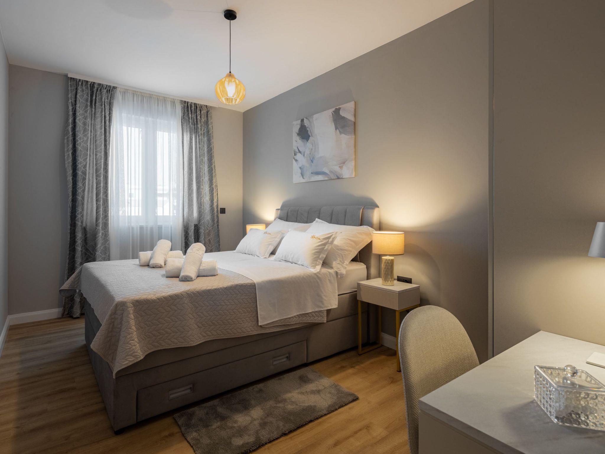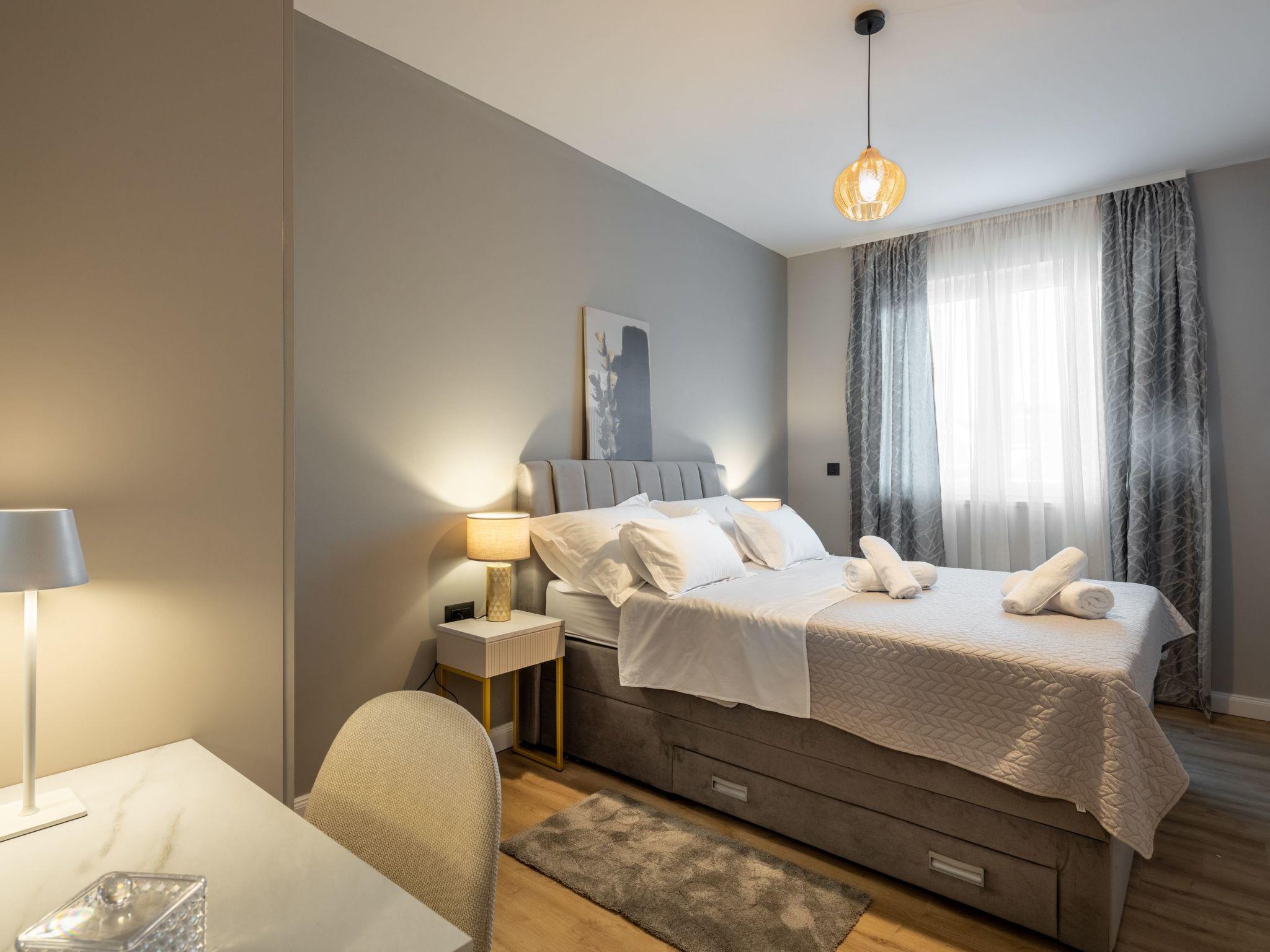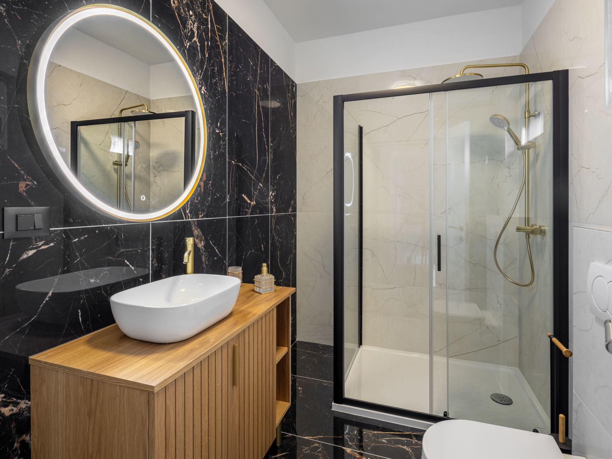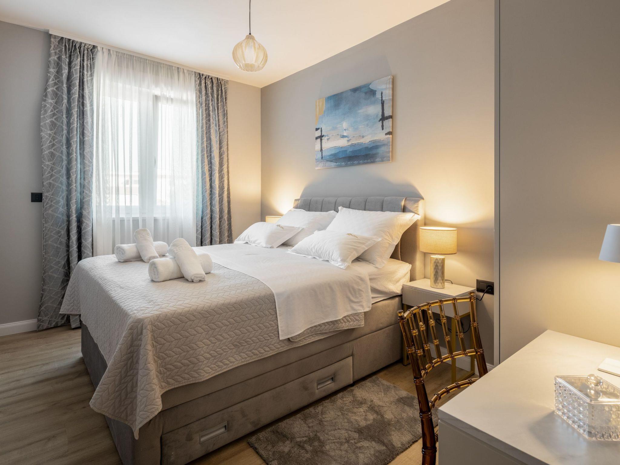 On the ground floor of the villa you can find the kitchen, living room, bathroom and laundry room. On the first floor there are 5 bedrooms and 4 bathrooms. Two bedrooms have their own bathrooms. All bedrooms have a TV and AC. The bed in each room is 200x160. The kitchen is fully equiped so it has an oven, stove, microwave, coffee machine and a dining table for 12 guests. In the living room you can find two sofa beds for two extra guests. You also have a smart TV, different games and chess board.