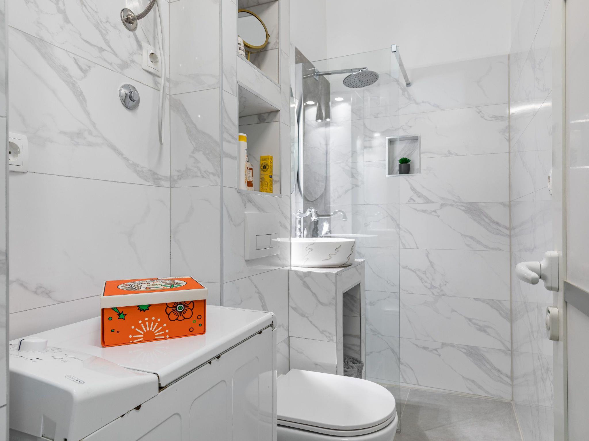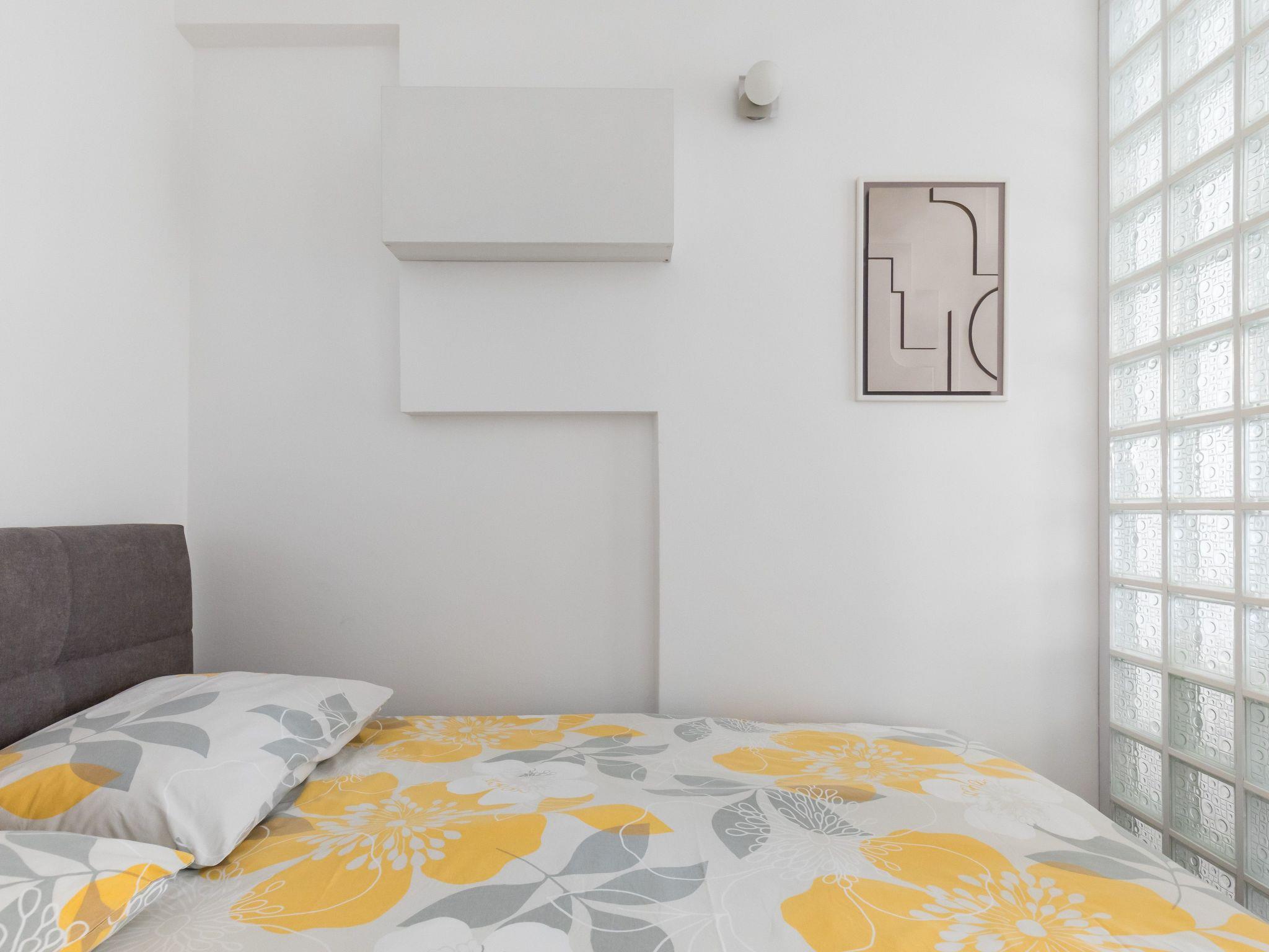 The 25m² studio has a modern interior and was recently renovated (2024). The studio is on the ground floor and provides a living room with a sofa bed (100 x 190cm) and, separated by a small wall, a sleeping area with a double bed (160 x 200cm). It also has a dining table for three people, a small kitchen unit with two hotplates and a fridge with a freezer compartment. The bathroom provides a shower and a washing machine. Wireless Internet access is available, as well as air conditioning and TV (only national channels).