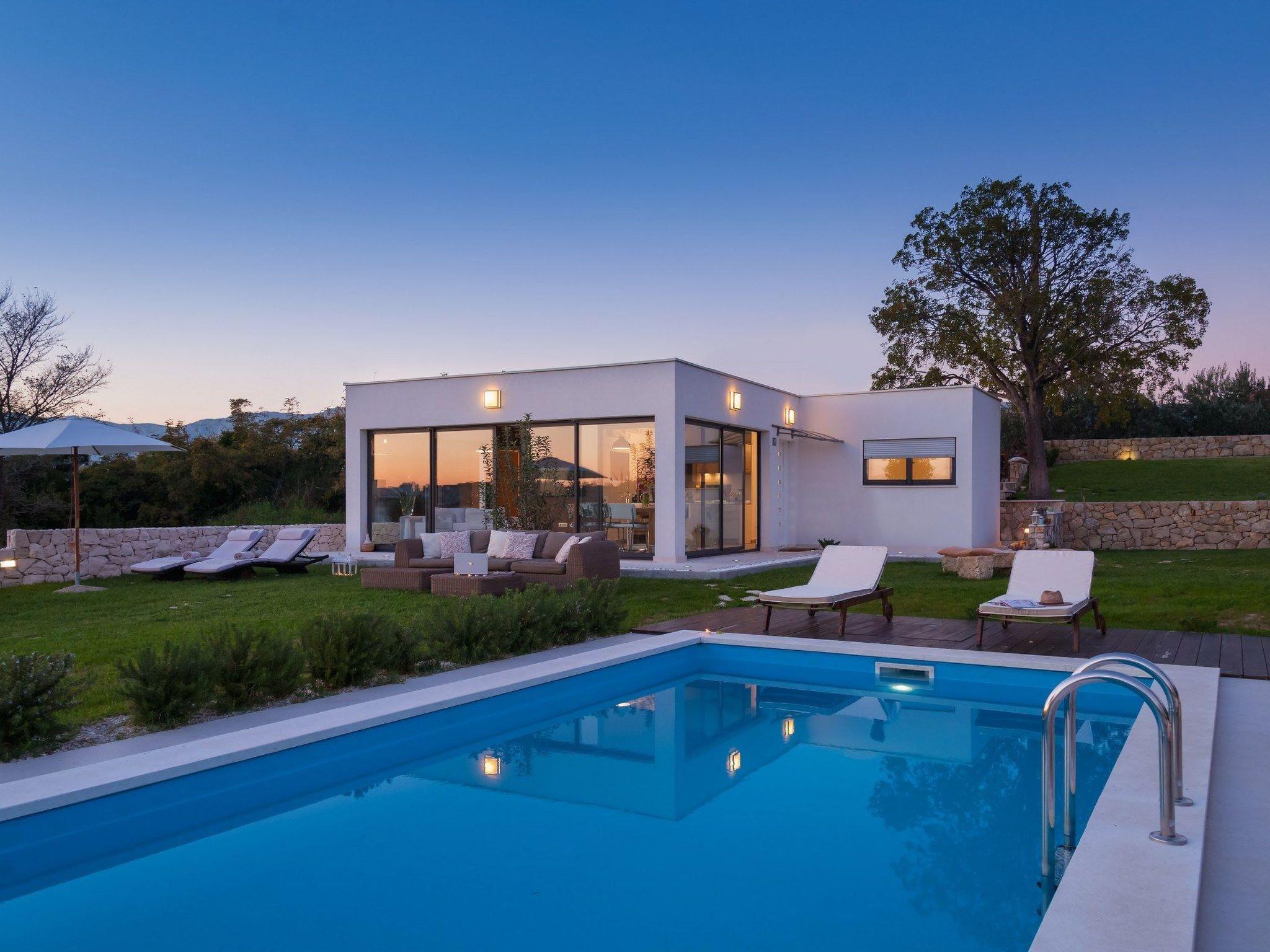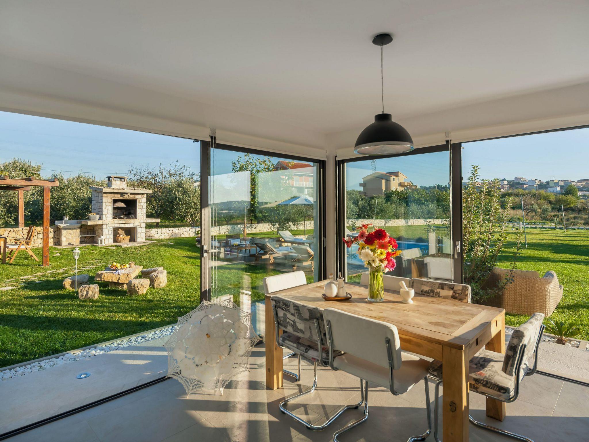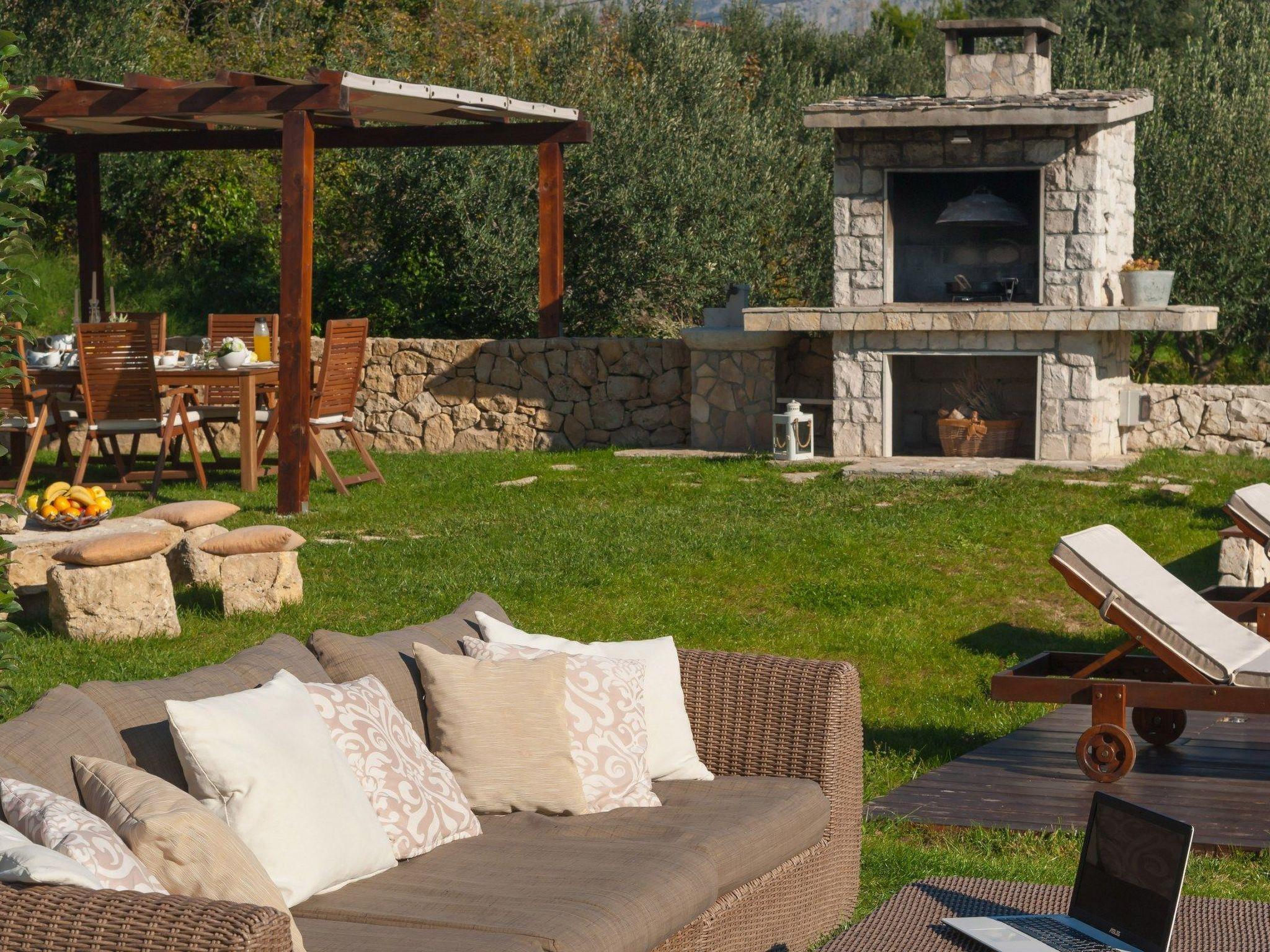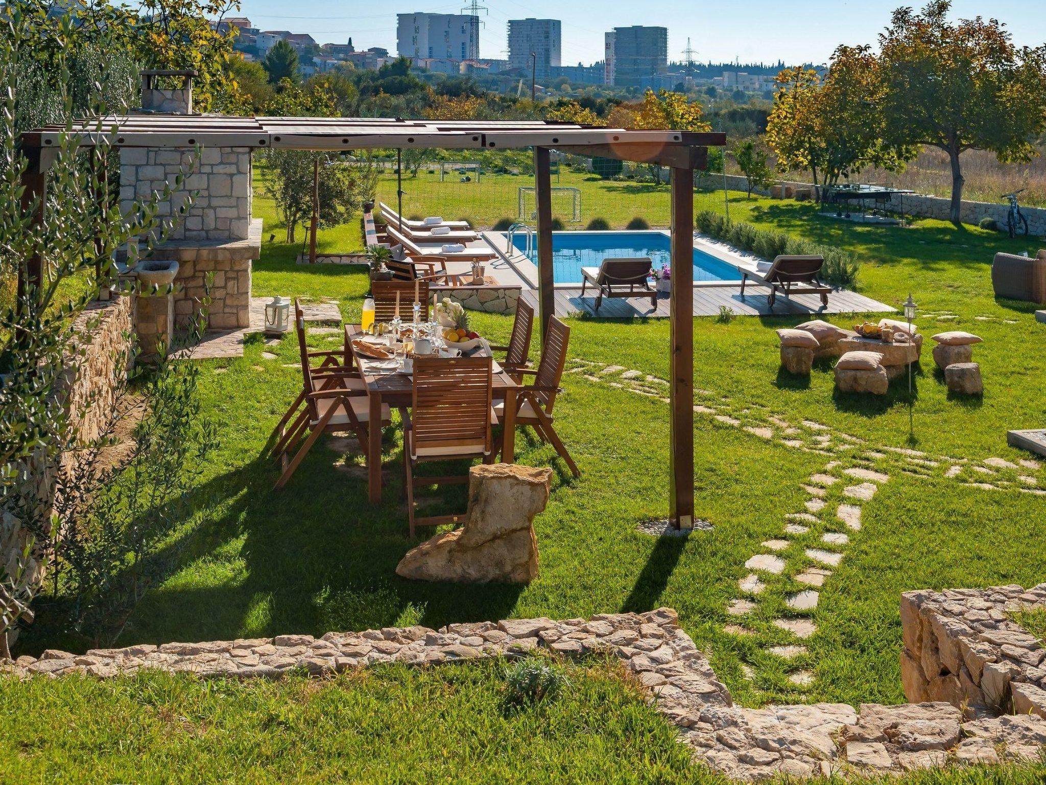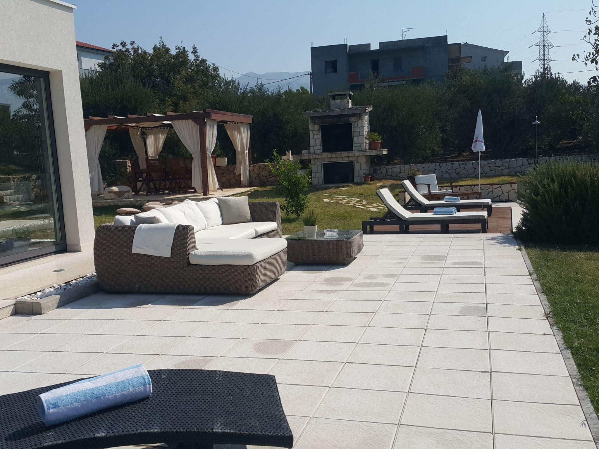 This exclusive designer holiday villa is situated in a quiet residential area of Dracevac near the blue Adriatic, a little outside of the Mediterranean metropolis of Split on the sunny Dalmatian coast.Brand new (built in 2014) luxury holiday villa with a private pool, an outdoor shower, a traditional stone grill on the generous sunny terrace and a football field in the enclosed garden planted with olive and fruit trees.