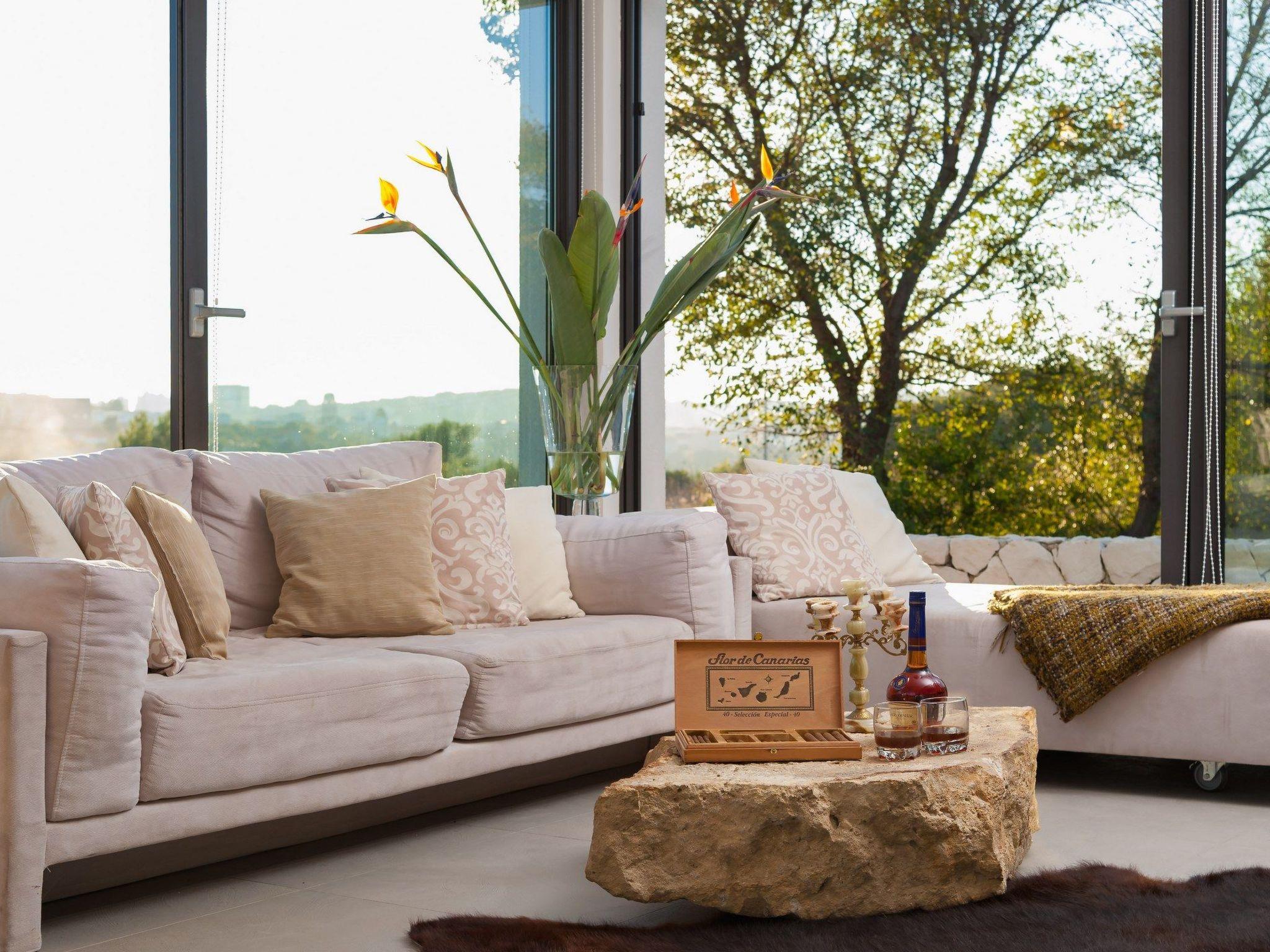 The villa was newly built in 2014 in an elegant, geometrical cube style and provides modern amenities for a comfortable stay, including under-floor heating and air conditioning in all rooms. The living space of 85m² comprises a living and dining room flooded with daylight and an integrated, open kitchen, two bedrooms and a very modern daylight bathroom. The living room is surrounded on all sides by large glass sliding doors and is therefore blessed with light. It provides a comfortable sofa and a matching recamiere, a trendy coffee table made of a solid stone top, a wall-mounted flatscreen TV with cable and satellite channels, a DVD and CD player, a stereo system, a games console and a wooden dining table with six chairs. An elegant breakfast bar separates the dining space from the white and glossy built-in kitchen, equipped with a dishwasher, a ceramic hob with induction and a cooker hood, an oven, fridge with freezer compartment, microwave, kettle, toaster and coffee machine. The two bedrooms are each furnished with a double bed (180 x 200cm and 140 x 200cm). The sofa in the living room and the separate recamiere can be converted into additional beds for two further people. The tastefully designer, black and beige tiled bathroom is fitted with a bath and a walk-in shower cubicle, an oval washbasin with a cupboard underneath and a large wall mirror, a hairdryer and a toilet. A cot and a washing machine are available. Plenty of bed linen and towels are provided and the reliable wireless Internet connection in the villa can be used free of charge.