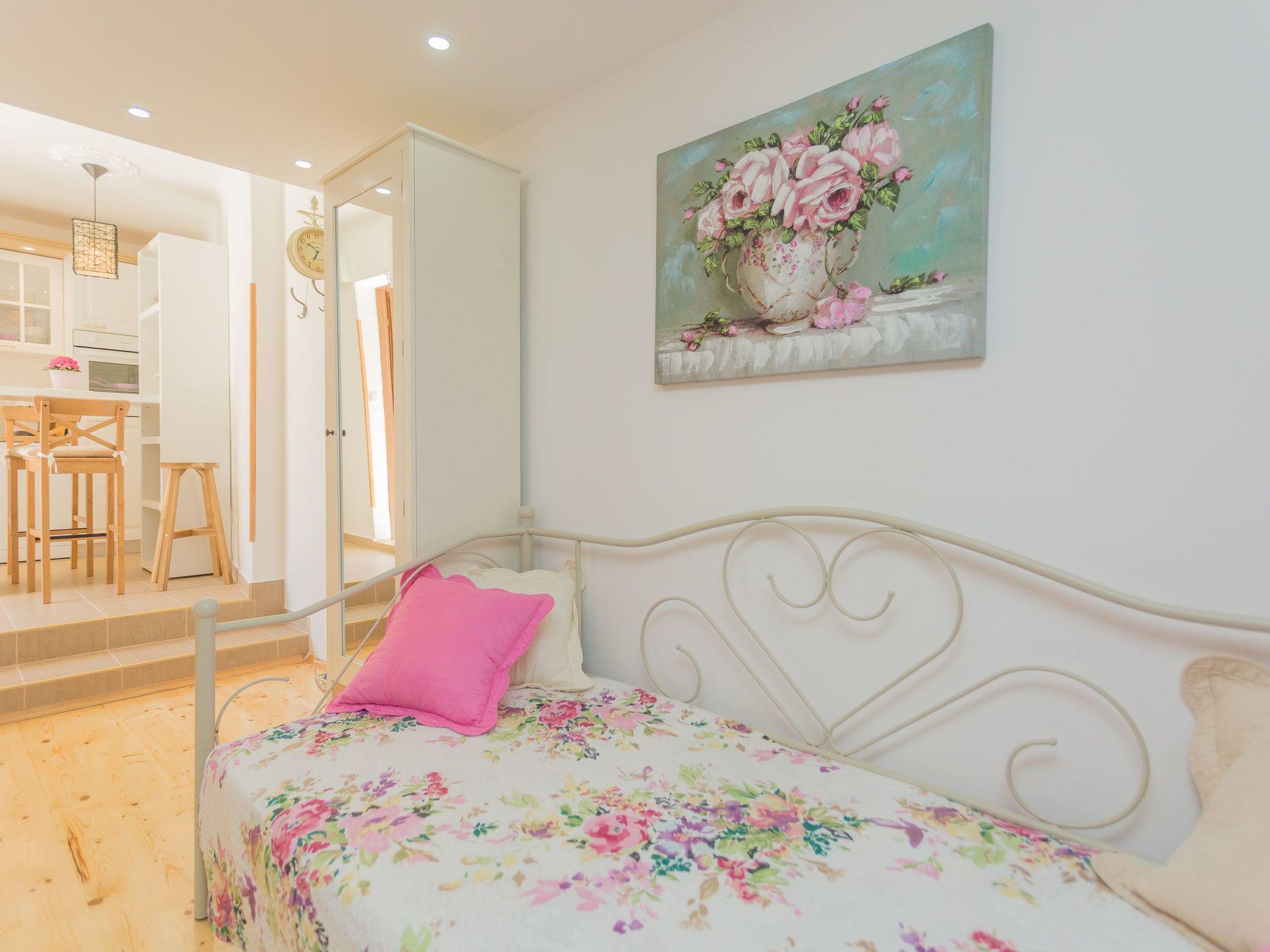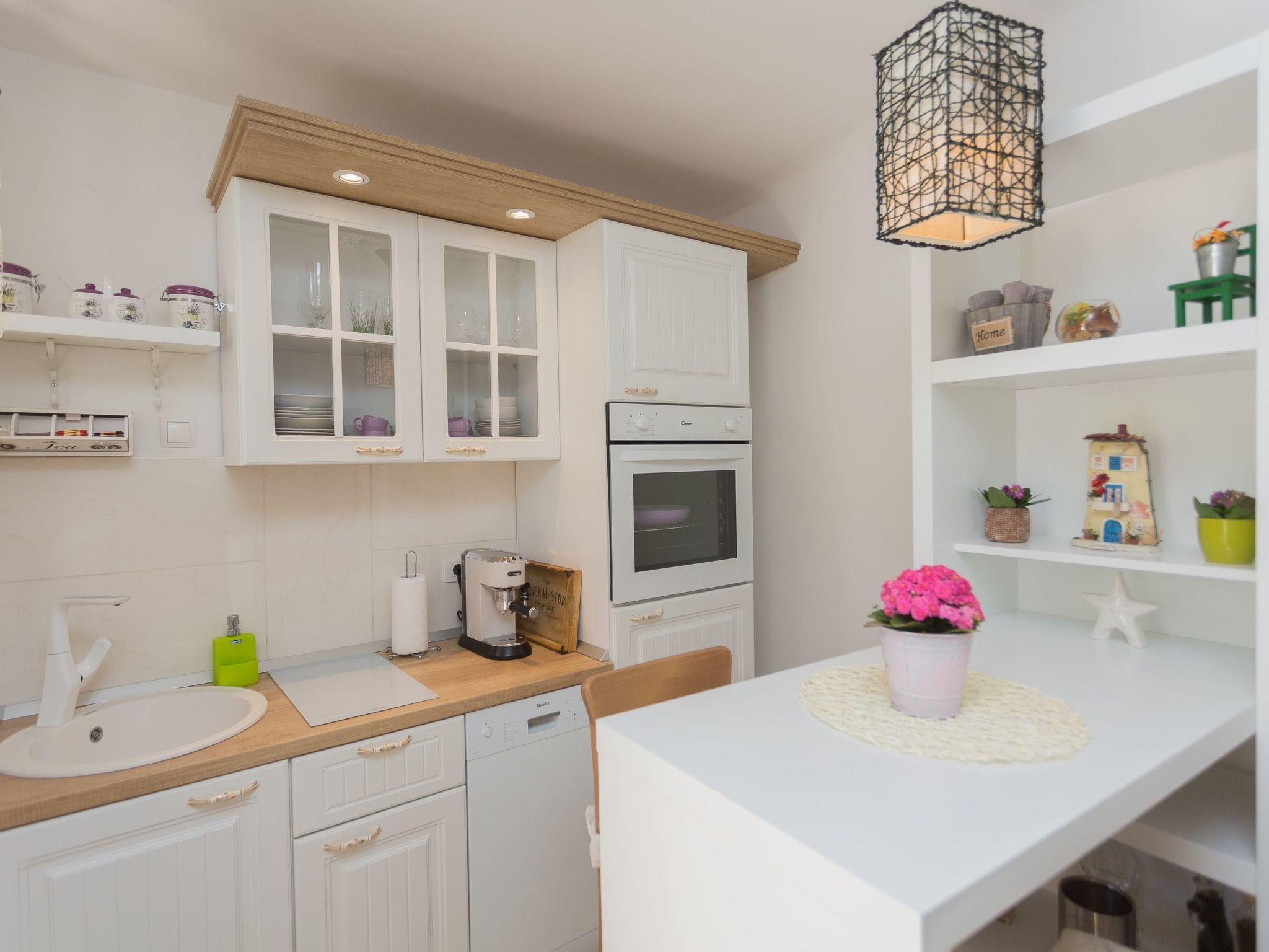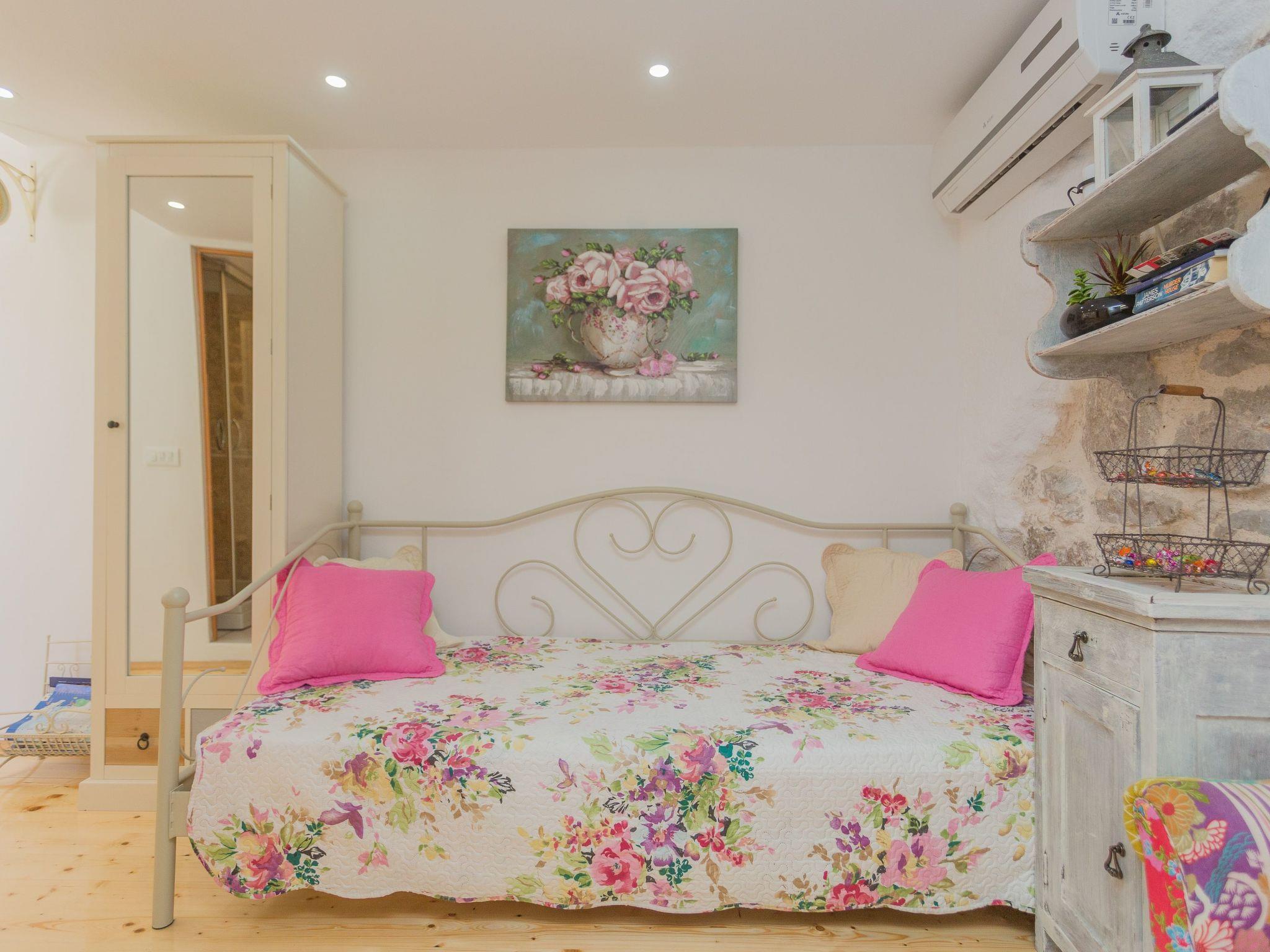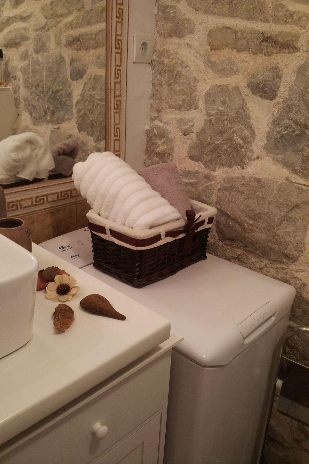 The accommodation is suitable for up to three people. The ground floor consists of a combined living room and bedroom. In the living/ bed rom there is a comfortable single bed (90 x 200cm). The kitchen space includes a dining table and is equipped e.g. with a fridge, two cooking rings and a dishwasher. Crockery and cutlery are provided. Upstairs (low attic) is the bedroom There is a separate bathroom with a shower, WC , washbasin and washing machine . The apartment is decorated in a Dalmatian style. Upstairs is a loft and bedroom. The house has two air conditioners, large Sat.-TV, Wi-Fi and fully equipped for a comfortable stay of our guests. Self check in!One security camera is on the entrance to the property.