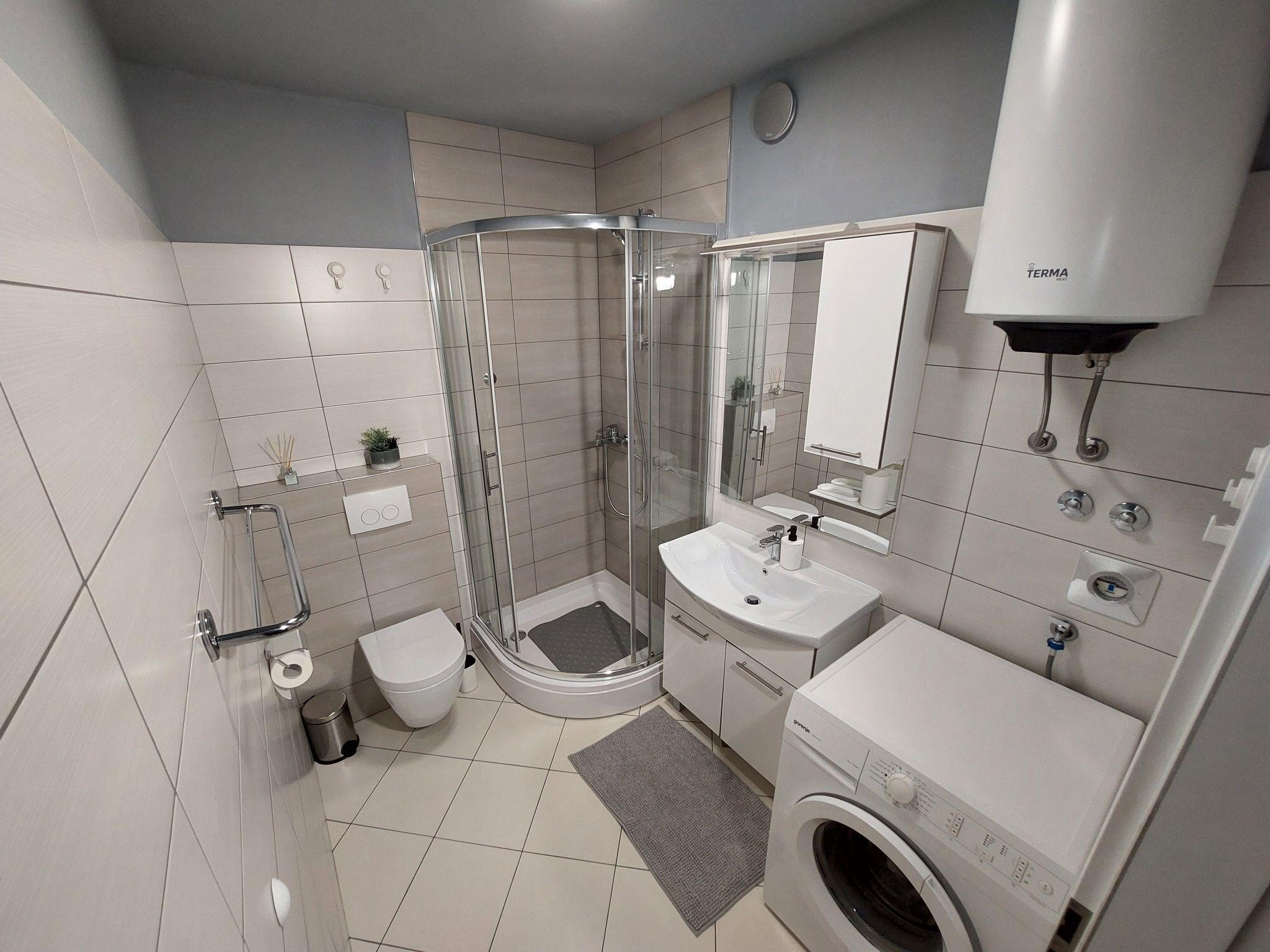 Inside, the apartment is a blend of modernity and comfort, designed to accommodate up to 4 guests. The bedroom, equipped with a queen-size bed, features dimmable lighting, creating a cozy ambiance for restful nights. The bathroom is well-appointed with a shower, ensuring you start each day refreshed. The heart of the apartment, the living room, boasts a large Android smart TV and a comfortable sofa bed for additional guests. The kitchen doesn't fall short either, fully equipped with a 2-plate induction hob, coffee machine (including espresso and filter options), dishwasher, electric kettle, and even a washing machine for your exclusive use. It’s clear that every detail has been thoughtfully considered to ensure your stay is nothing less than perfect.