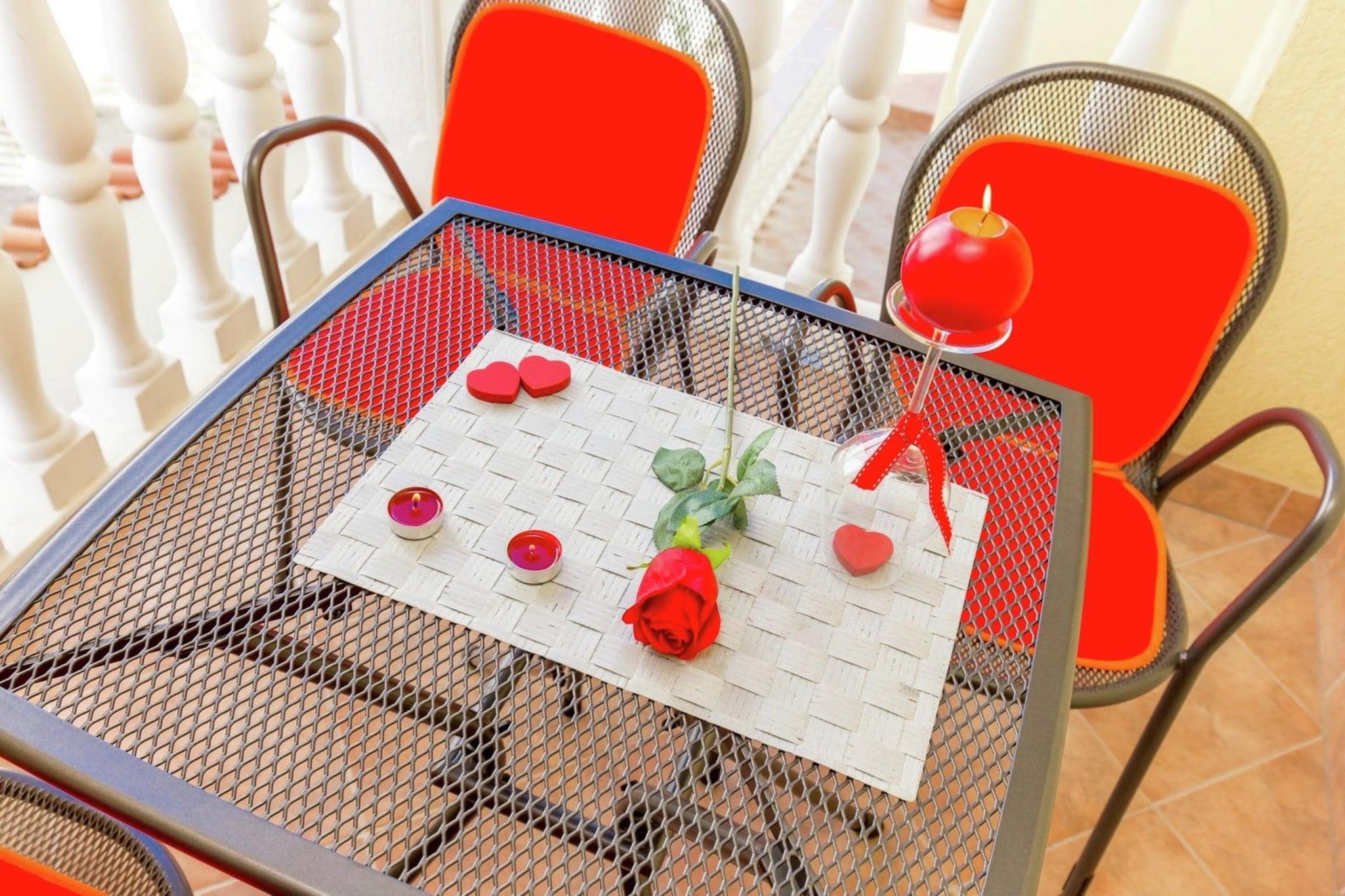 På 2. etage: (åbent køkken(spisebord, elkedel, komfur, kaffemaskine, mikrobølgeovn, køle-fryseskab), Stue/soveværelse(dobbeltsovesofa, Fjernsyn(parabol), klimaanlæg), soveværelse(dobbeltseng), soveværelse(dobbeltseng eller 2 enkeltsenge Senge), badeværelse(bruser, toilet, føntørrer), toilet(toilet, vaskemaskine), terrasse(privat)) Bubble bath, parkering, swimmingpool(deles med andre gæster)