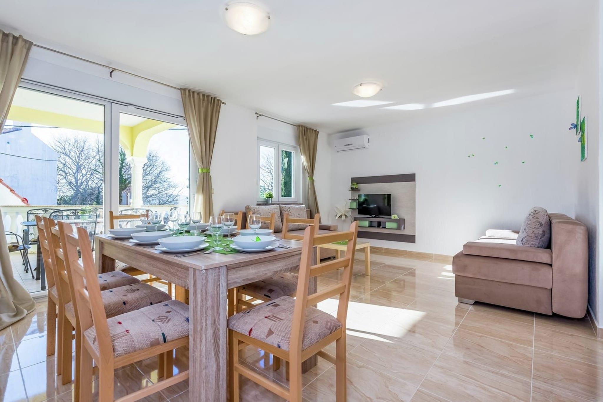 Dit hyggelige feriehus med terrasse og havudsigt er beliggende i stedet Dramalj. Det er en lille turistby forbundet med Crikvenica med en lang boulevard omgivet af middelhavs vegetation kaldet Lungo mare. Rummelig indkvartering ligger i et roligt område, 100 m fra centrum. På grund af denne placering er det et behageligt ophold for alle, der elsker naturen. Den mest attraktive strand for familier med børn i regionen hedder Kacjak, og det er kun 0,9 km væk. Dramalj og Crikvenica med deres lange tradition for turisme er perler af Crikvenica Riviera på grund af mildt middelhavsklima, smukke sandstrande, småsten og stenstrande og rige historiske og kulturelle arv. Udover vandsport for dem, der søger en aktiv ferie, er der forskellige aktiviteter: cykling, bjergbestigning, fiskeri, dykning, tennis og golf. Nationalpark Risnjak med sine naturlige skønheder samt Gorski Kotar, regionen med bjerge og søer kan nås inden for en times kørsel.