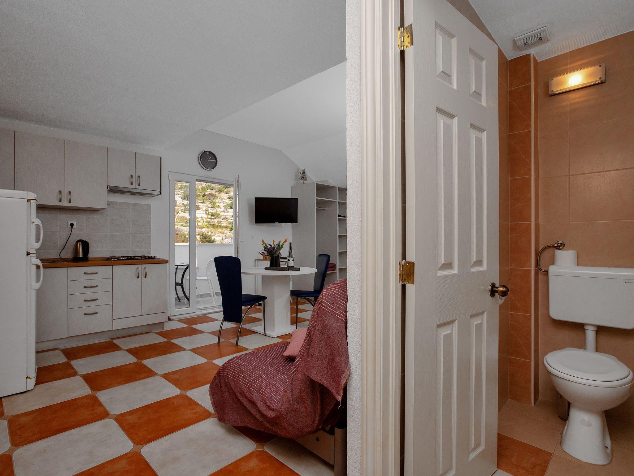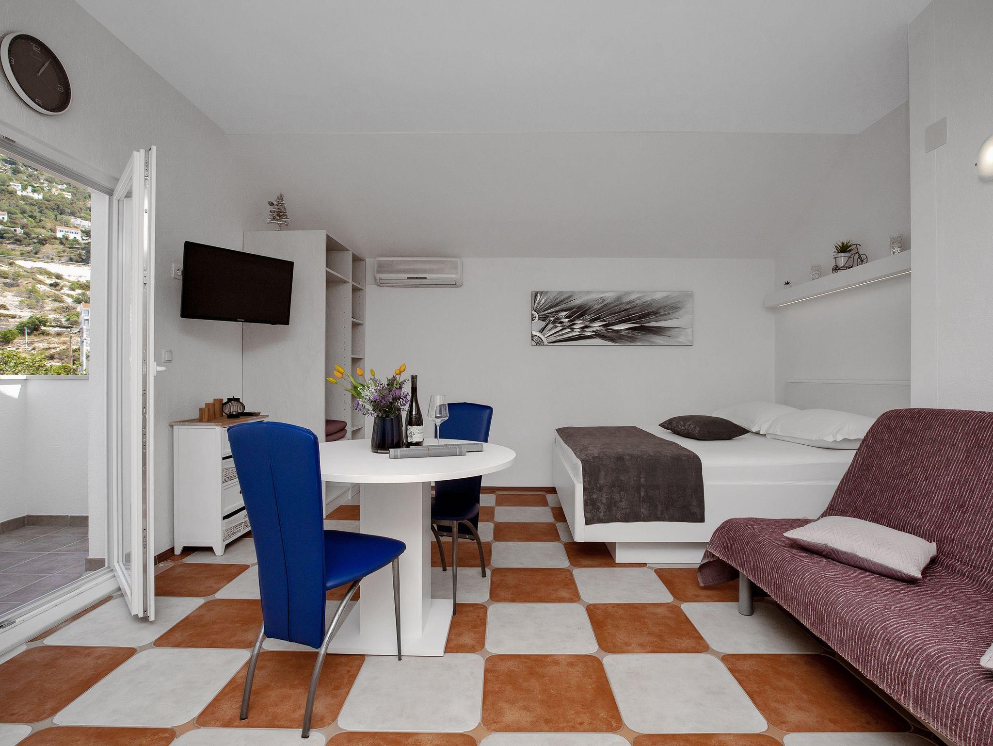 Studio bietet Platz für 3 Gäste. Die Betten sind in Schlafzimmern, die es 1 gibt, und in Esszimmer, innerhalb einer Gesamtfläche von 27m2, angeordnet. Die Gäste haben einen eigenen Balkon zur Verfügung, auf der sie in warmen Sommernächten genießen können. Das Studio-Apartment bietet Meerblick. IM PREIS INBEGRIFFEN: Kurtaxe, Endreinigung, Klimatisierung, Parkplatz, Internet, Bügeleisen, Bügelbrett, Föhn. VERBINDLICHE ZUSÄTZLICHE KOSTEN: Aufzahlung für Kurzaufenthalte (prozentualer Zuschlag pro Nächtigungsanzahl: 30% - 1, 20% - 2, 10% - 3). Die Verfügbarkeit zusätzlicher Dienstleistungen in Ihrem reservierten Termin und die Preise derselben (falls nicht aufgeführt) müssen im Voraus überprüft werden. Zusätzliche Dienstleistungen die in der Zahlungsaufforderung nicht aufgeführt sind werden direkt beim Vermieter bezahlt, angenommen der Gast nutzt auch diese.