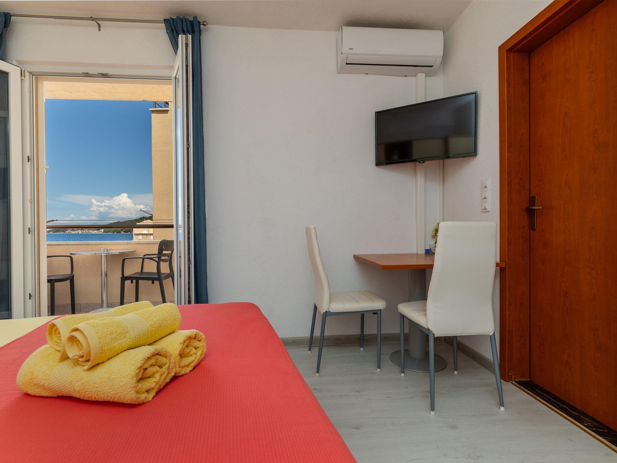 Studio bietet Platz für 2 Gäste. Die Betten sind in Schlafzimmern, die es 1 gibt, innerhalb einer Gesamtfläche von 18m2, angeordnet. Die Gäste haben einen eigenen Balkon zur Verfügung, auf der sie in warmen Sommernächten genießen können. Das Studio-Apartment bietet Meerblick. IM PREIS INBEGRIFFEN: Kurtaxe, Endreinigung, Klimatisierung, Parkplatz, Internet. Die Verfügbarkeit zusätzlicher Dienstleistungen in Ihrem reservierten Termin und die Preise derselben (falls nicht aufgeführt) müssen im Voraus überprüft werden. Zusätzliche Dienstleistungen die in der Zahlungsaufforderung nicht aufgeführt sind werden direkt beim Vermieter bezahlt, angenommen der Gast nutzt auch diese.