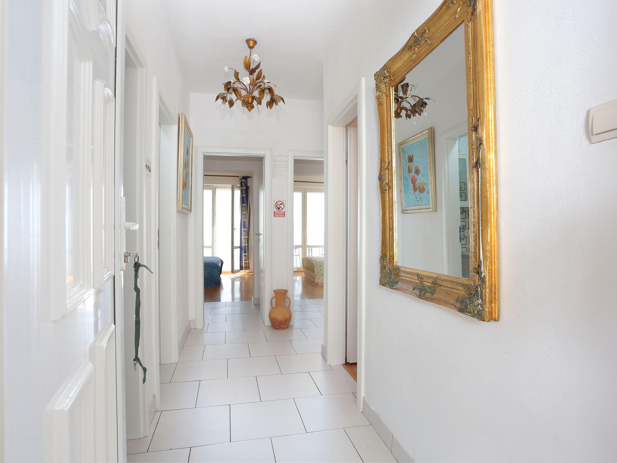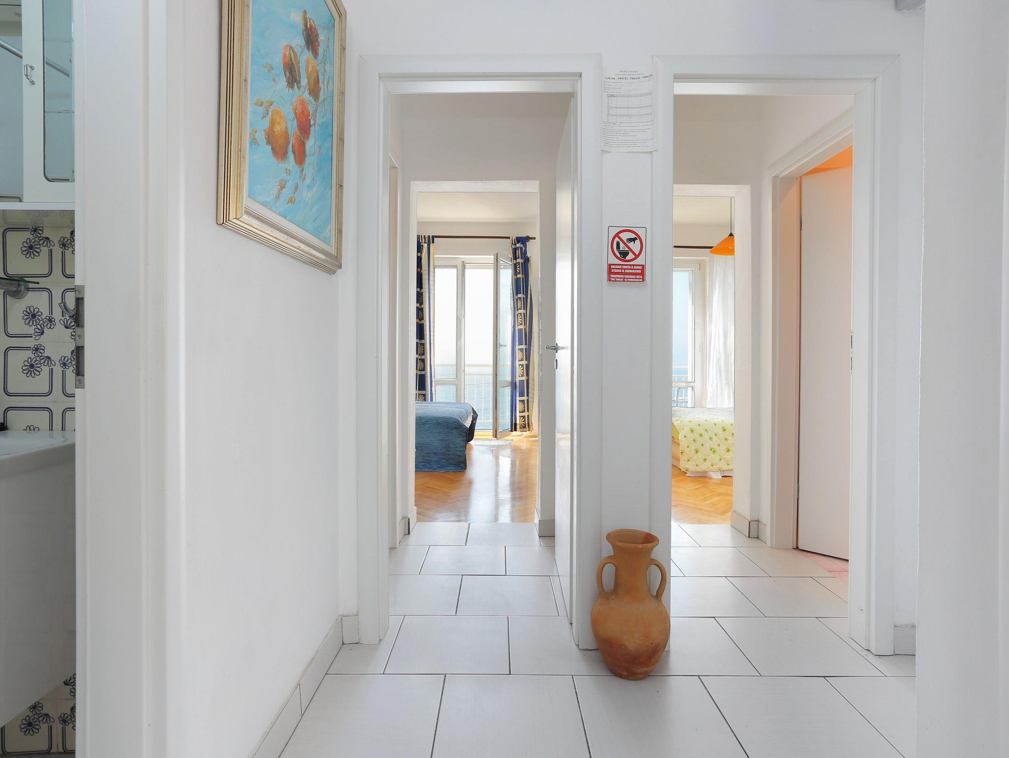 Ferienwohnung bietet Platz für 6 Gäste. Die Betten sind in Schlafzimmern, die es 3 gibt, innerhalb einer Gesamtfläche von 64m2, angeordnet. Die Gäste haben eine eigene Terrasse zur Verfügung, auf der sie in warmen Sommernächten genießen können. Das Apartment bietet Meerblick. Es ist erlaubt, Speisen auf dem Gemeinschafts-Grill vorzubereiten. In der Unterkunftseinheit besteht die Möglichkeit des Mitbringens von Haustieren gegen Aufpreis. IM PREIS INBEGRIFFEN: Kurtaxe, Endreinigung, Klimatisierung, Parkplatz, Bügeleisen, Bügelbrett, Föhn. VERBINDLICHE ZUSÄTZLICHE KOSTEN: Aufzahlung für Kurzaufenthalte (prozentualer Zuschlag pro Nächtigungsanzahl: 30% - 1, 20% - 2, 10% - 3). UNVERBINDLICHE ZUSÄTZLICHE KOSTEN: Wäschewaschen (5,00 € Waschen), Haustiere (15,00 € pro Nacht). Die Verfügbarkeit zusätzlicher Dienstleistungen in Ihrem reservierten Termin und die Preise derselben (falls nicht aufgeführt) müssen im Voraus überprüft werden. Zusätzliche Dienstleistungen die in der Zahlungsaufforderung nicht aufgeführt sind werden direkt beim Vermieter bezahlt, angenommen der Gast nutzt auch diese.