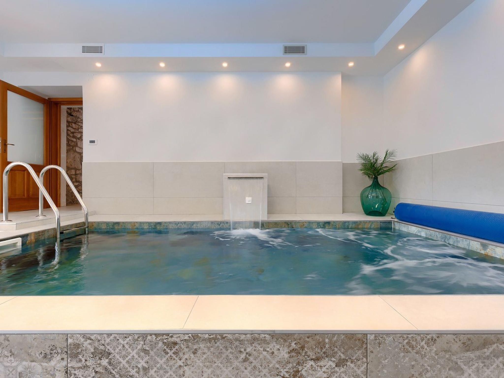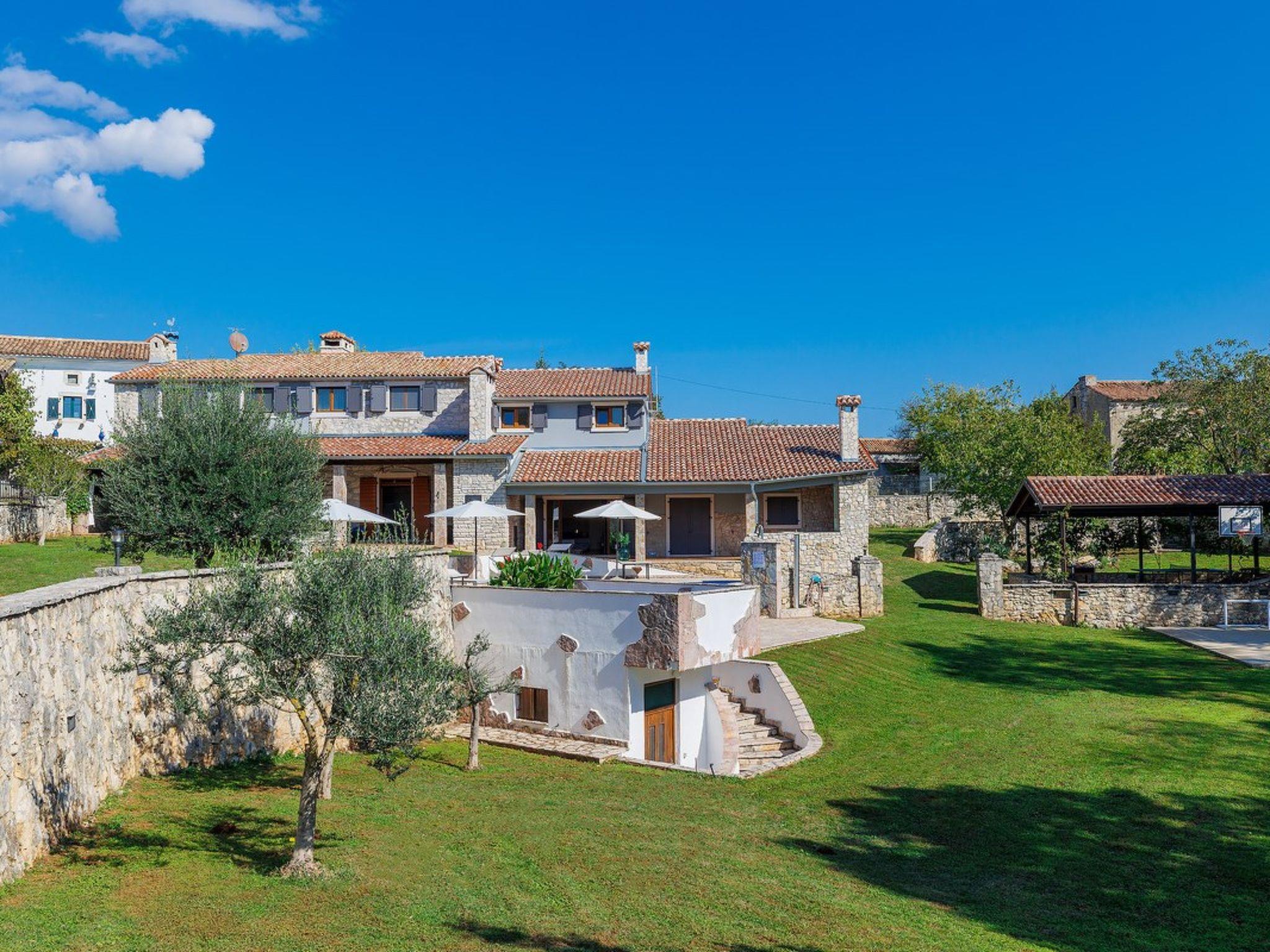 On three thousand and five hundred square feet of stonewall fenced plot lies the fabulous villa Jurazini. This villa in Labin was built on a private property that is decorated to impress - the beautiful lawn features a volleyball field, a football and basketball area, then here are the swings for the youngest, and plenty of room to play outdoors. Villa Jurazini in Labin is arranged on two floors - on the top there are six bedrooms and 3 bathrooms, while the ground floor features and 2 bathrooms, a spacious living room with kitchen and dining room made of wood, and with direct access to the sun terrace with swimming pool. All rooms are tiled, and the furniture is mostly made of wood. The exterior is dominated by the beautiful stone plates that adorn as many as four terraces, the pool and the bread oven, set next to the dining table on the covered terrace. Among other things, here you can play darts, table tennis and soccer, and enjoy all the comforts of a private accommodation with modern facilities. In addition to the outdoor private pool, there is also an indoor heated pool and a sauna available, you will certainly not miss anything in Villa Jurazini, all you have to do is enjoy yourself!