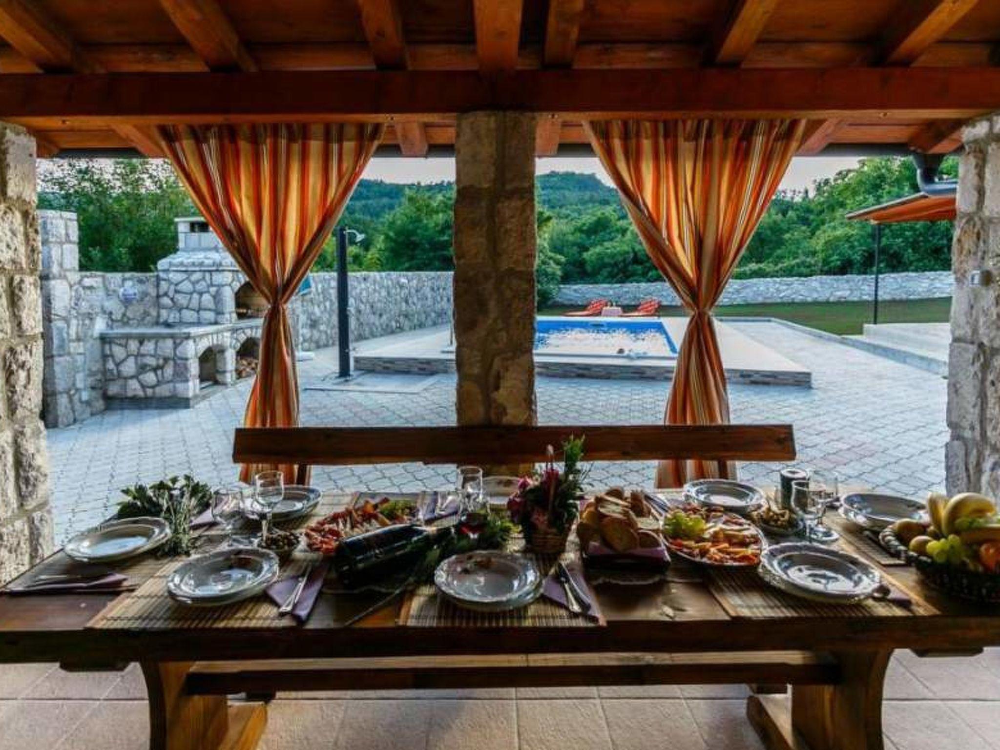Very nice stone house in the hinterland of Crikvenica that is only a few minutes by car from the popular holiday resort Crikvenica.With the 24 m² swimming pool in pure nature, it is preprogrammed that you will spend a relaxing holiday.The 800 m² property is protected from prying eyes and thus offers discretion and thus also protects the privacy that is necessary for a relaxing holiday.It is country-style with a Mediterranean charm. The 140 m² living space is fully air-conditioned and consists of 2 residential units. Each apartment has a separate entrance.Large apartmentThe large apartment has a fully equipped kitchen, a dining room with living area with a fireplace and a flat screen TV, 2 bedrooms and 2 bathrooms.Small apartmentIn this section there are 2 bedrooms and 2 bathrooms. One bedroom has a sleeping gallery.OutsideThe outside area in which you will probably spend the most time offers a terrace with a large wooden table, Hollywood swing, and the large (800 m²) walled garden. A large swimming pool with outdoor shower, brick grill with sink and utensils. There are also 6 wooden loungers with cushions, pavilion and lots of nice accessories. Nice view of the surrounding mountains / hills and the castle in Drvenik. In the yard in front of the house there is enough space for three cars.In addition, guests of this house have Internet, satellite / TV, washing machine, cot, high chair, iron & ironing board, grill and private parking spaces.Furnishing living area Living / dining room and kitchen are one room terrace tiling Satellite TV kitchen kitchen dishes Kitchen towels electric stove Cooking plates: 4 oven Fridge and freezer Coffee maker microwave Toaster dishwasher bedroom Double room with double bed, tiles Double room with double bed, tiles Double room with double bed, laminate Double room with double bed, laminate bathroom Bathroom with toilet, bath tub Bathroom with toilet, shower Bathroom with toilet, shower Bathroom with toilet, shower Balcony & terrace own balcony indoor seating Balcony size: 3 m² own terrace indoor seating Lie parasol Terrace size: 200 m² Further information Garden for use grill Bring a grill Parking on the property Swimming pool Swimming pool size: 24 m² Outdoor shower pets are not allowed heater Climate included in the price suitable for allergy sufferers Sheets available Towels available hairdryer Washing machine in the apartment Internet via WiFi safe